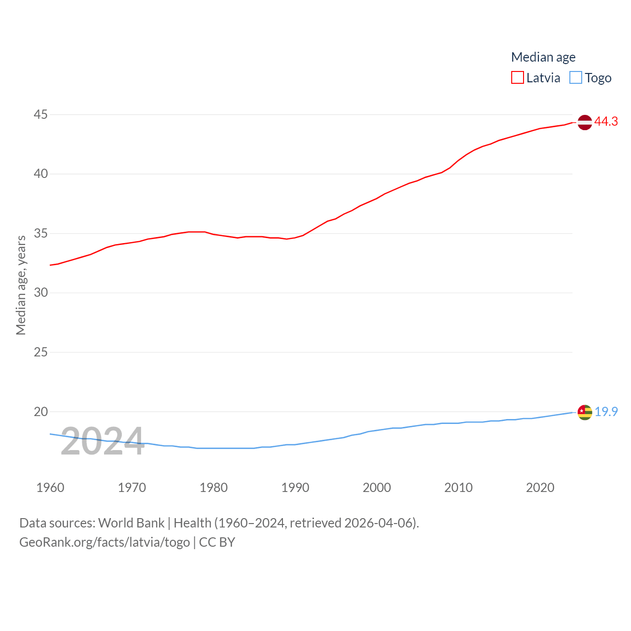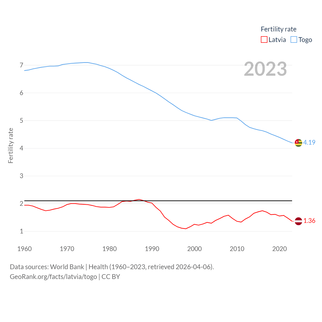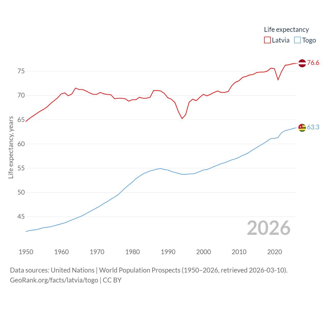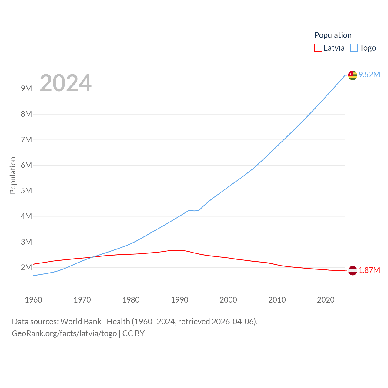 Latvia has a population of 1.87M (ranked 149/197), compared with 9.52M in Togo (ranked 98/197). Latvia's land area is 24,027 sq mi versus 21,000 sq mi for Togo (ranked 121st vs. 124th).