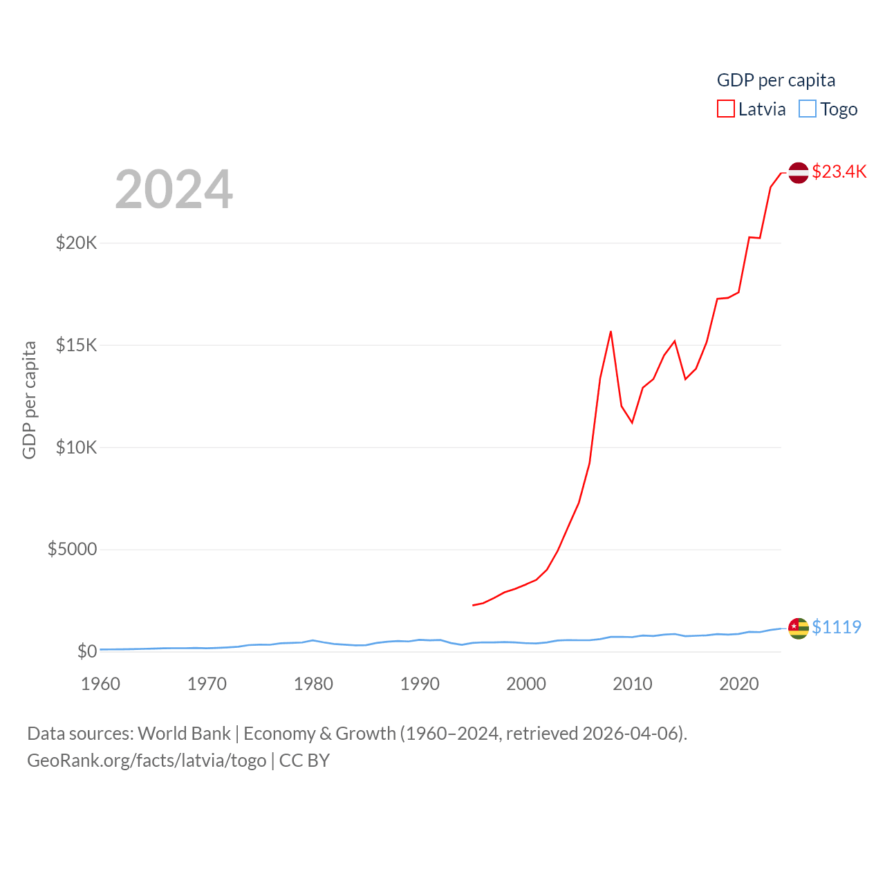 By GDP, Latvia ranks 99/197 ($43.7B) and Togo ranks 154/197 ($10.7B). By GDP per capita, Latvia ranks 54/197 ($23,409), while Togo ranks 172/197 ($1,119).