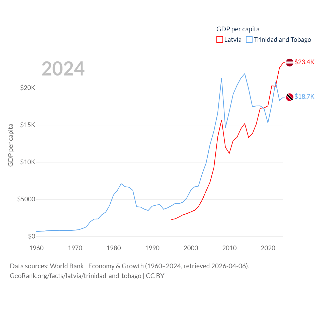 By GDP, Latvia ranks 99/197 ($43.7B) and Trinidad and Tobago ranks 115/197 ($25.6B). By GDP per capita, Latvia ranks 54/197 ($23,409), while Trinidad and Tobago ranks 61/197 ($18,733).