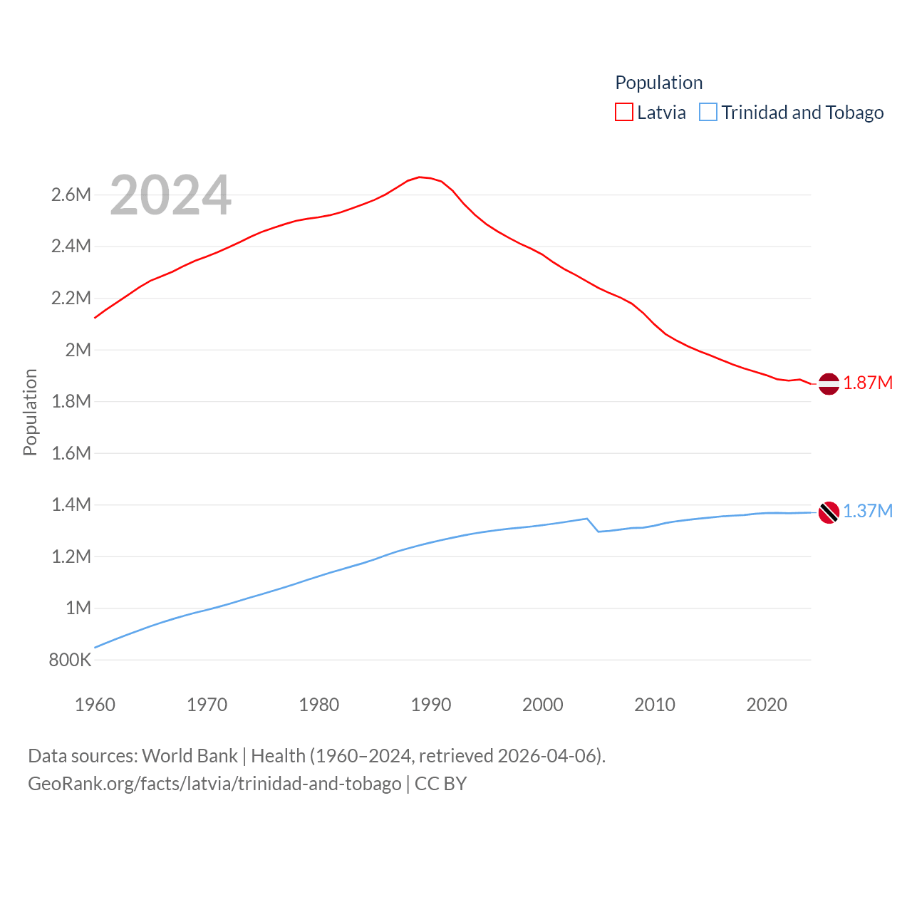 Latvia has a population of 1.87M (ranked 149/197), compared with 1.37M in Trinidad and Tobago (ranked 154/197). Latvia's land area is 24,027 sq mi versus 1,981 sq mi for Trinidad and Tobago (ranked 121st vs. 166th).