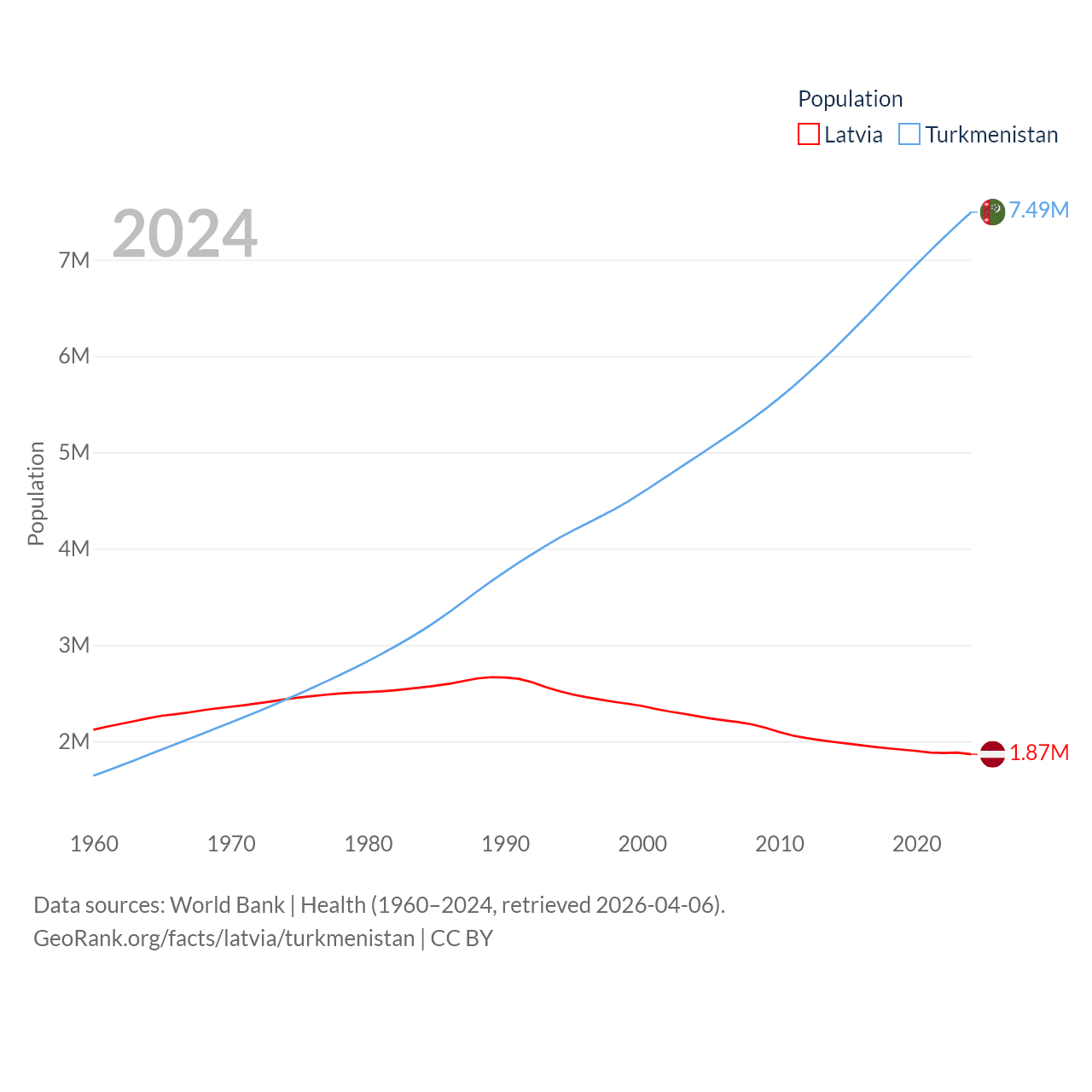Latvia has a population of 1.87M (ranked 149/197), compared with 7.49M in Turkmenistan (ranked 104/197). Latvia's land area is 24,027 sq mi versus 181,441 sq mi for Turkmenistan (ranked 121st vs. 53rd).