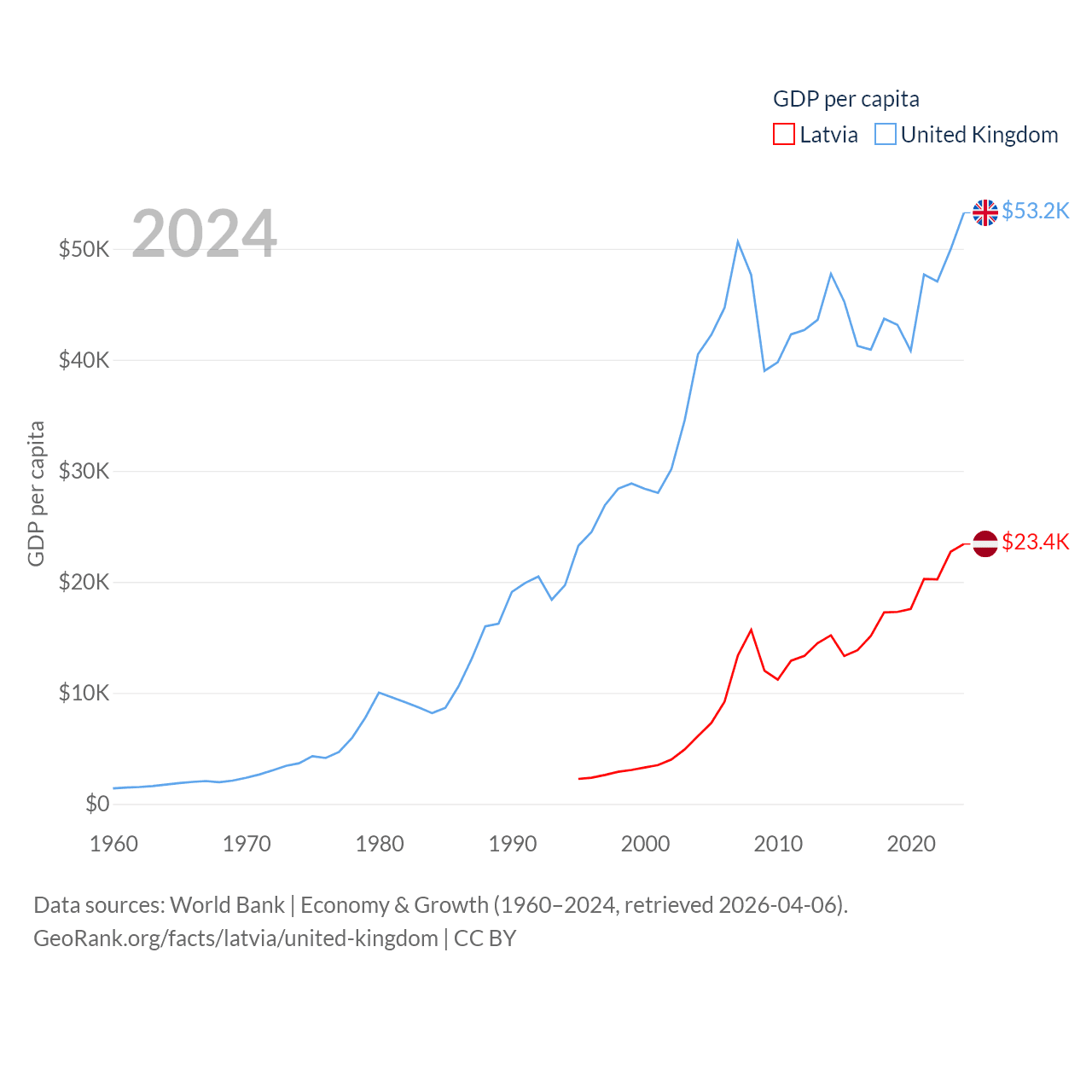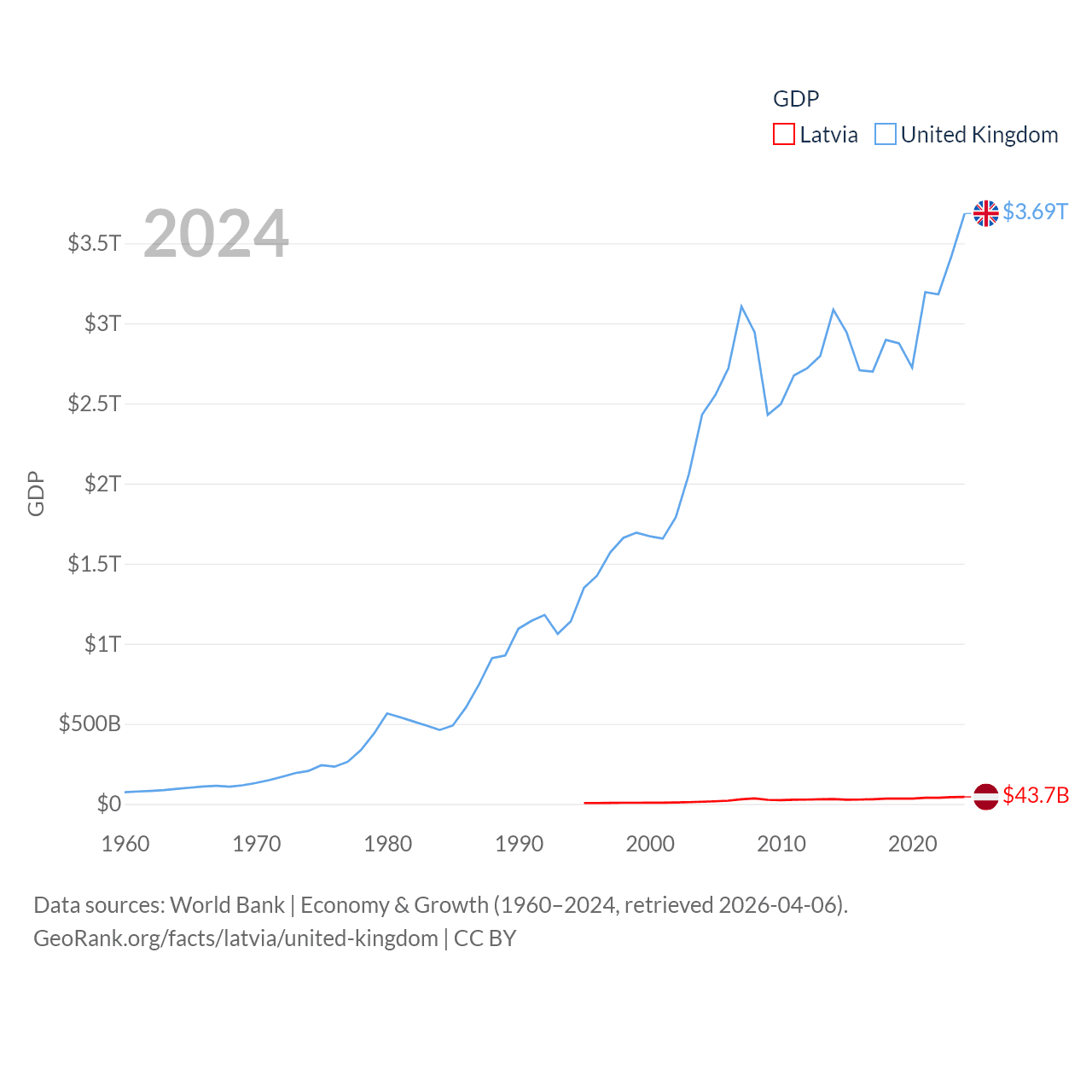 By GDP, Latvia ranks 99/197 ($43.7B) and The United Kingdom ranks 6/197 ($3.69T). By GDP per capita, Latvia ranks 54/197 ($23,409), while The United Kingdom ranks 22/197 ($53,246).