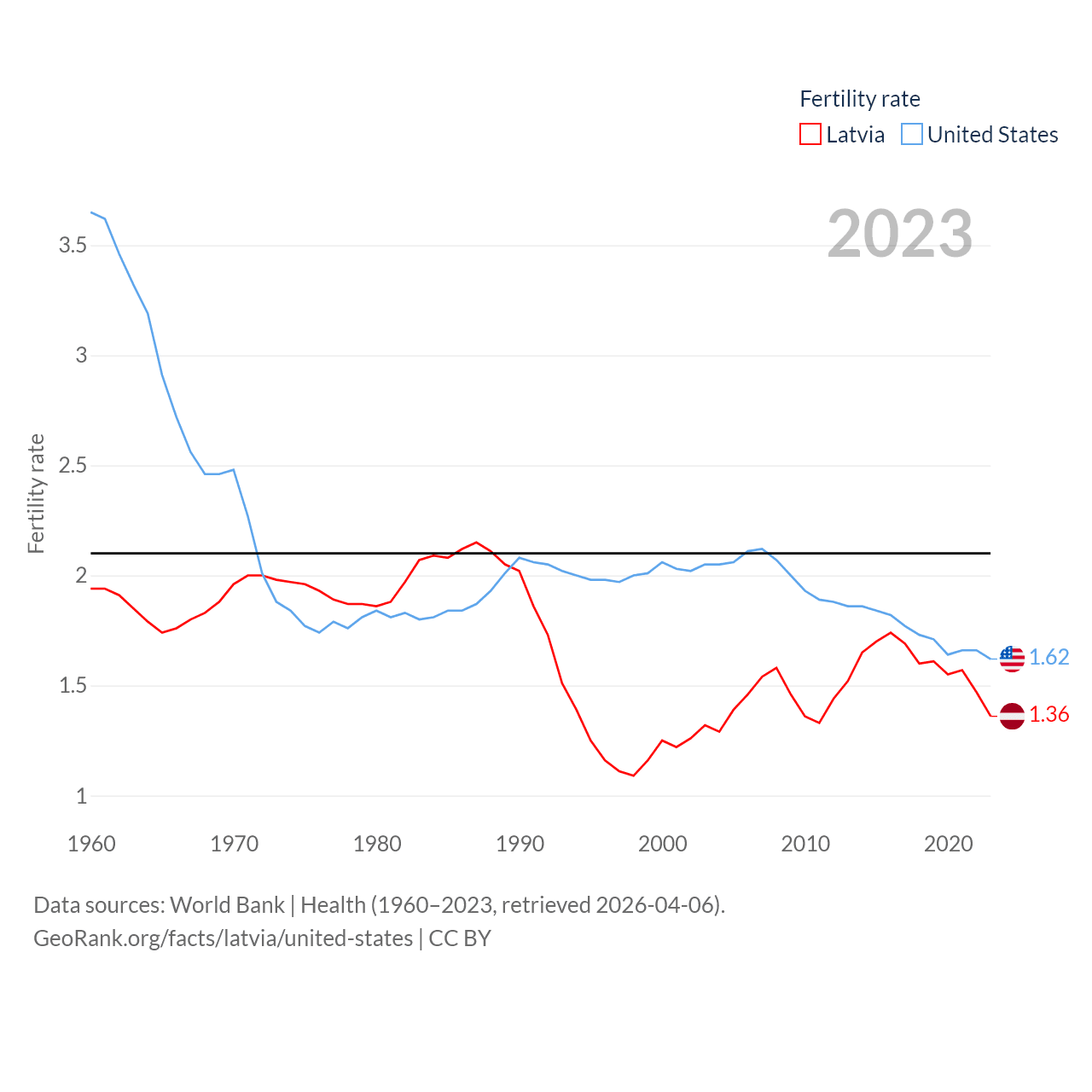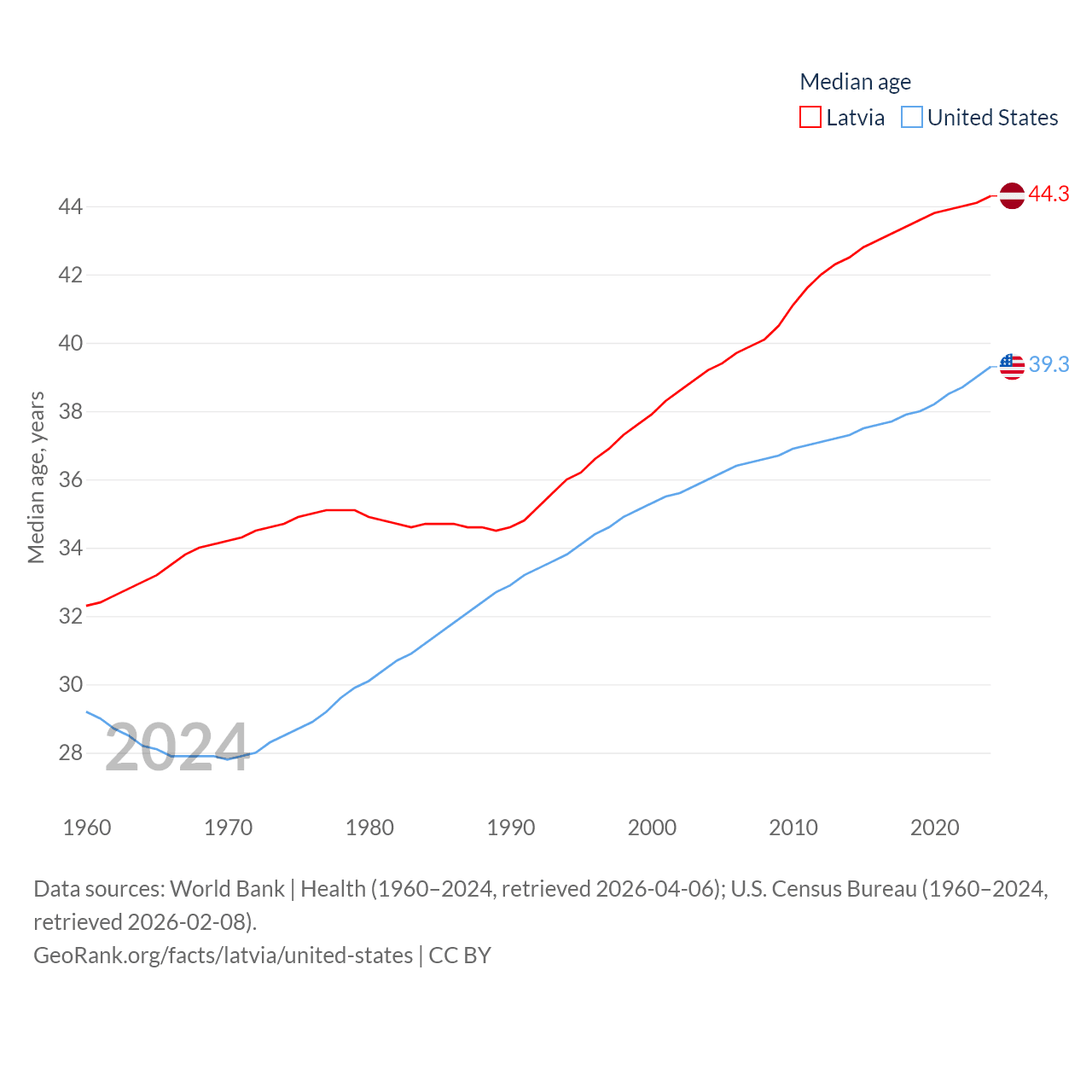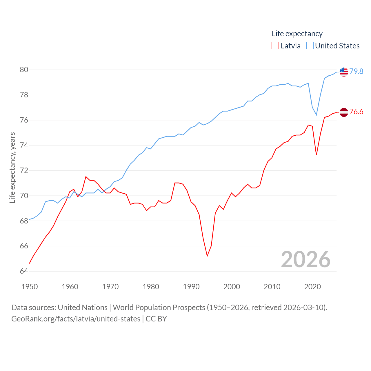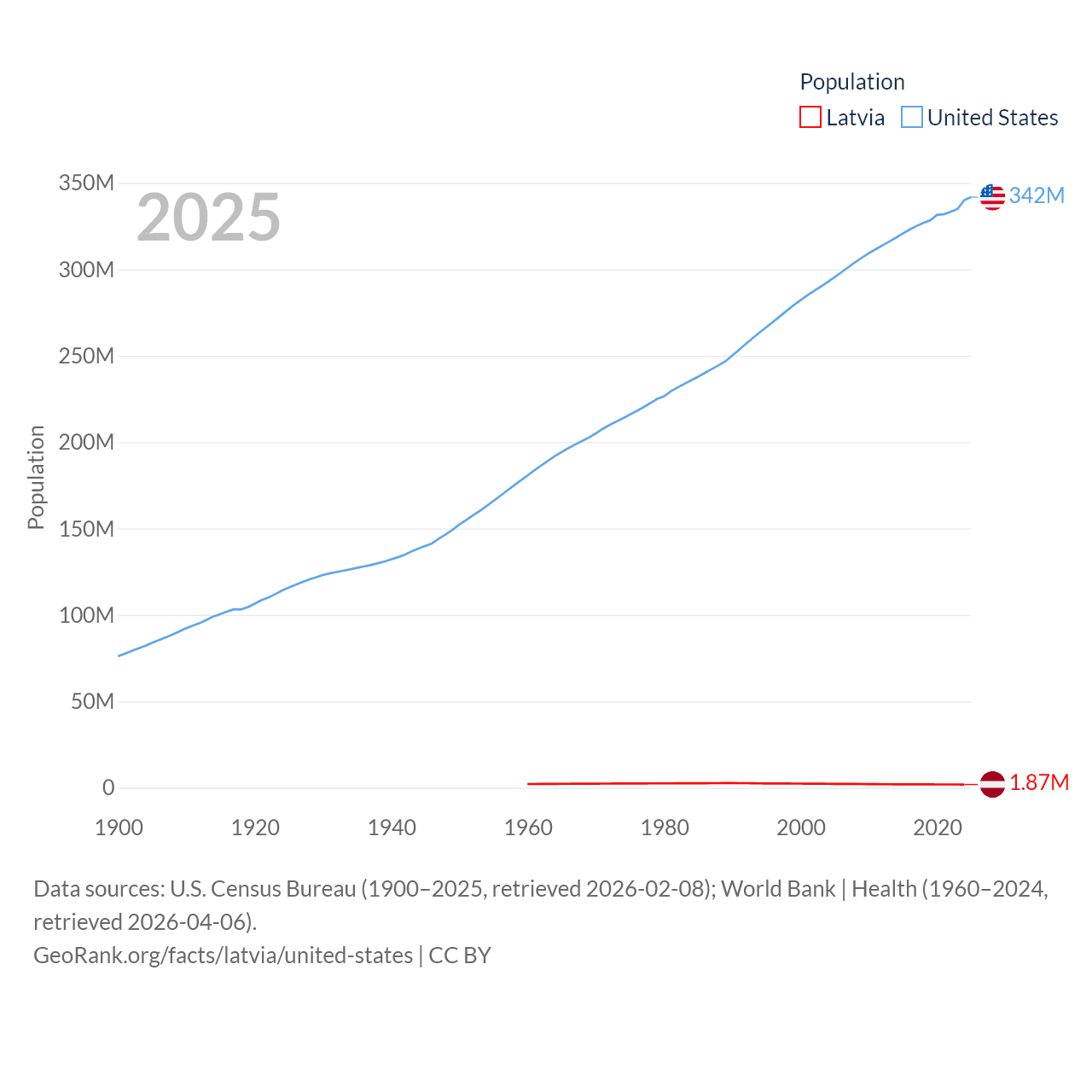 Latvia has a population of 1.87M (ranked 149/197), compared with 342M in The United States (ranked 3/197). Latvia's land area is 24,027 sq mi versus 3,531,839 sq mi for The United States (ranked 121st vs. 3rd).