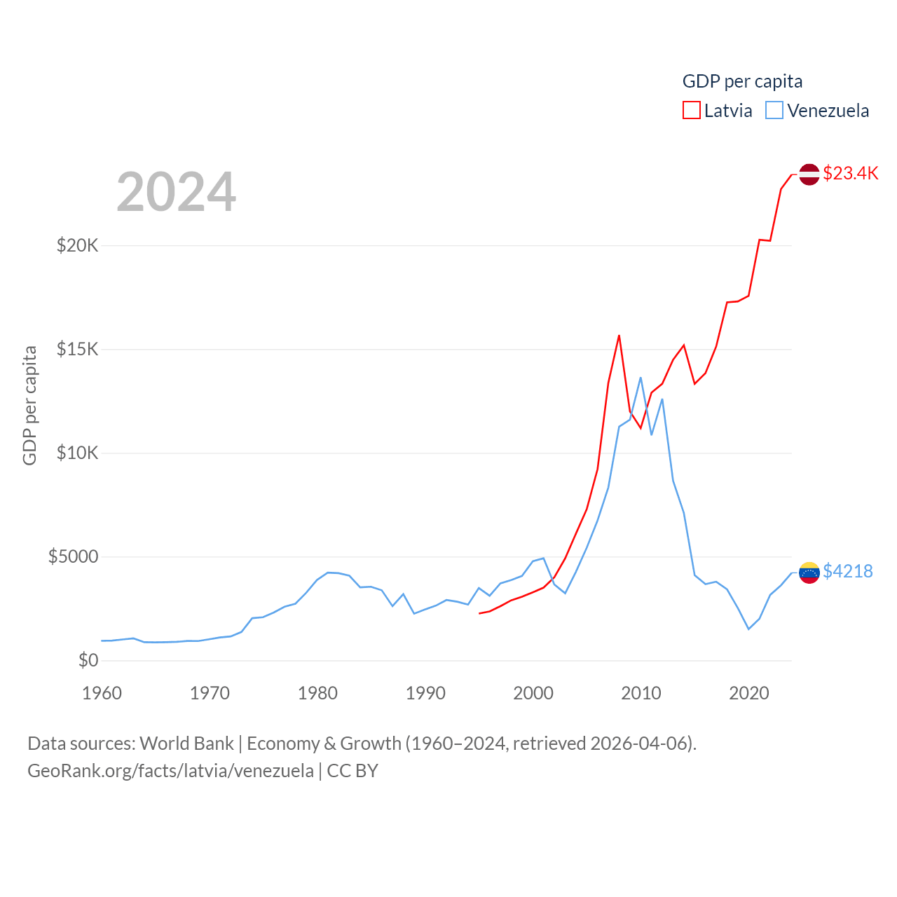 By GDP, Latvia ranks 99/197 ($43.7B) and Venezuela ranks 65/197 ($120B). By GDP per capita, Latvia ranks 54/197 ($23,409), while Venezuela ranks 128/197 ($4,218).