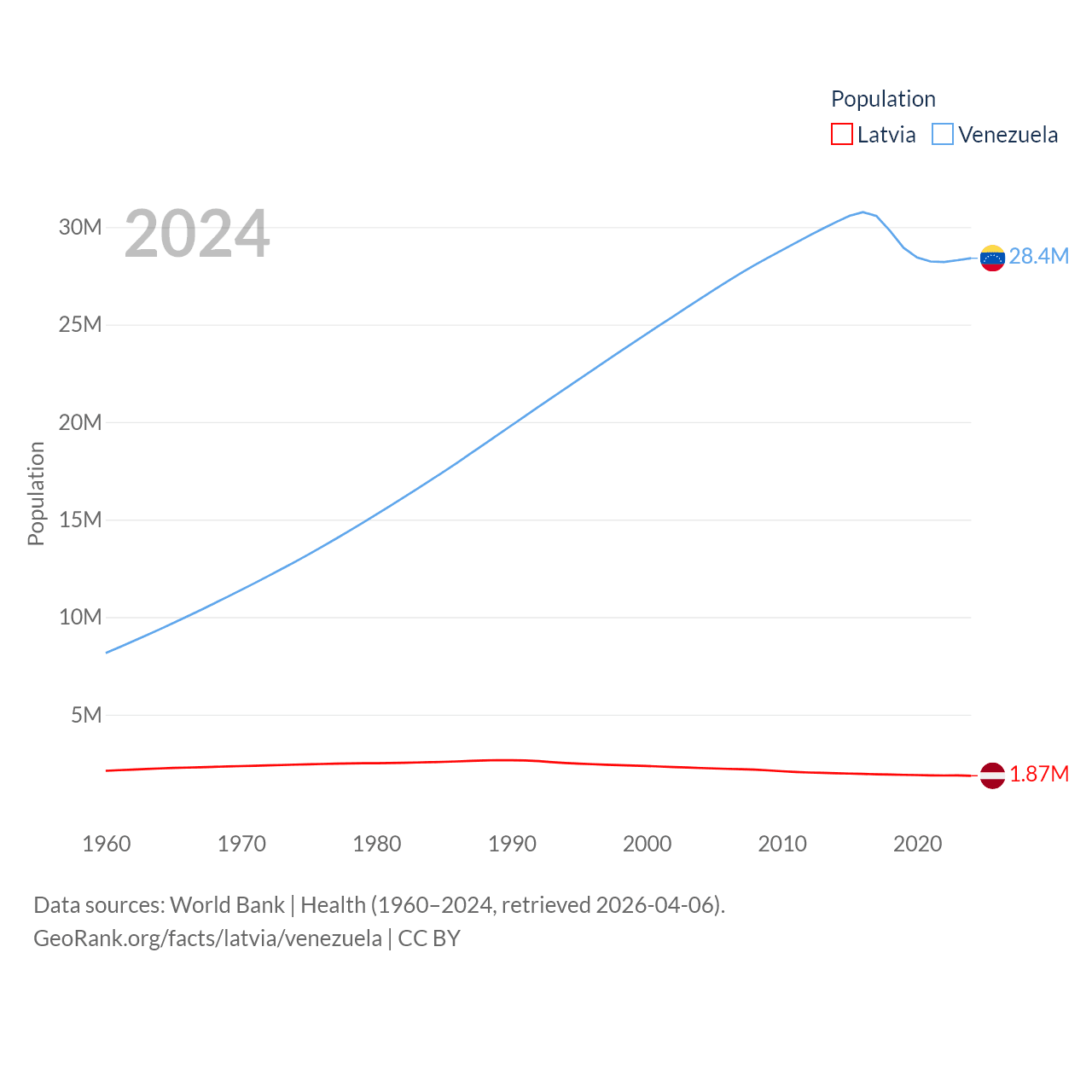Latvia has a population of 1.87M (ranked 149/197), compared with 28.4M in Venezuela (ranked 53/197). Latvia's land area is 24,027 sq mi versus 340,561 sq mi for Venezuela (ranked 121st vs. 32nd).