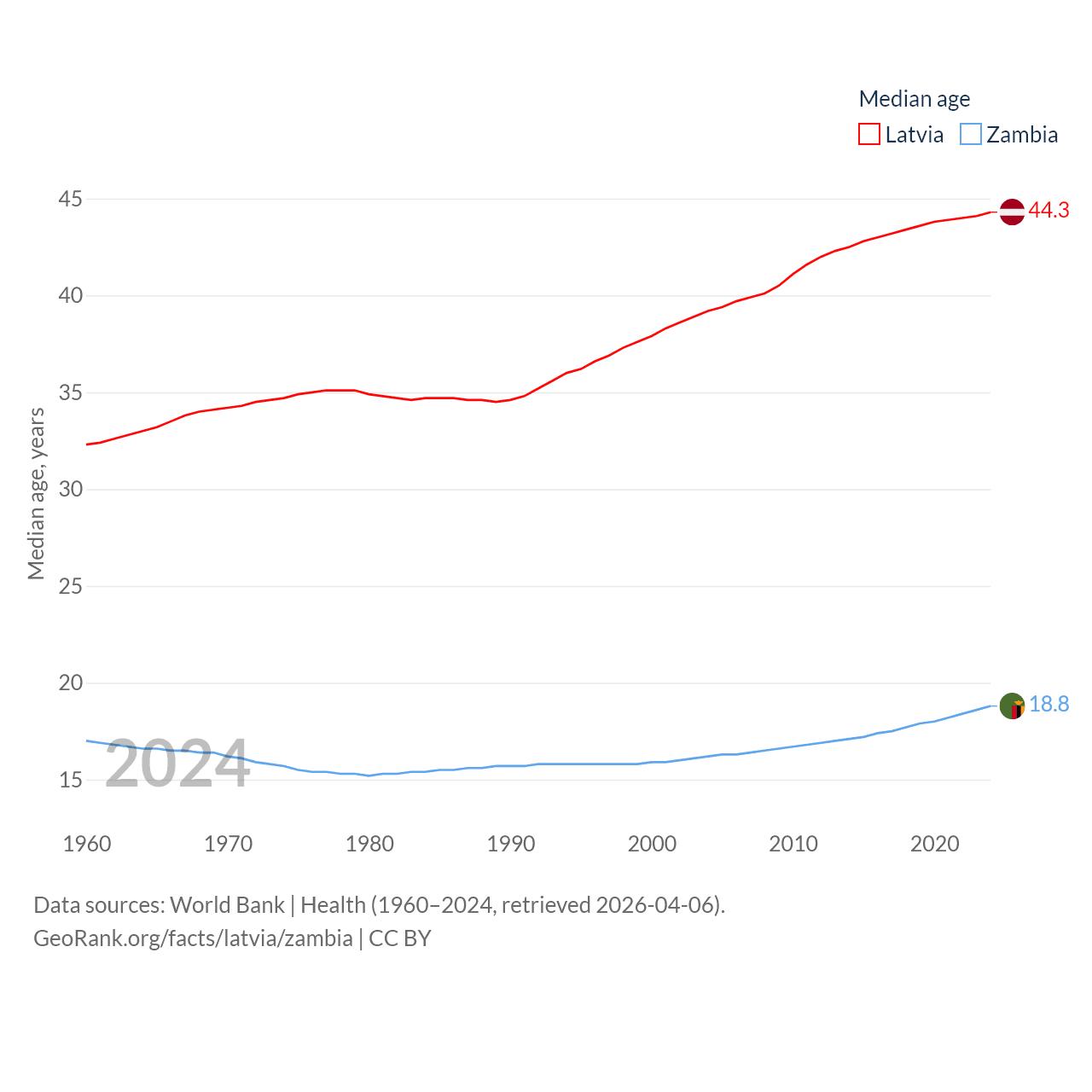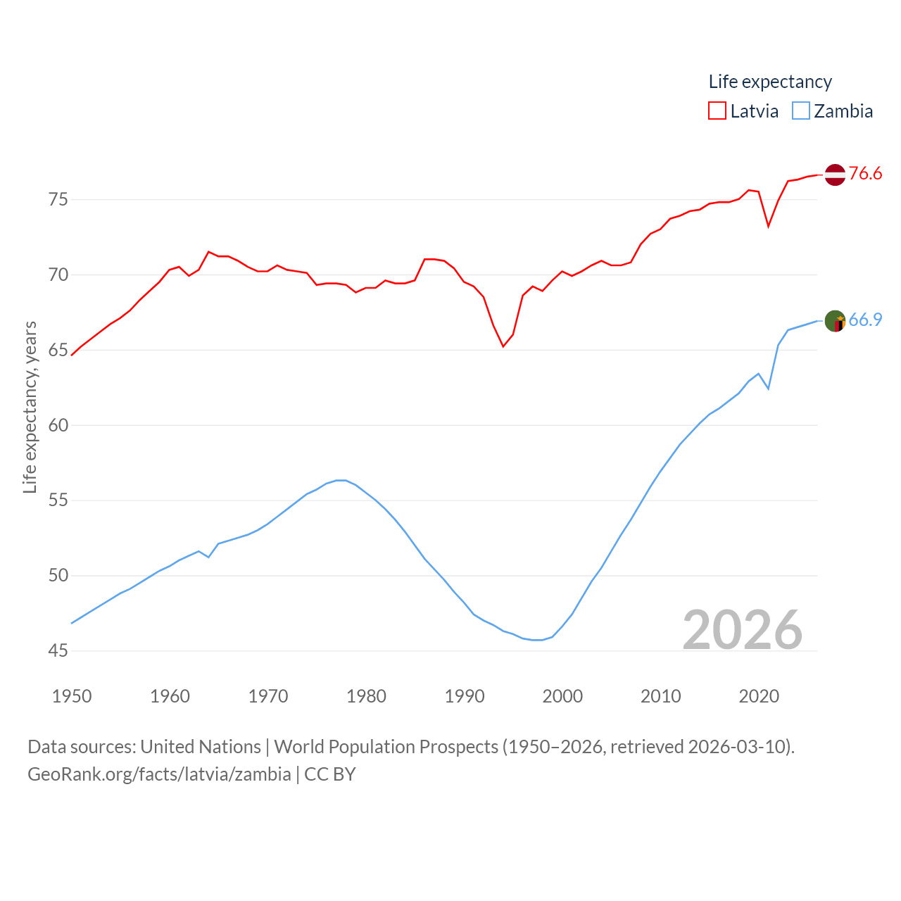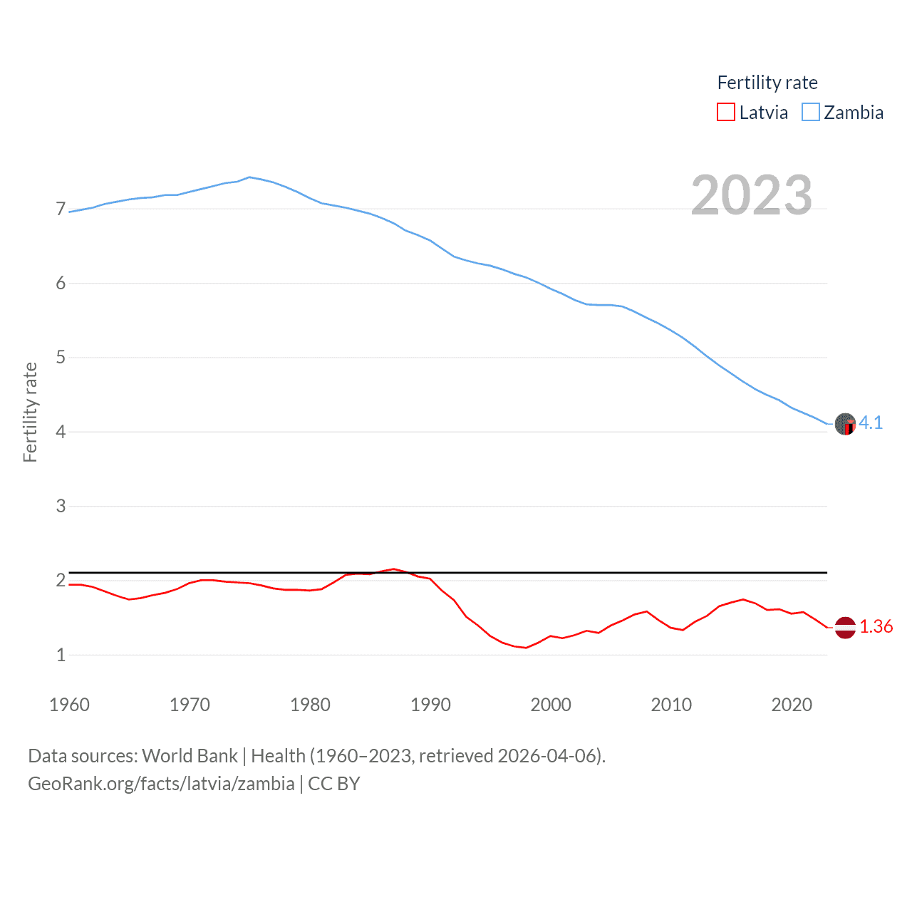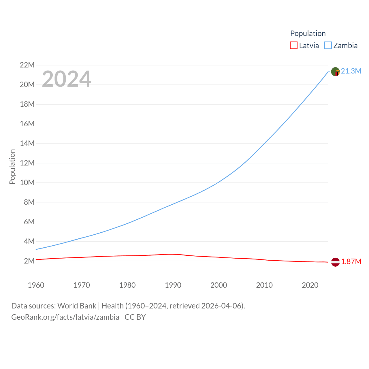 Latvia has a population of 1.87M (ranked 149/197), compared with 21.3M in Zambia (ranked 63/197). Latvia's land area is 24,027 sq mi versus 287,024 sq mi for Zambia (ranked 121st vs. 37th).