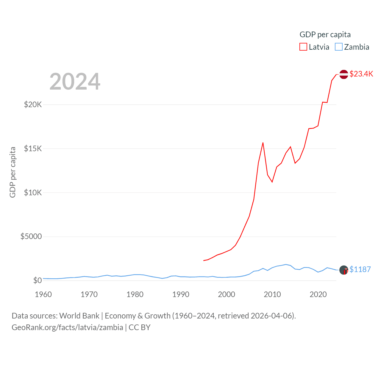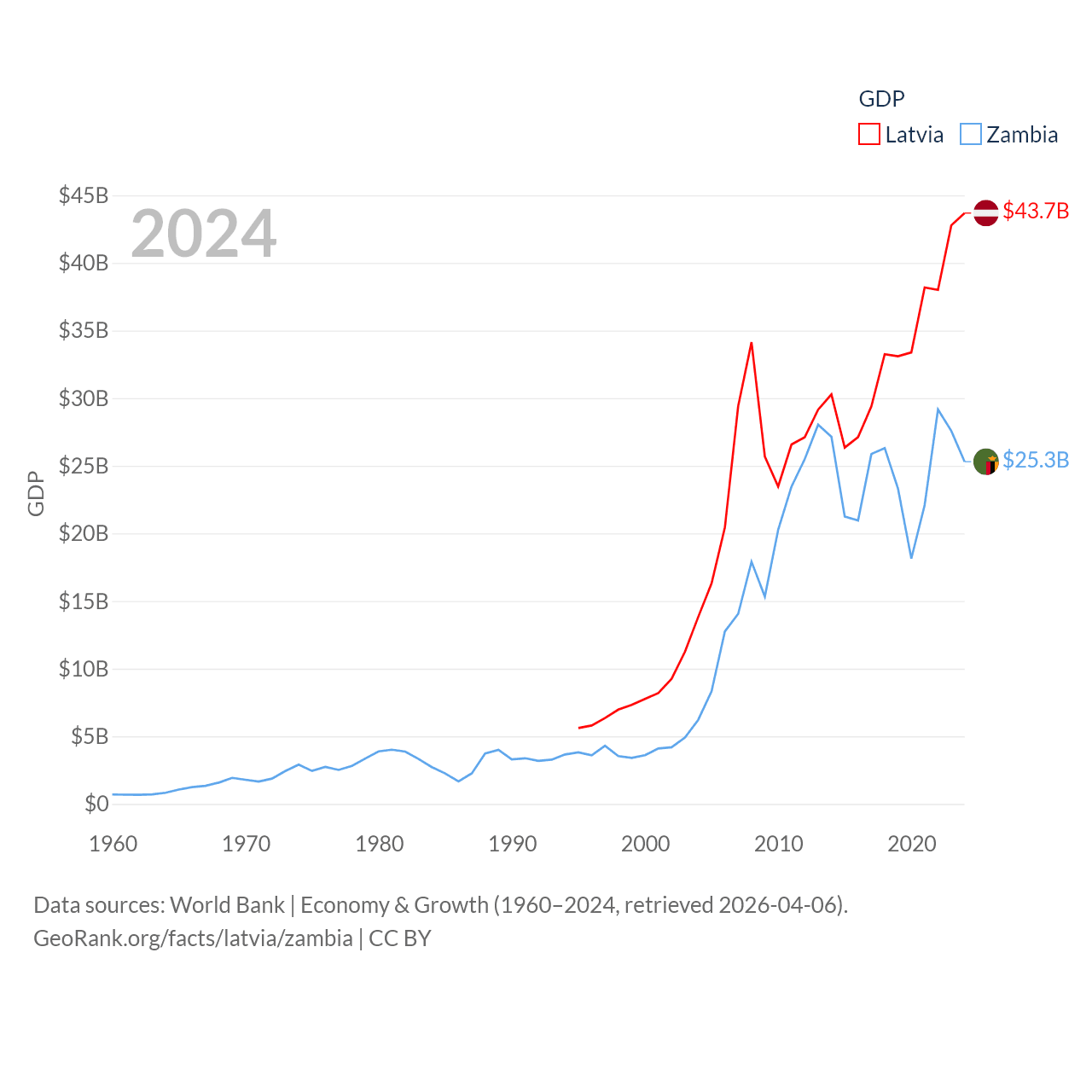 By GDP, Latvia ranks 99/197 ($43.7B) and Zambia ranks 116/197 ($25.3B). By GDP per capita, Latvia ranks 54/197 ($23,409), while Zambia ranks 169/197 ($1,187).