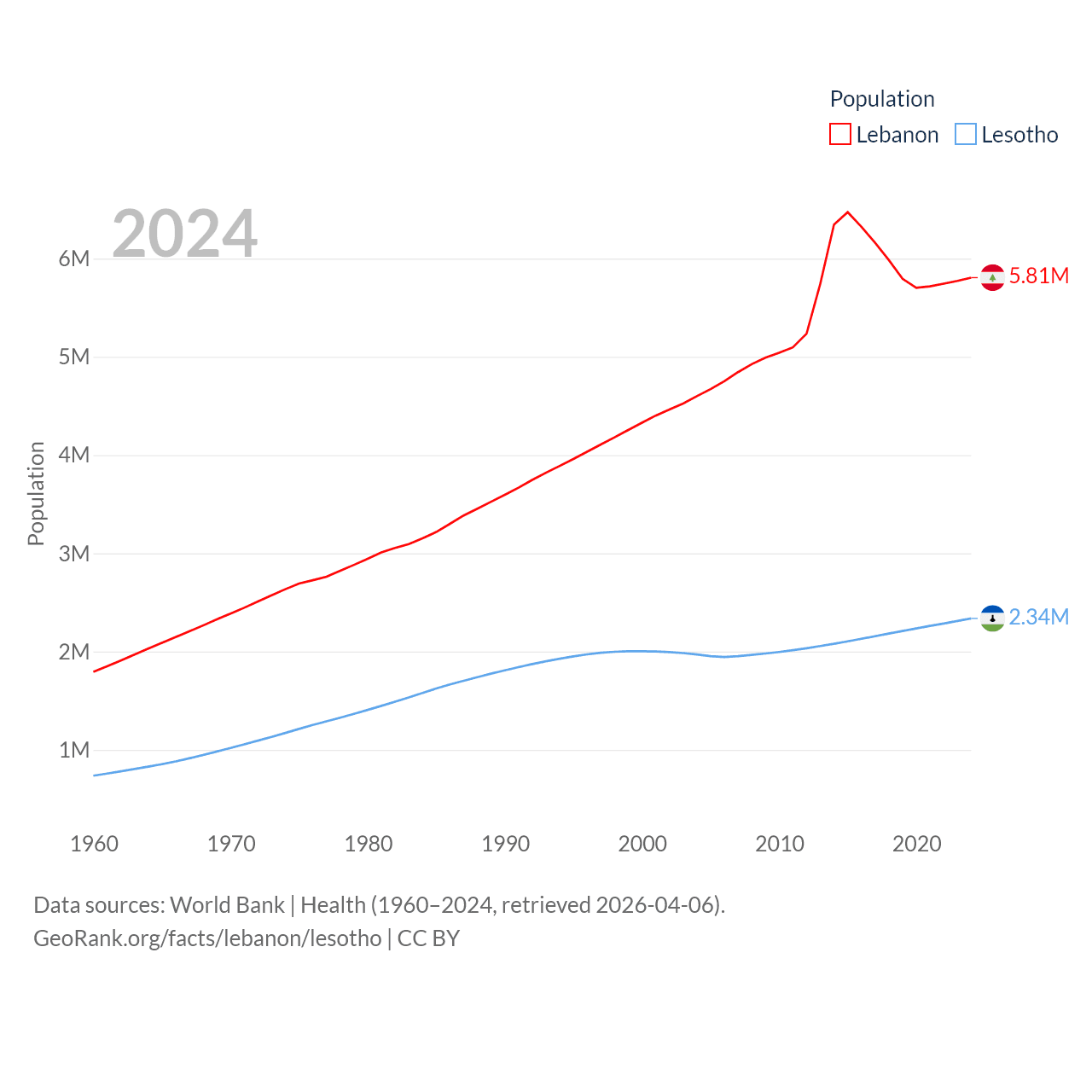 Lebanon has a population of 5.81M (ranked 115/197), compared with 2.34M in Lesotho (ranked 145/197). Lebanon's land area is 3,950 sq mi versus 11,722 sq mi for Lesotho (ranked 160th vs. 137th).