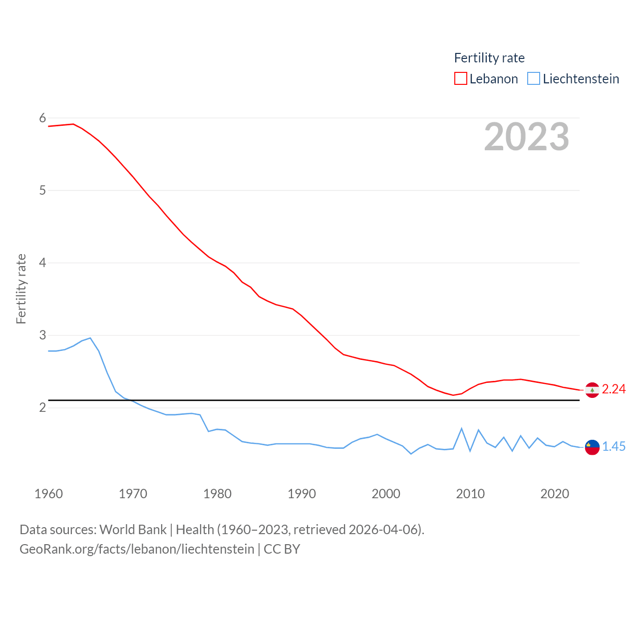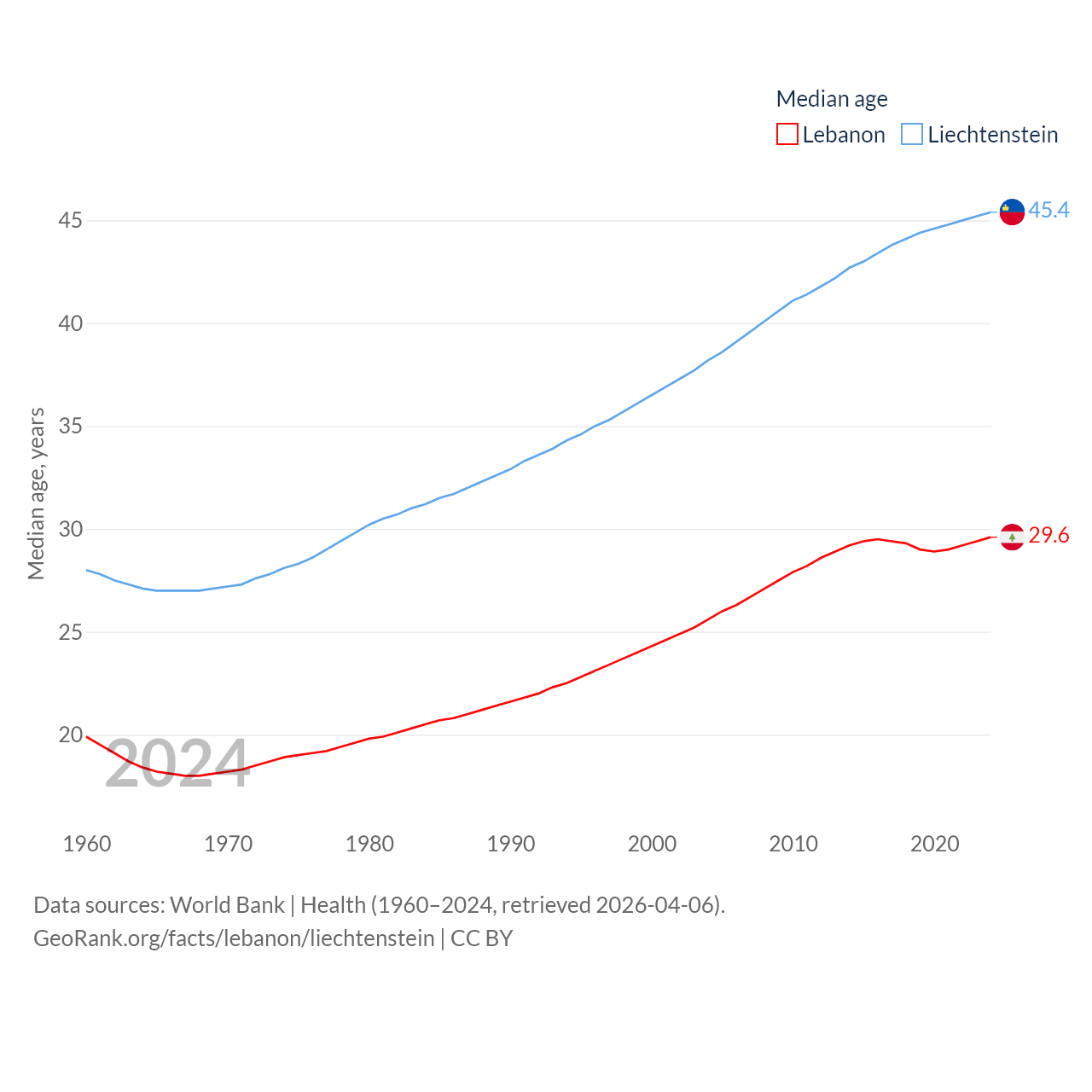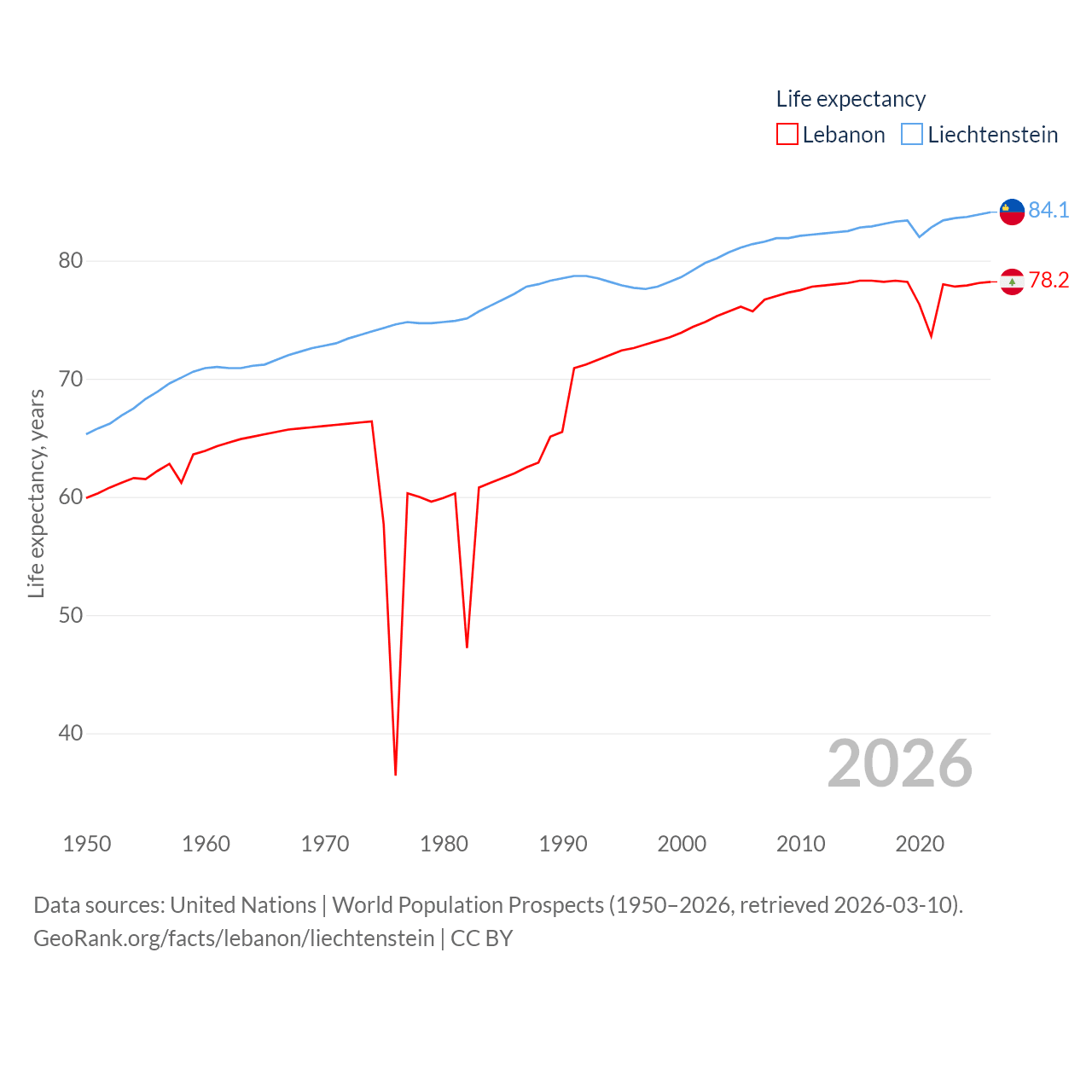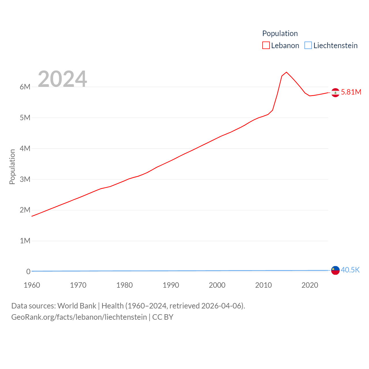 Lebanon has a population of 5.81M (ranked 115/197), compared with 40.4K in Liechtenstein (ranked 190/197). Lebanon's land area is 3,950 sq mi versus 61.8 sq mi for Liechtenstein (ranked 160th vs. 192nd).