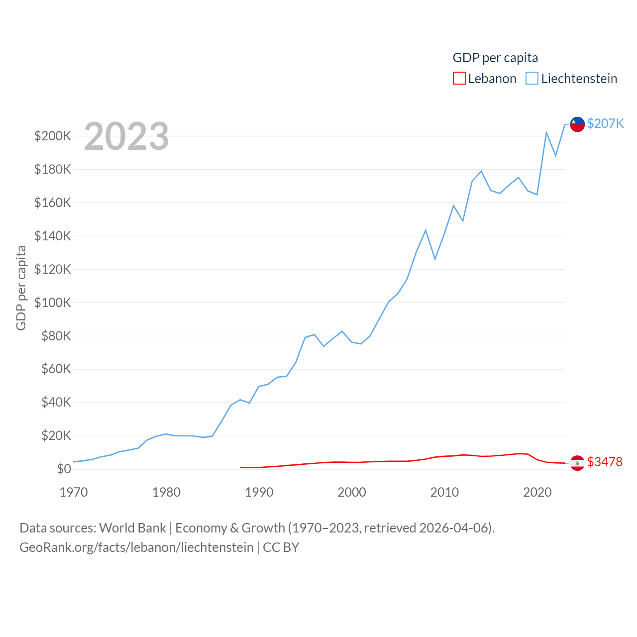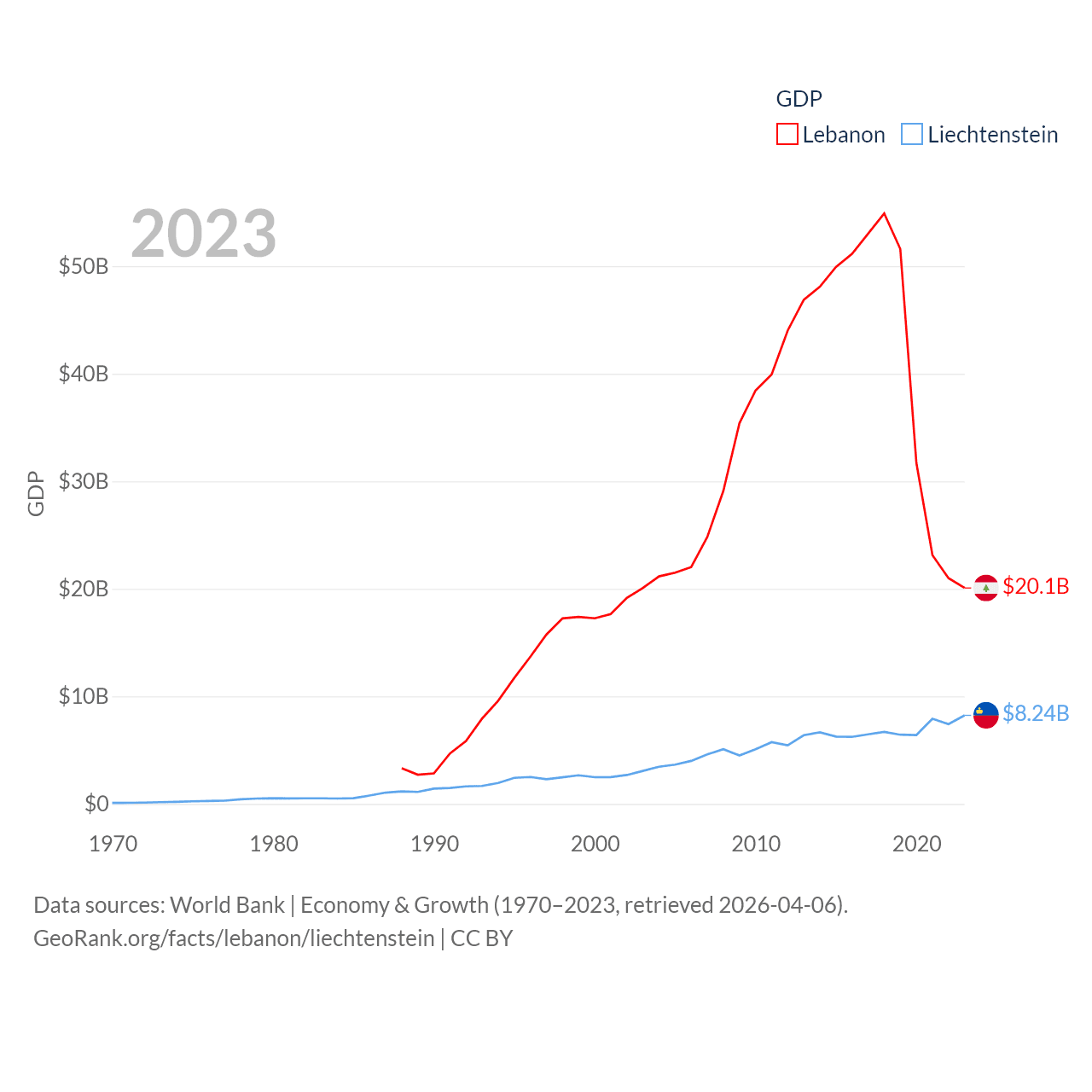 By GDP, Lebanon ranks 128/197 ($20.1B) and Liechtenstein ranks 156/197 ($8.24B). By GDP per capita, Lebanon ranks 135/197 ($3,478), while Liechtenstein ranks 2/197 ($206,781).