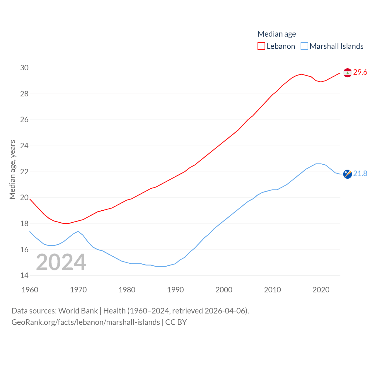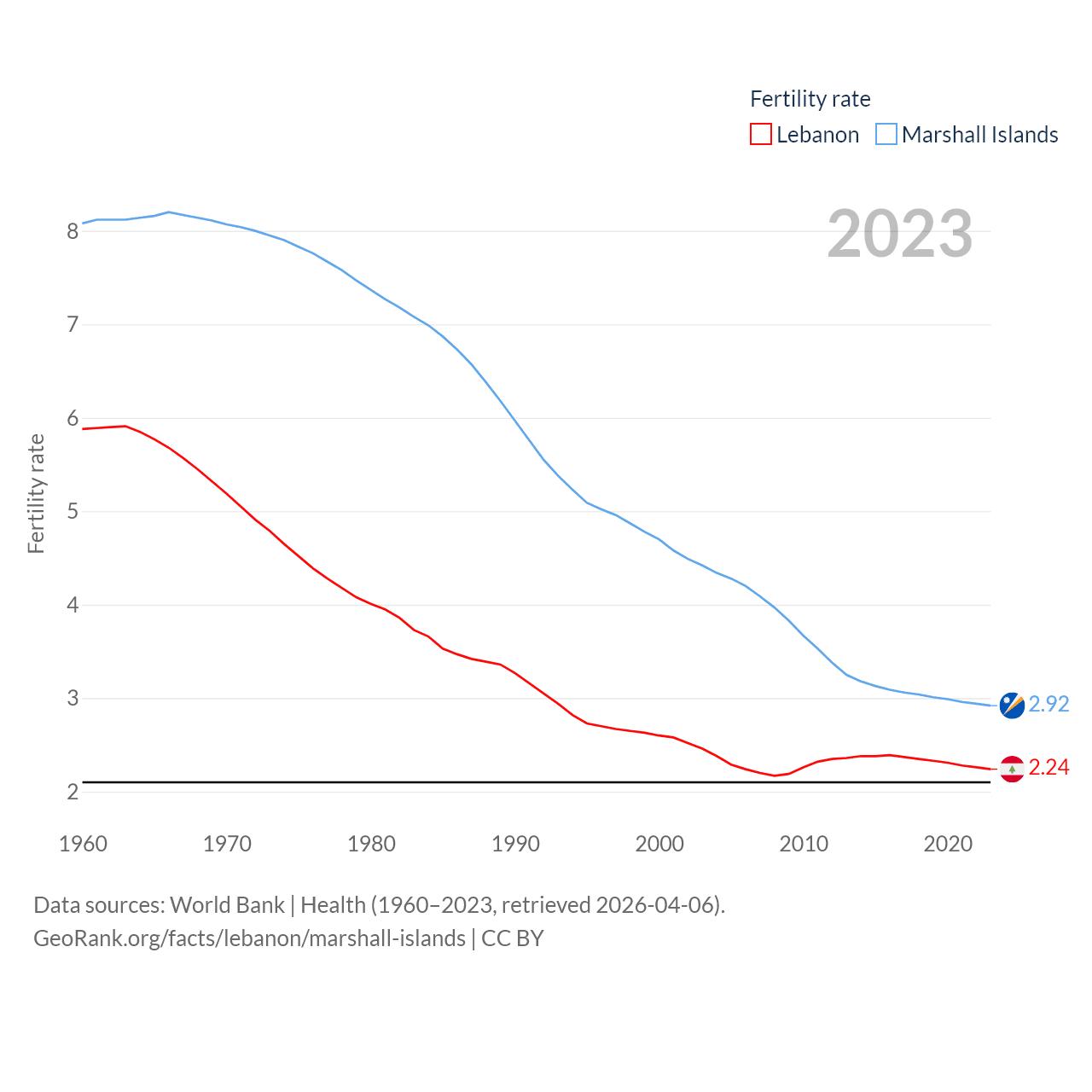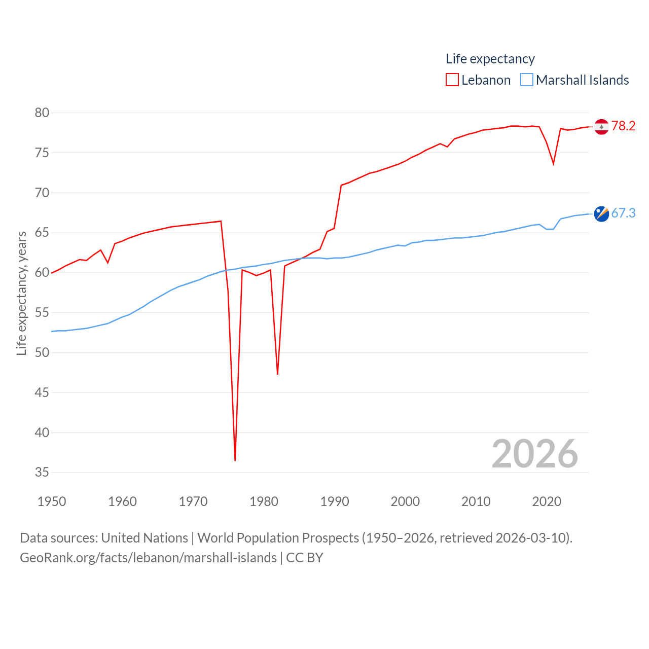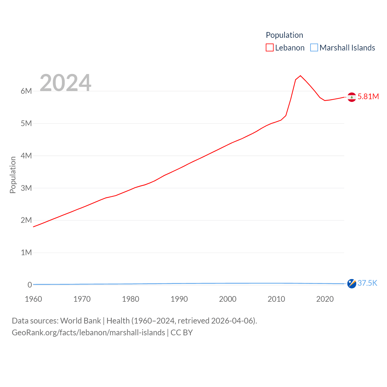 Lebanon has a population of 5.81M (ranked 115/197), compared with 37.5K in The Marshall Islands (ranked 192/197). Lebanon's land area is 3,950 sq mi versus 69.5 sq mi for The Marshall Islands (ranked 160th vs. 191st).