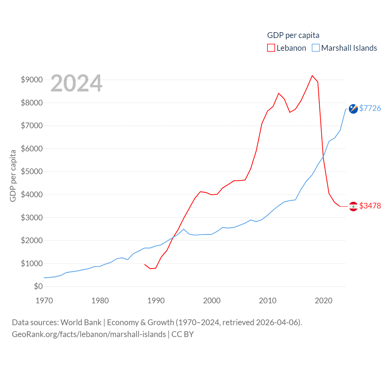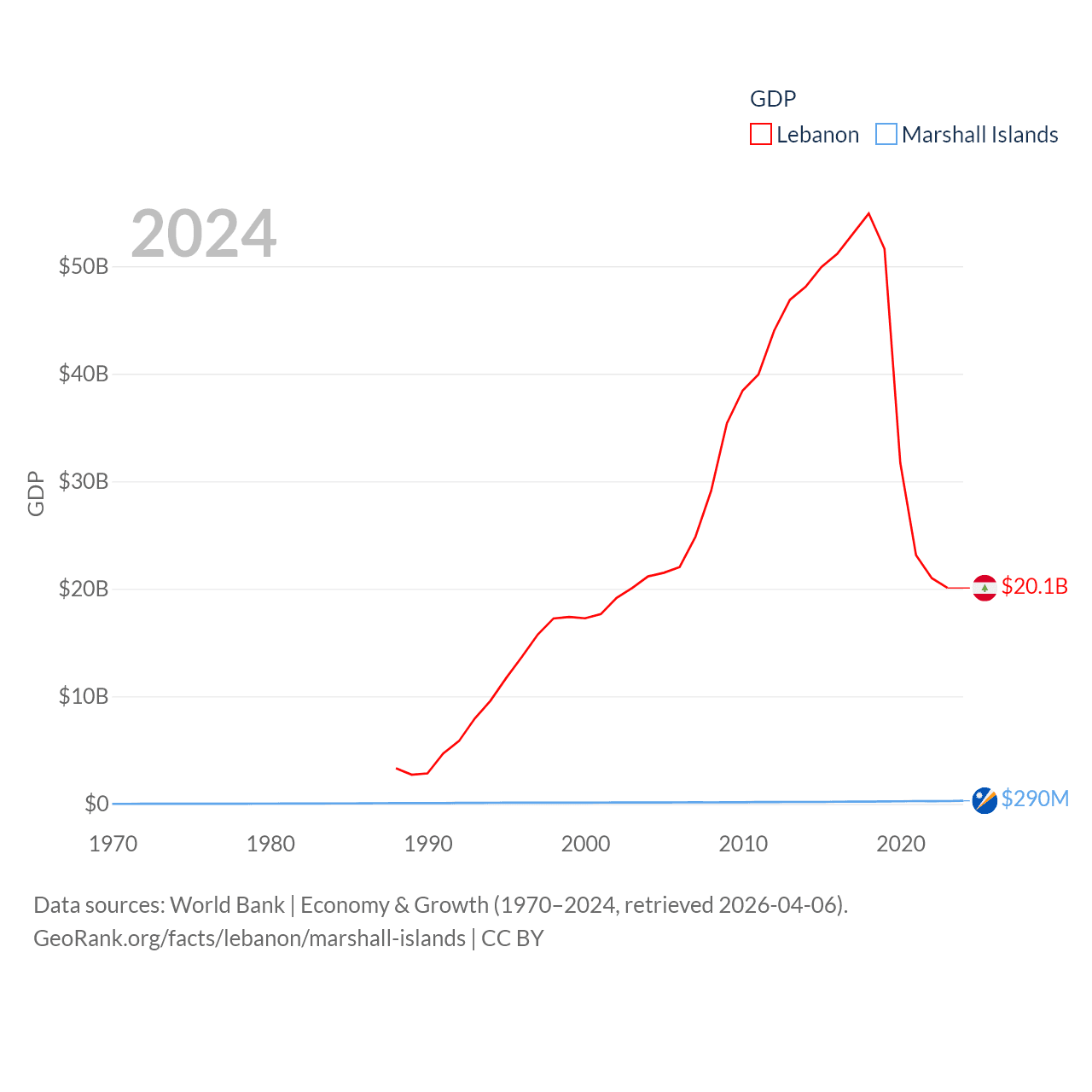 By GDP, Lebanon ranks 128/197 ($20.1B) and The Marshall Islands ranks 193/197 ($290M). By GDP per capita, Lebanon ranks 135/197 ($3,478), while The Marshall Islands ranks 96/197 ($7,726).