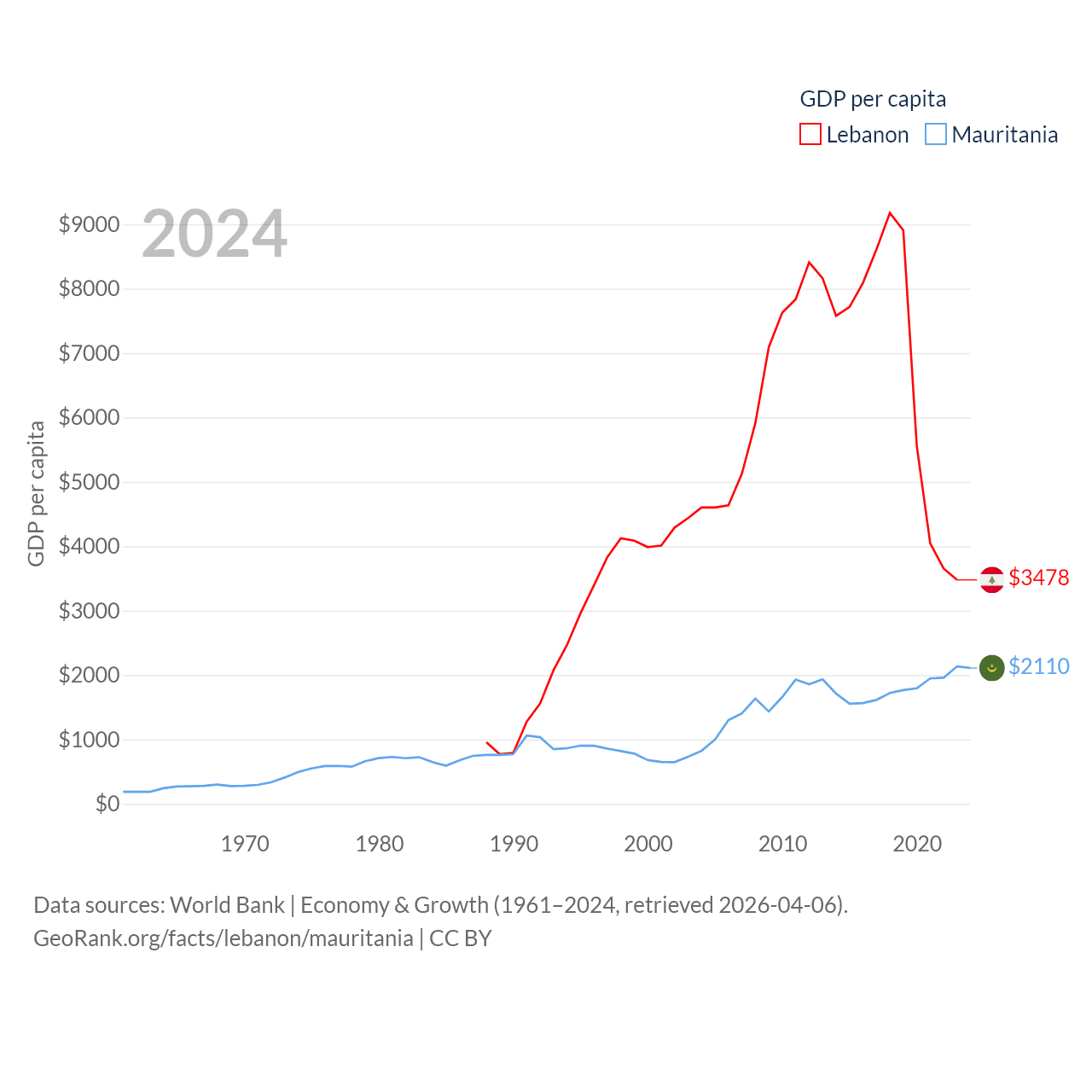 By GDP, Lebanon ranks 128/197 ($20.1B) and Mauritania ranks 153/197 ($10.9B). By GDP per capita, Lebanon ranks 135/197 ($3,478), while Mauritania ranks 156/197 ($2,110).