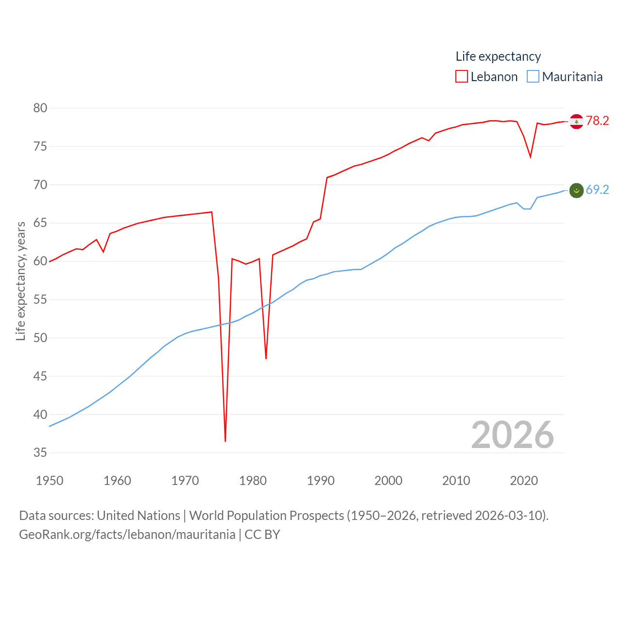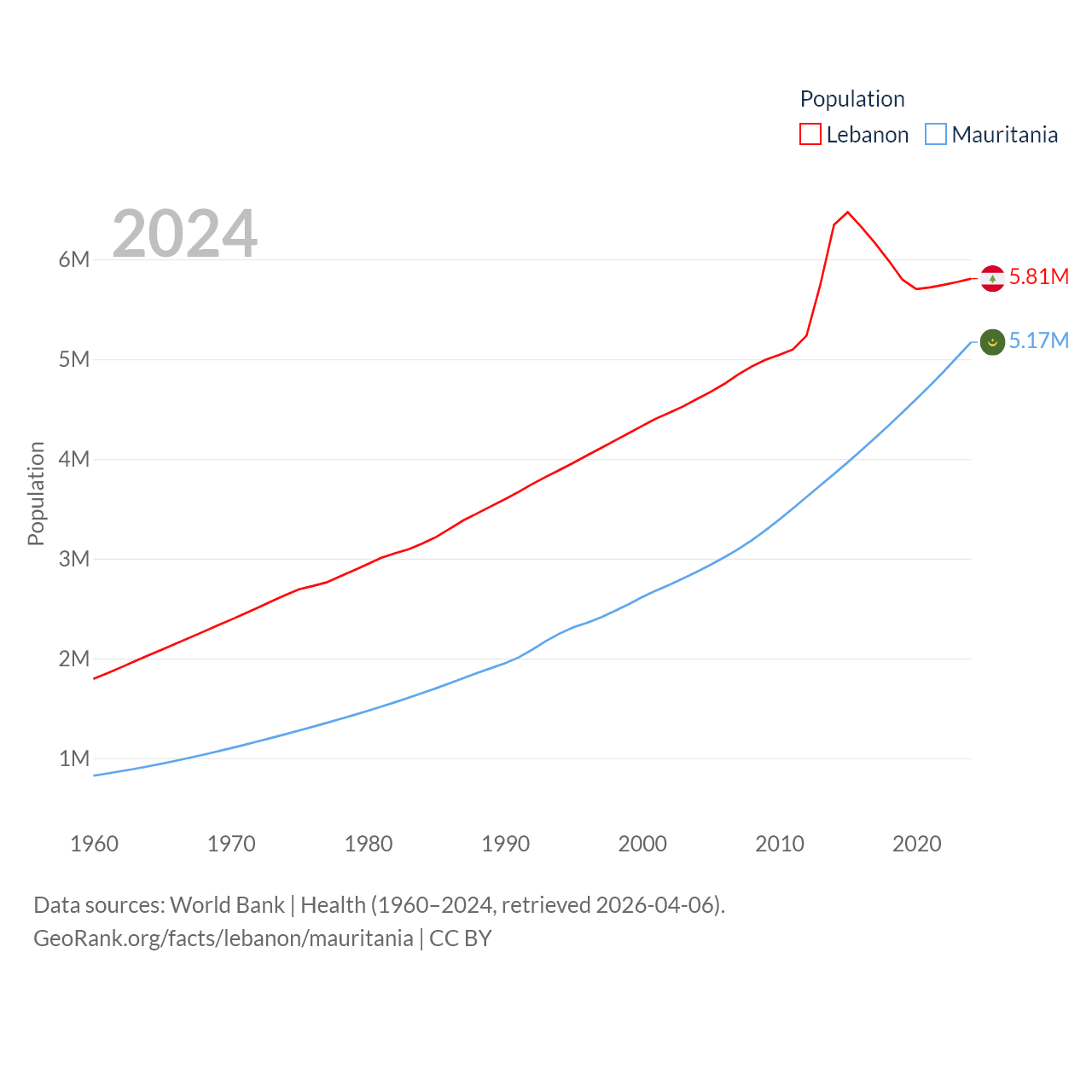 Lebanon has a population of 5.81M (ranked 115/197), compared with 5.17M in Mauritania (ranked 125/197). Lebanon's land area is 3,950 sq mi versus 397,955 sq mi for Mauritania (ranked 160th vs. 28th).