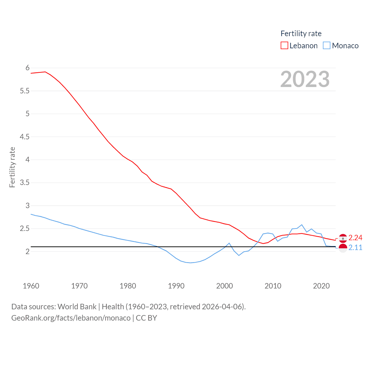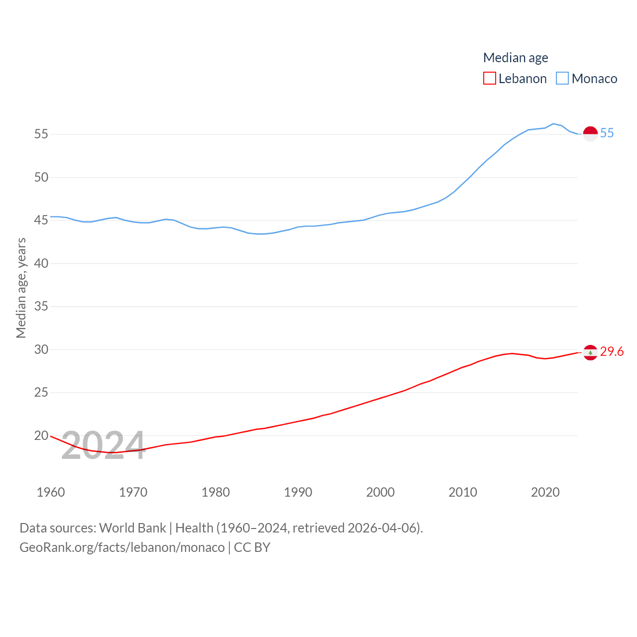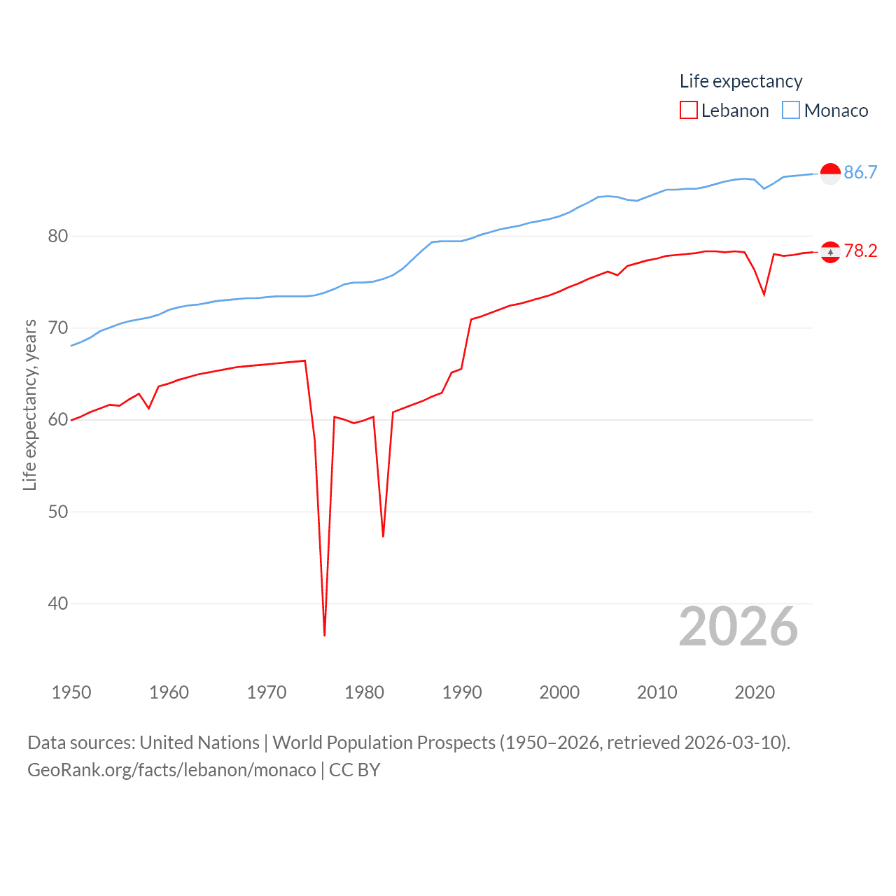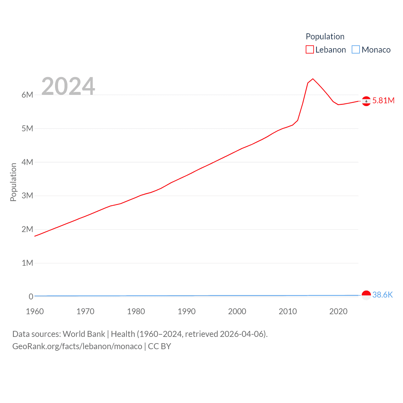Lebanon has a population of 5.81M (ranked 115/197), compared with 38.6K in Monaco (ranked 191/197). Lebanon's land area is 3,950 sq mi versus 0.8 sq mi for Monaco (ranked 160th vs. 196th).