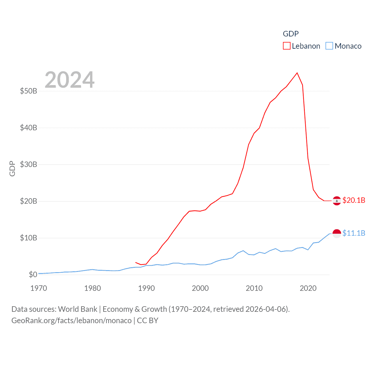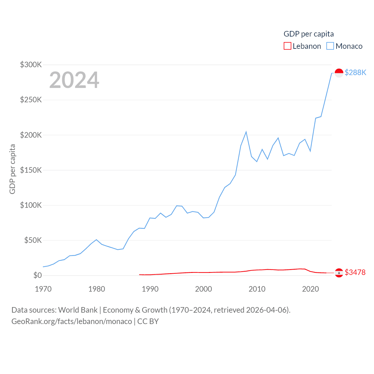 By GDP, Lebanon ranks 128/197 ($20.1B) and Monaco ranks 152/197 ($11.1B). By GDP per capita, Lebanon ranks 135/197 ($3,478), while Monaco ranks 1/197 ($288,001).