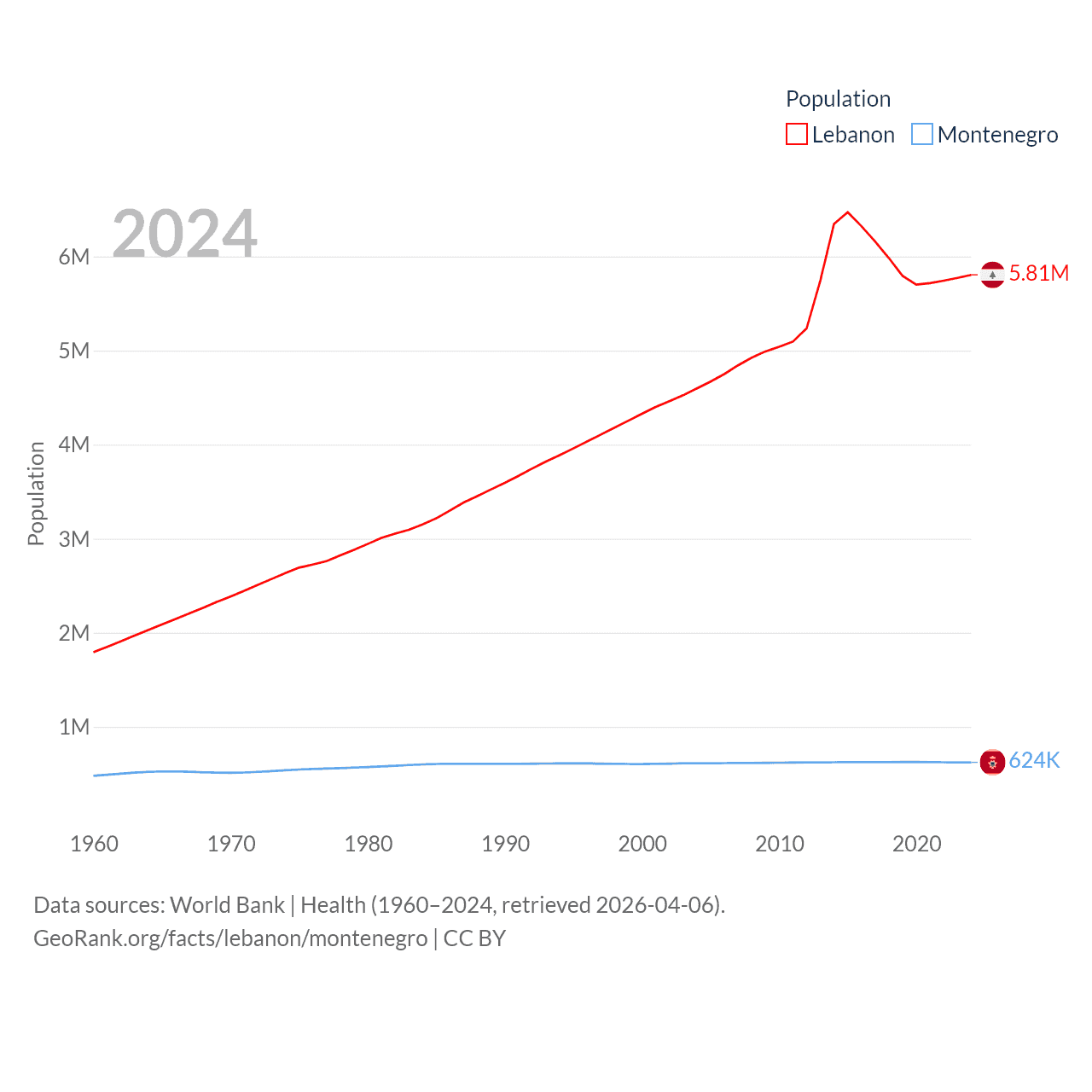 Lebanon has a population of 5.81M (ranked 115/197), compared with 624K in Montenegro (ranked 166/197). Lebanon's land area is 3,950 sq mi versus 5,193 sq mi for Montenegro (ranked 160th vs. 156th).