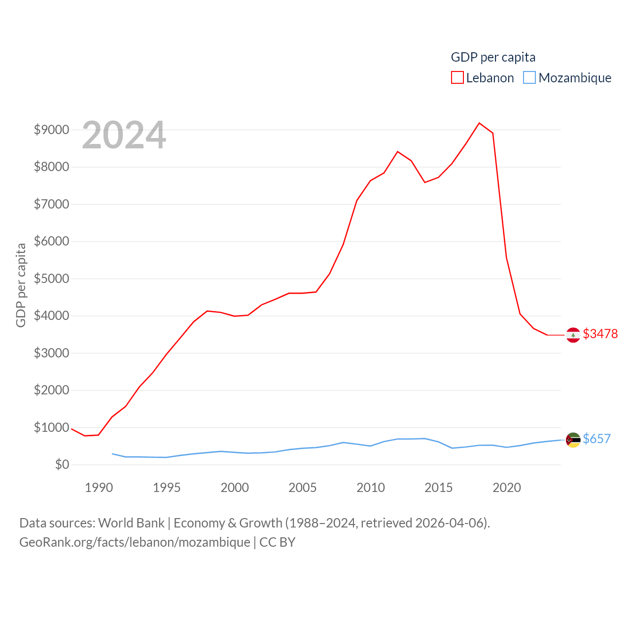 Data sources: World Bank | Economy & Growth (1988–2024, retrieved 2026-04-06).