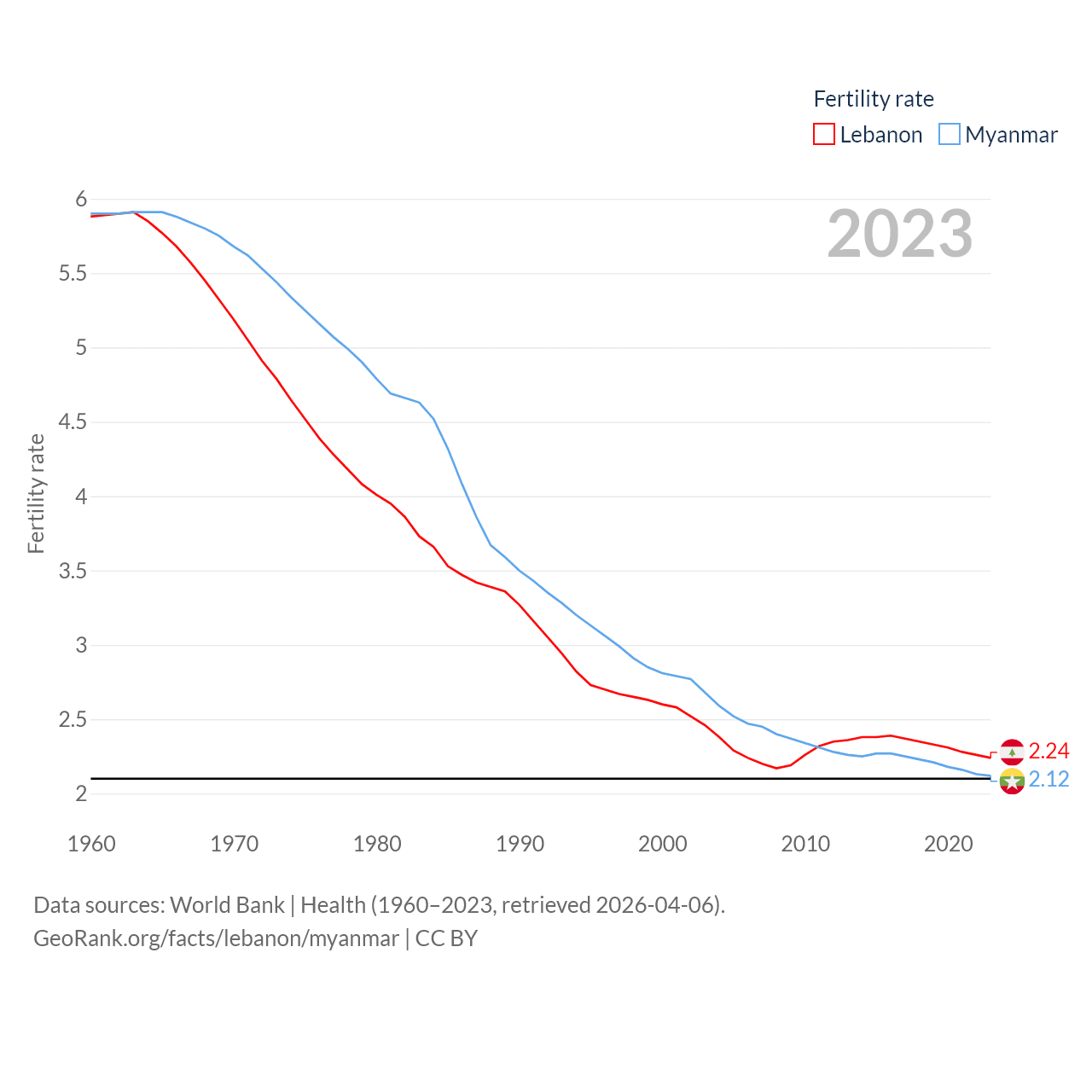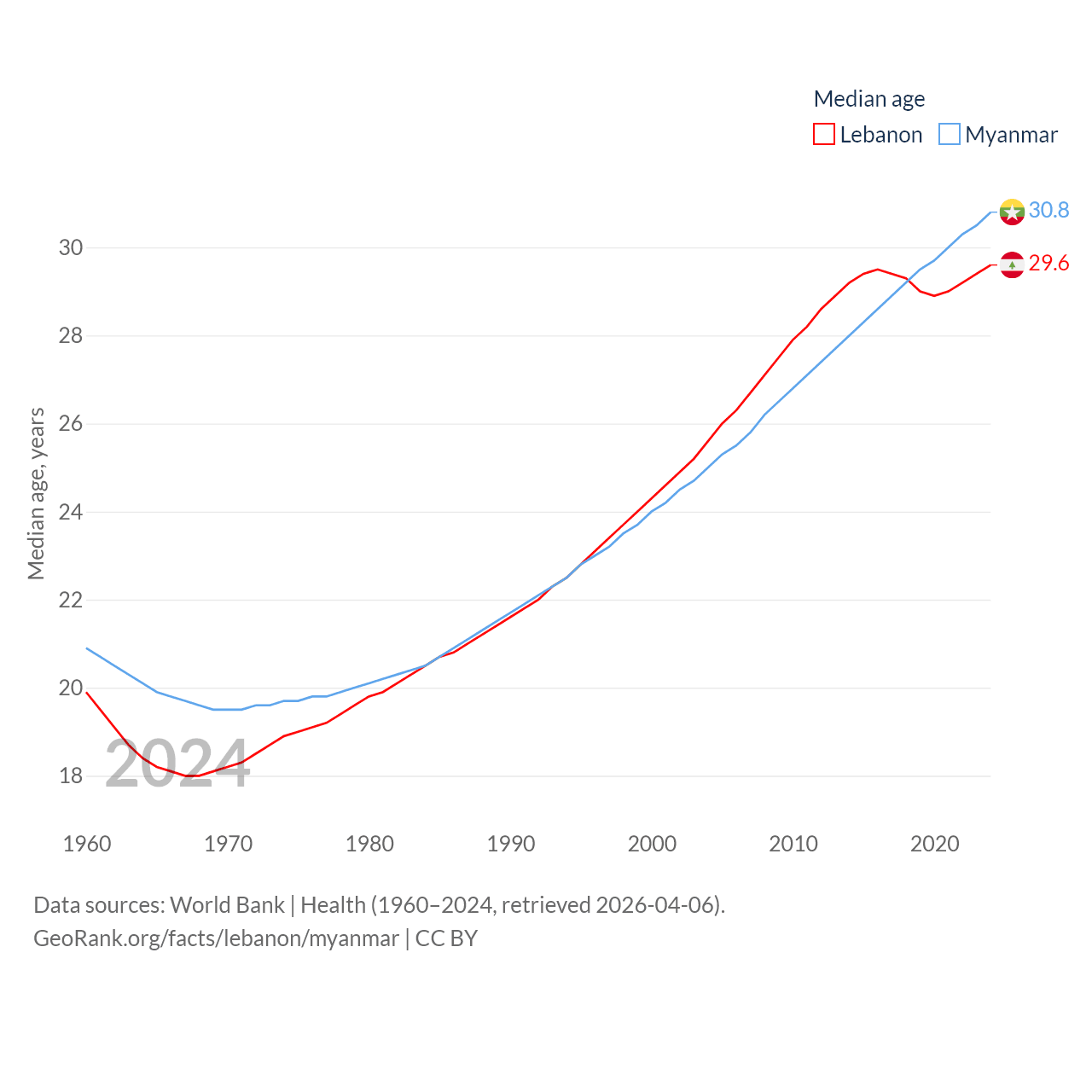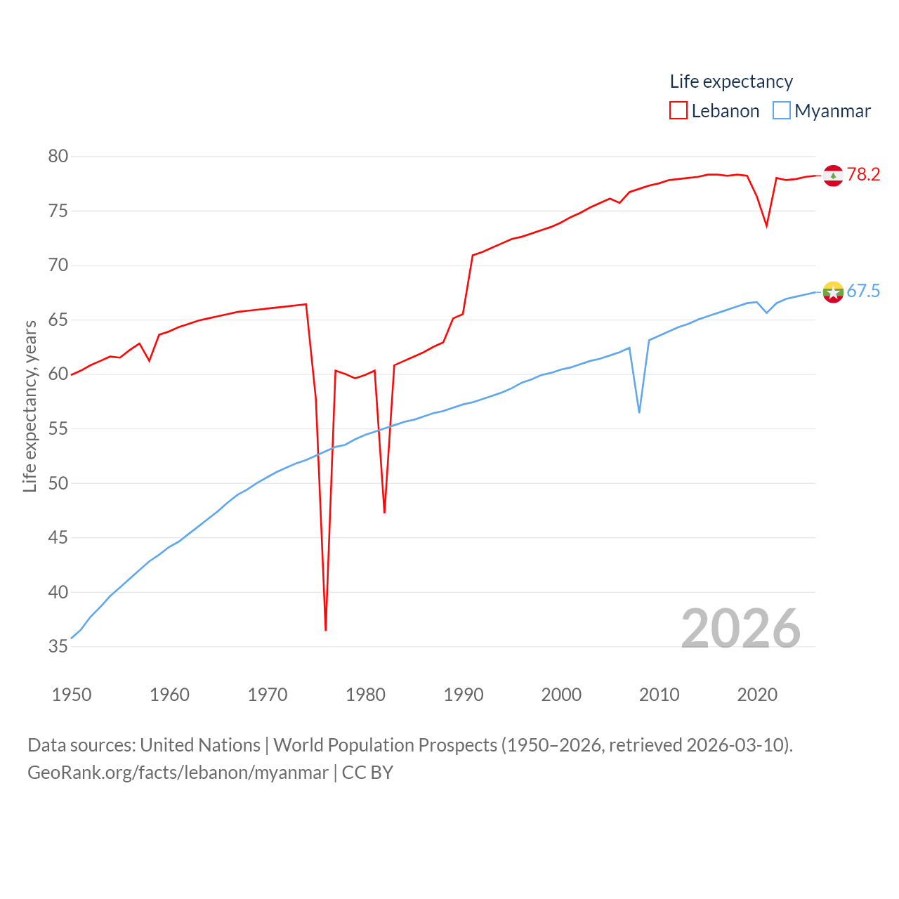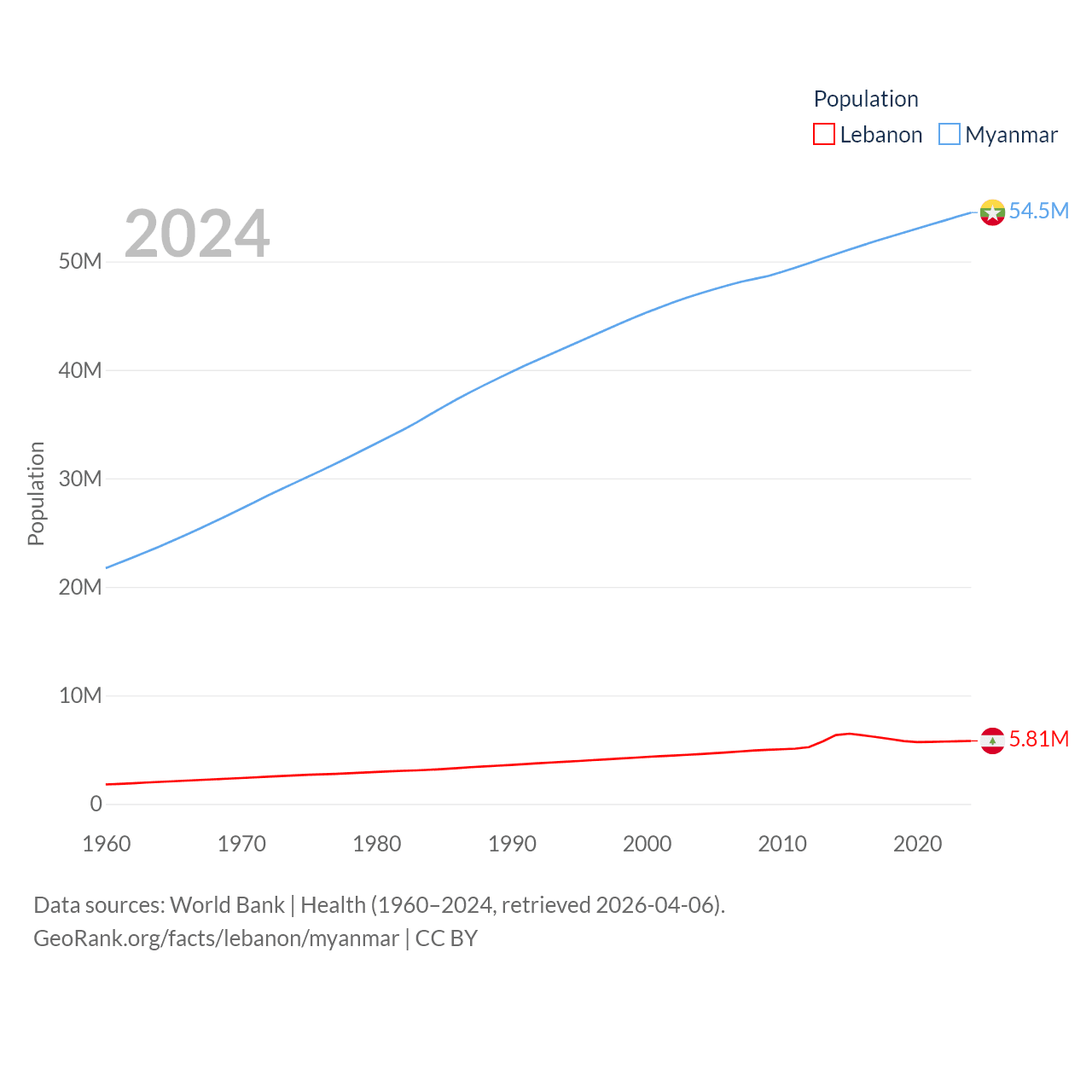 Lebanon has a population of 5.81M (ranked 115/197), compared with 54.5M in Myanmar (ranked 27/197). Lebanon's land area is 3,950 sq mi versus 251,997 sq mi for Myanmar (ranked 160th vs. 39th).