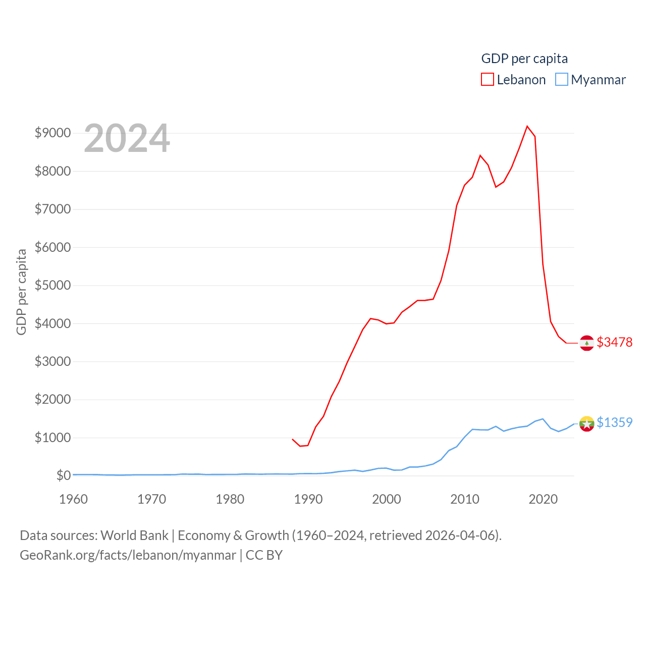 By GDP, Lebanon ranks 128/197 ($20.1B) and Myanmar ranks 85/197 ($74.1B). By GDP per capita, Lebanon ranks 135/197 ($3,478), while Myanmar ranks 165/197 ($1,359).