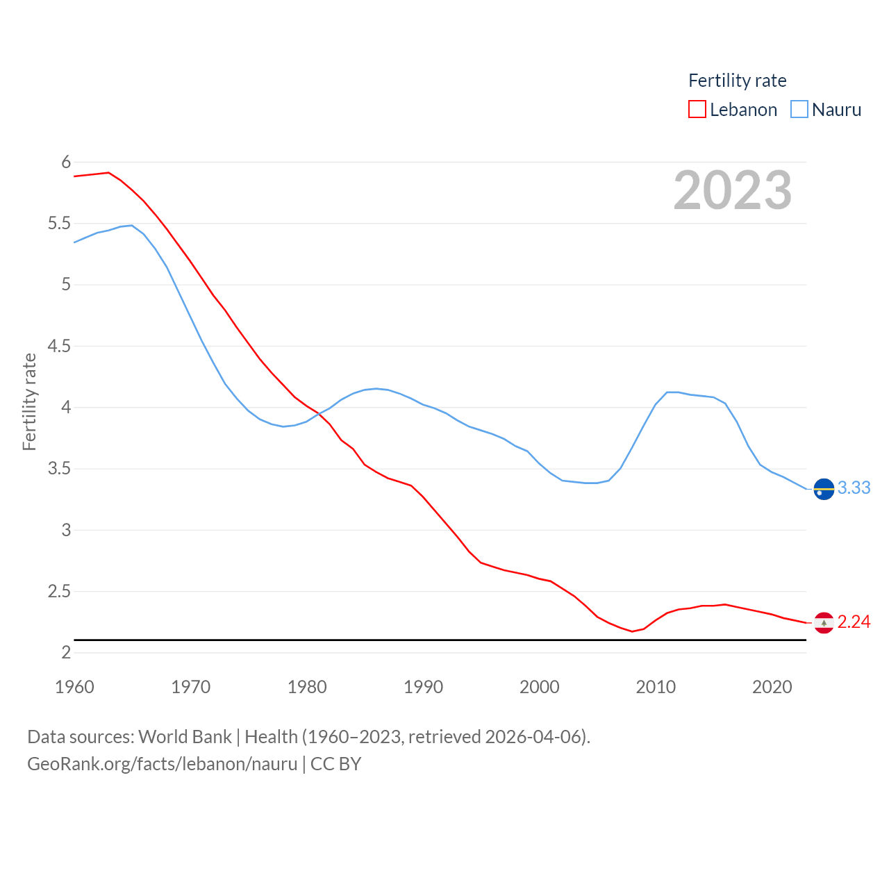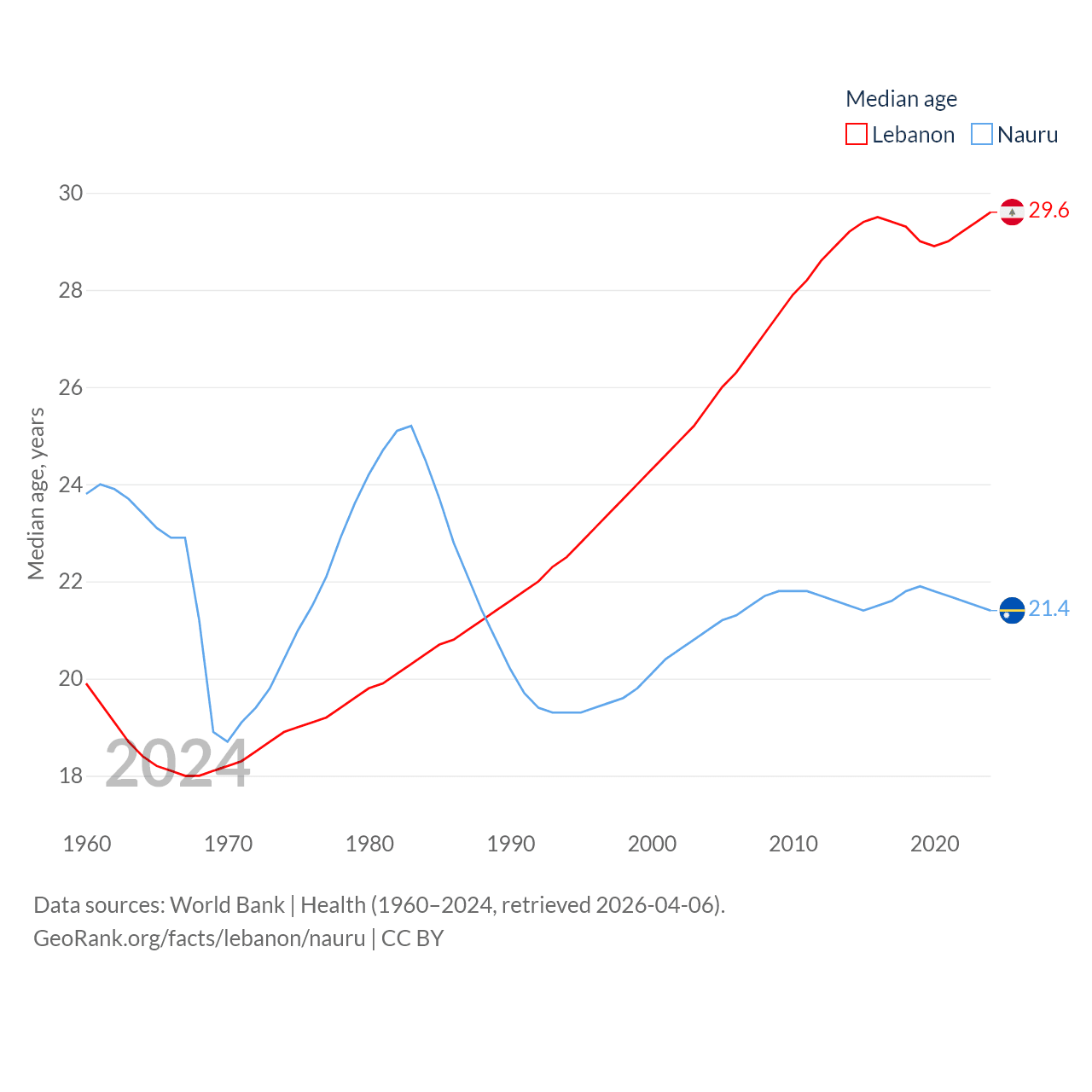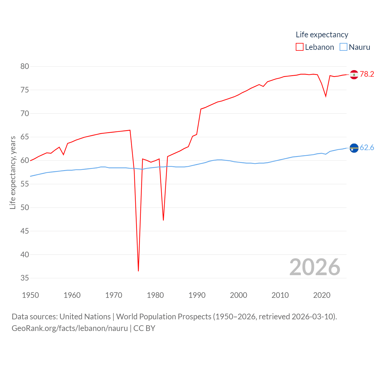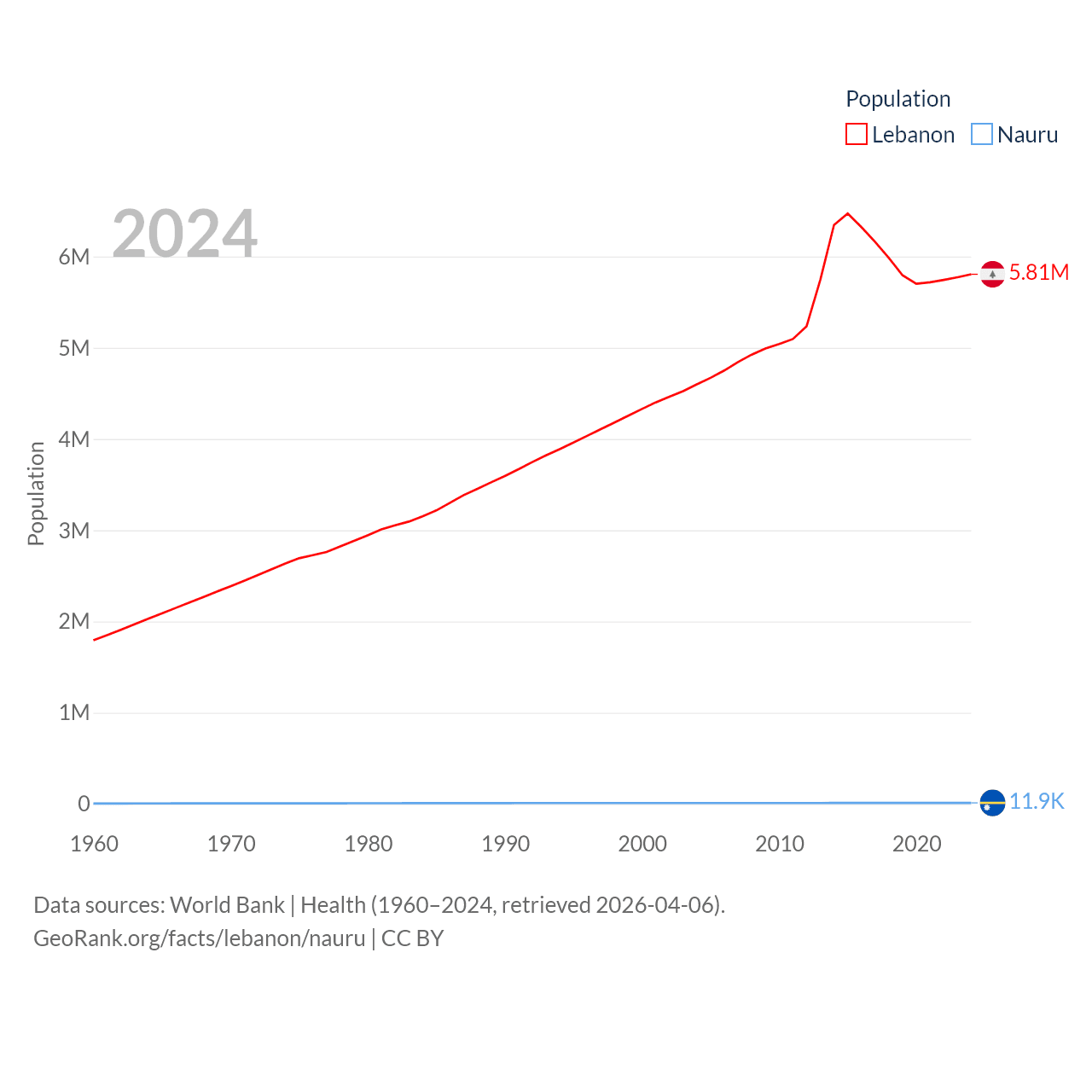 Lebanon has a population of 5.81M (ranked 115/197), compared with 11.9K in Nauru (ranked 195/197). Lebanon's land area is 3,950 sq mi versus 7.72 sq mi for Nauru (ranked 160th vs. 195th).