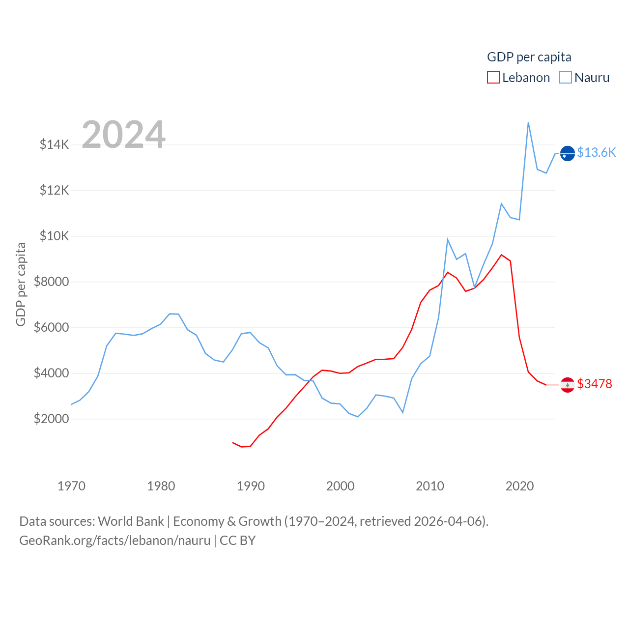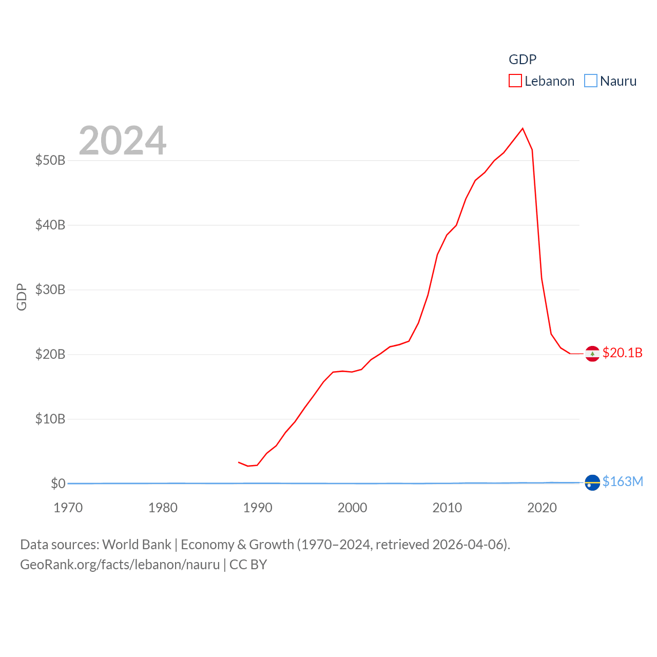 By GDP, Lebanon ranks 128/197 ($20.1B) and Nauru ranks 195/197 ($163M). By GDP per capita, Lebanon ranks 135/197 ($3,478), while Nauru ranks 74/197 ($13,609).