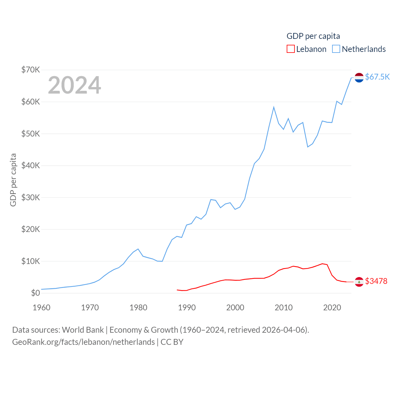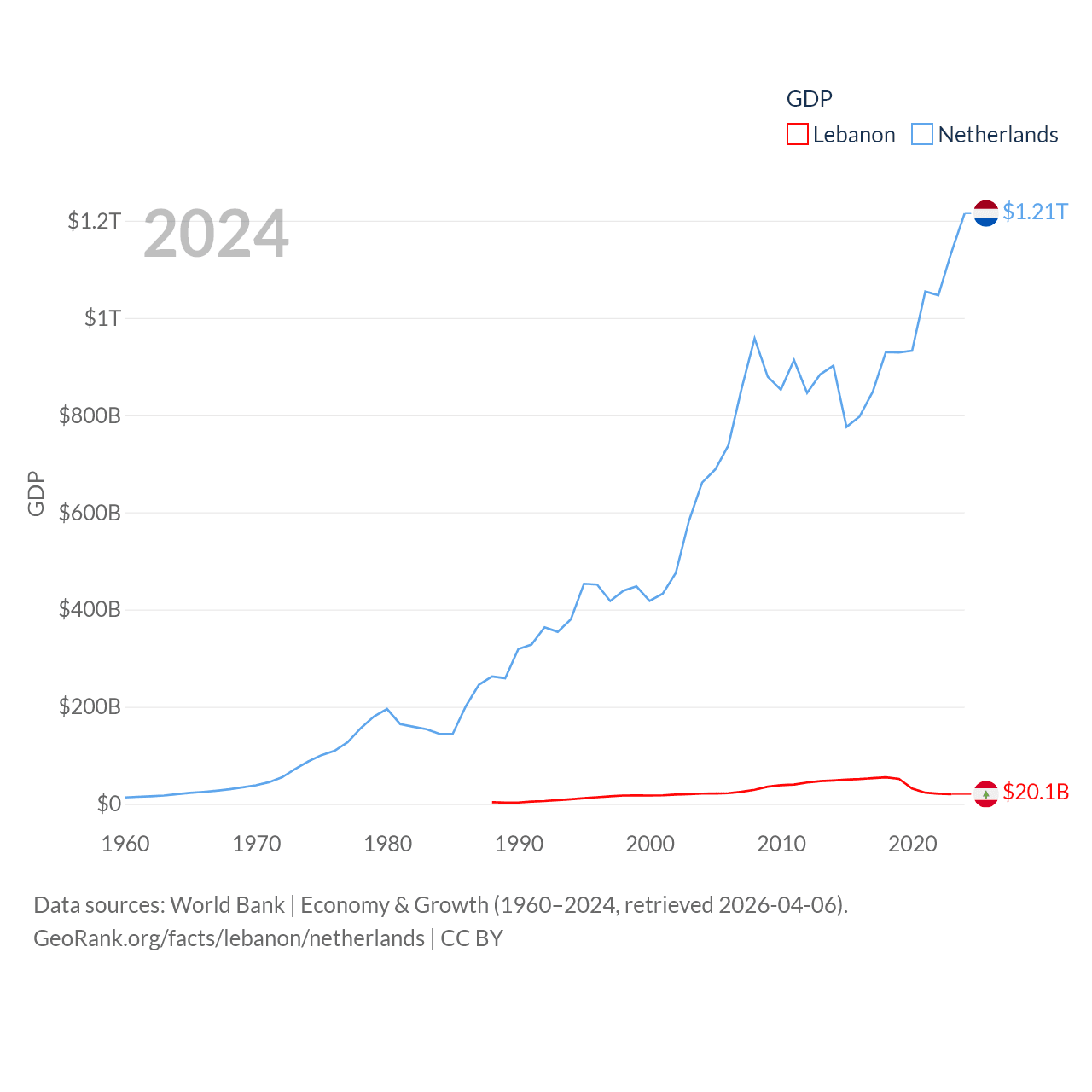 By GDP, Lebanon ranks 128/197 ($20.1B) and The Netherlands ranks 19/197 ($1.21T). By GDP per capita, Lebanon ranks 135/197 ($3,478), while The Netherlands ranks 13/197 ($67,520).
