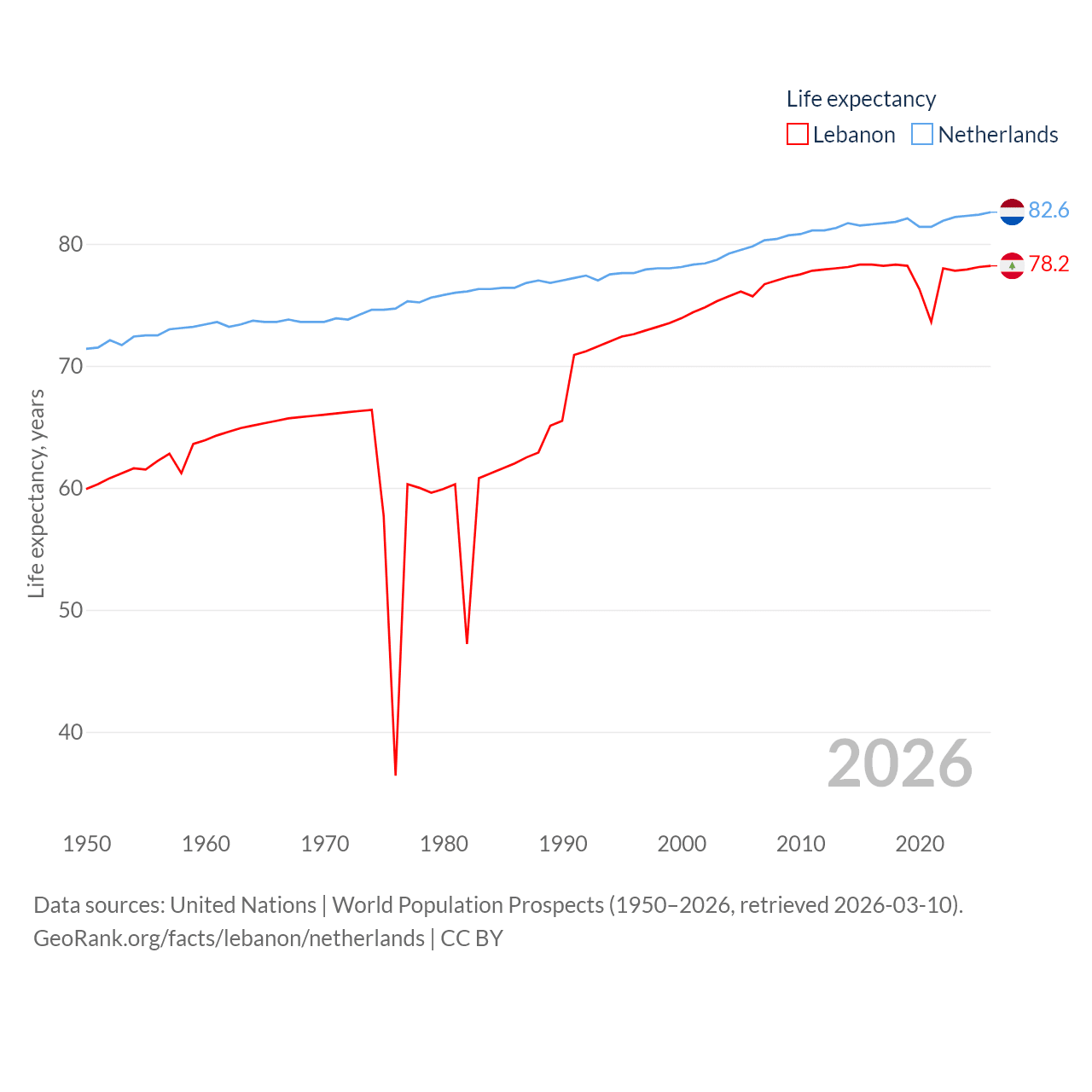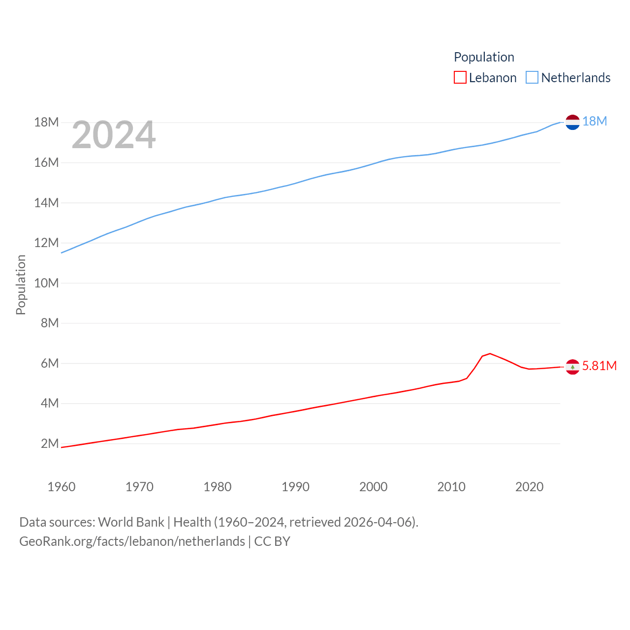 Lebanon has a population of 5.81M (ranked 115/197), compared with 18M in The Netherlands (ranked 72/197). Lebanon's land area is 3,950 sq mi versus 13,000 sq mi for The Netherlands (ranked 160th vs. 134th).