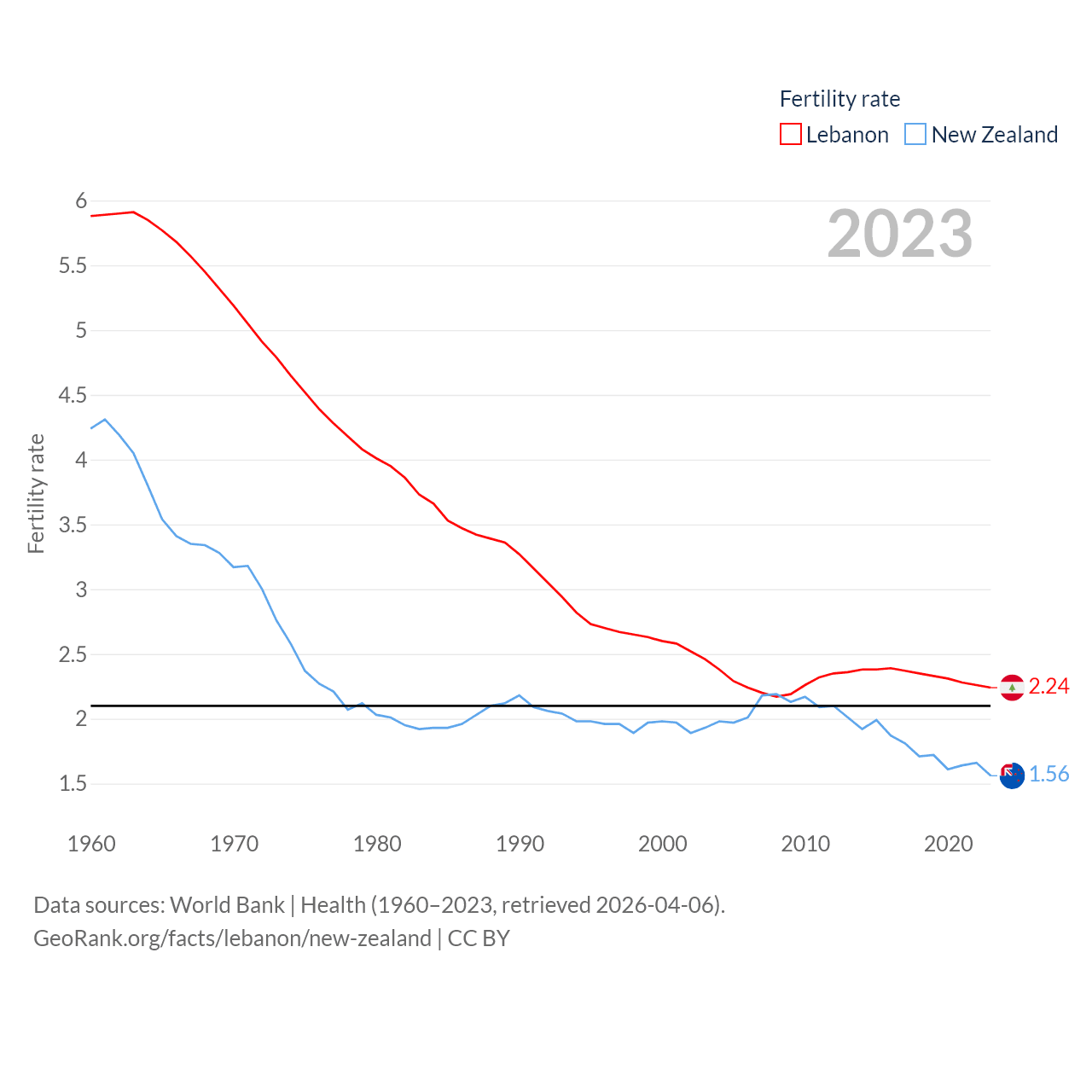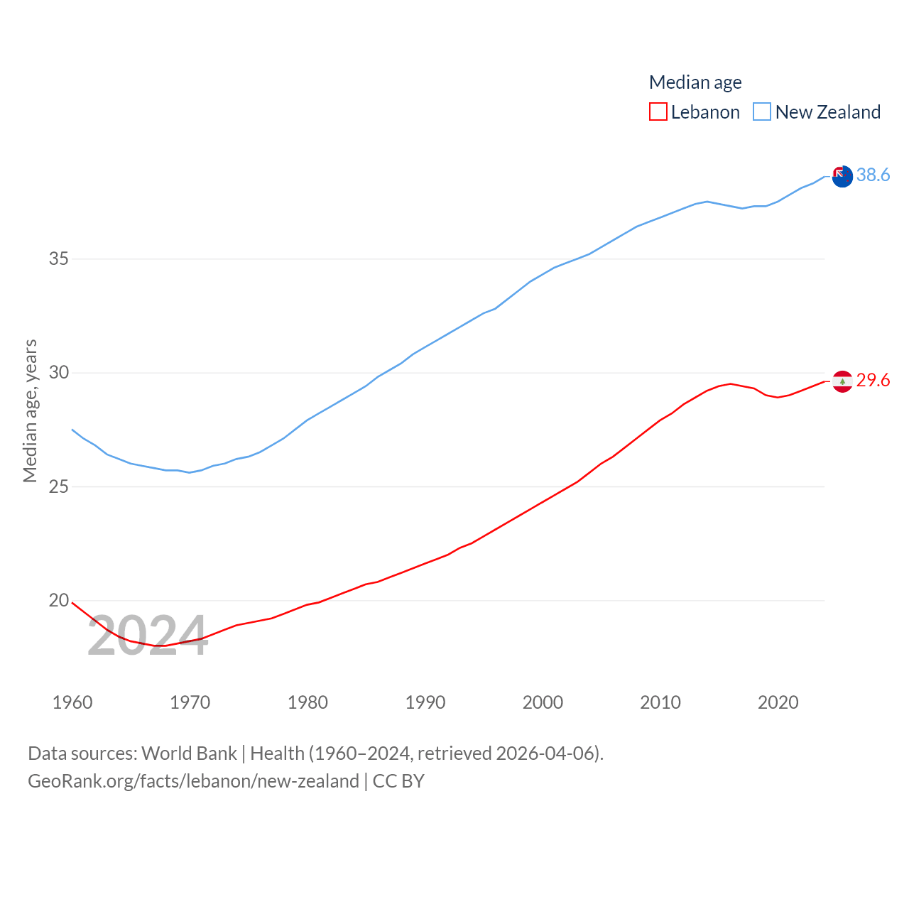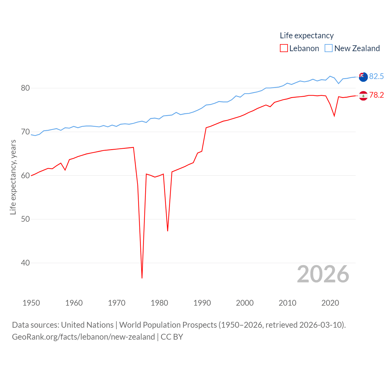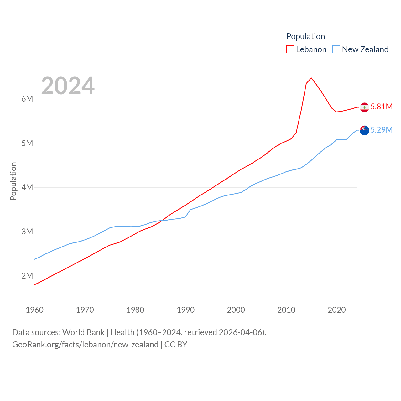Lebanon has a population of 5.81M (ranked 115/197), compared with 5.29M in New Zealand (ranked 123/197). Lebanon's land area is 3,950 sq mi versus 101,665 sq mi for New Zealand (ranked 160th vs. 74th).