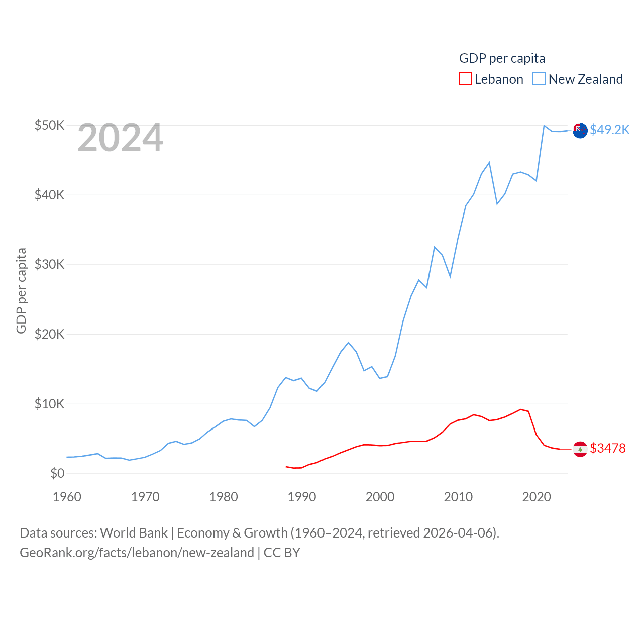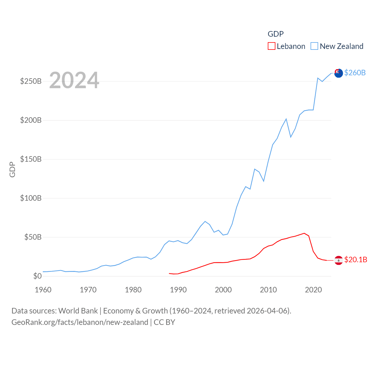 By GDP, Lebanon ranks 128/197 ($20.1B) and New Zealand ranks 52/197 ($260B). By GDP per capita, Lebanon ranks 135/197 ($3,478), while New Zealand ranks 26/197 ($49,205).