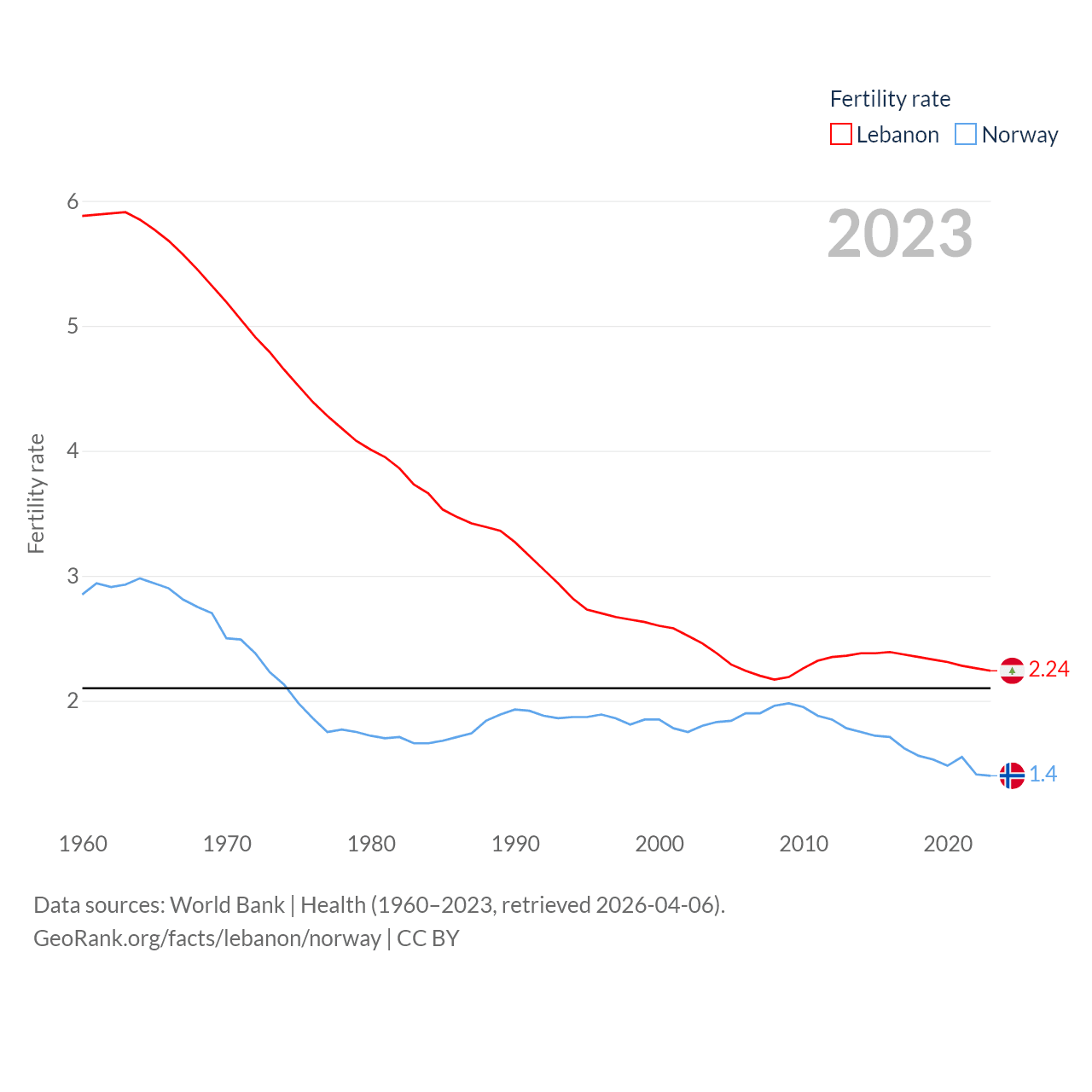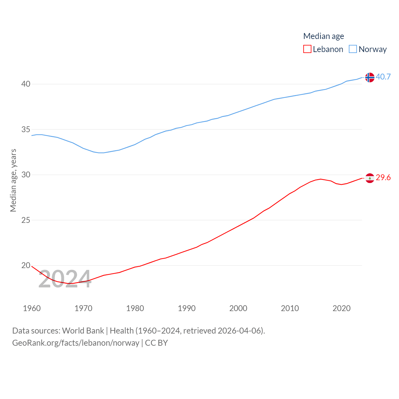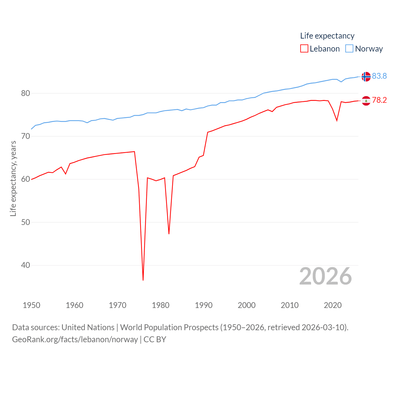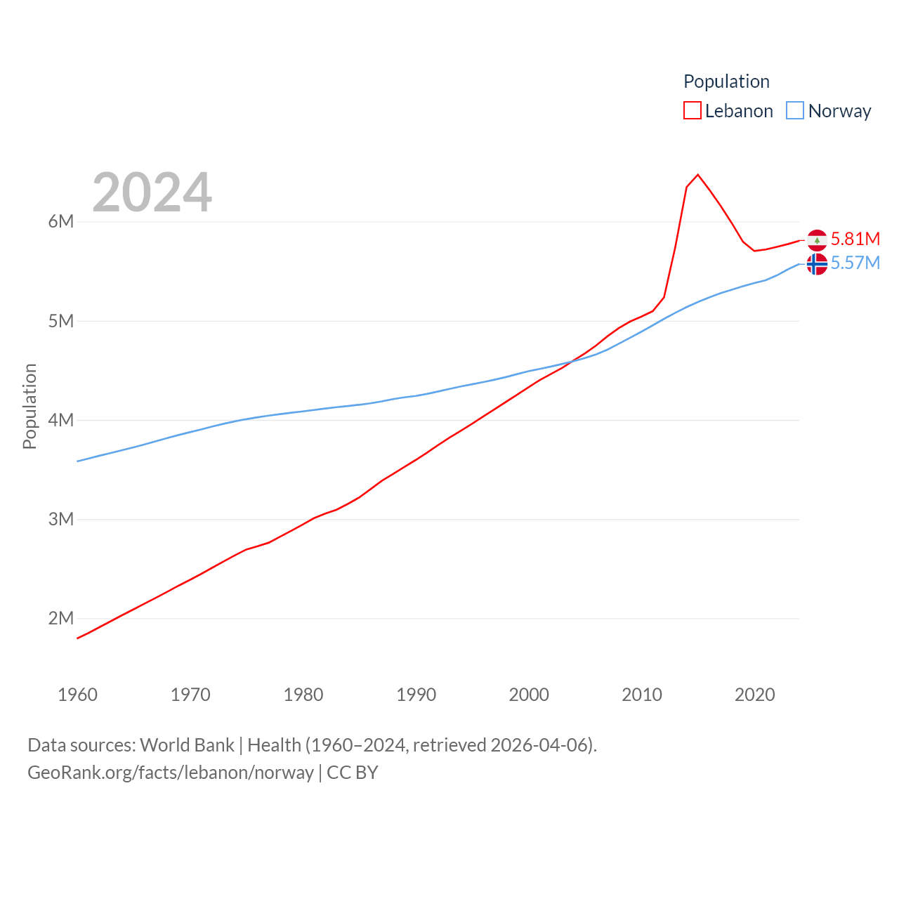 Lebanon has a population of 5.81M (ranked 115/197), compared with 5.57M in Norway (ranked 118/197). Lebanon's land area is 3,950 sq mi versus 140,645 sq mi for Norway (ranked 160th vs. 62nd).