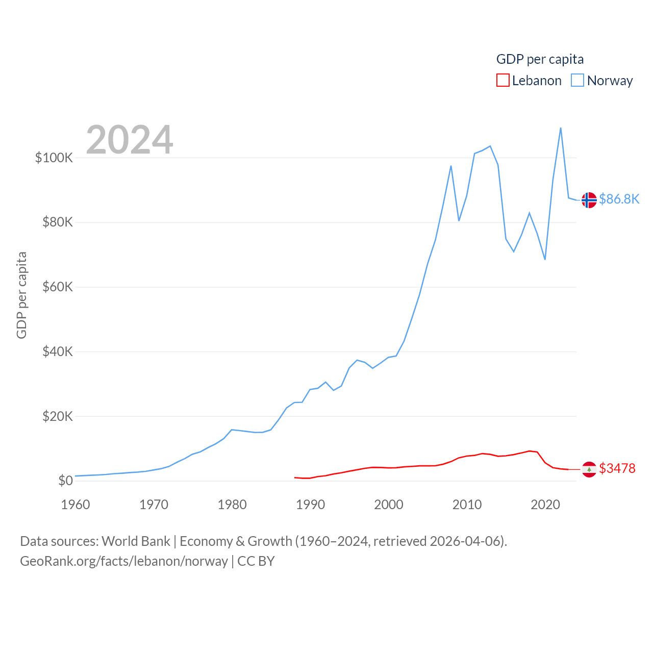 By GDP, Lebanon ranks 128/197 ($20.1B) and Norway ranks 32/197 ($484B). By GDP per capita, Lebanon ranks 135/197 ($3,478), while Norway ranks 8/197 ($86,785).