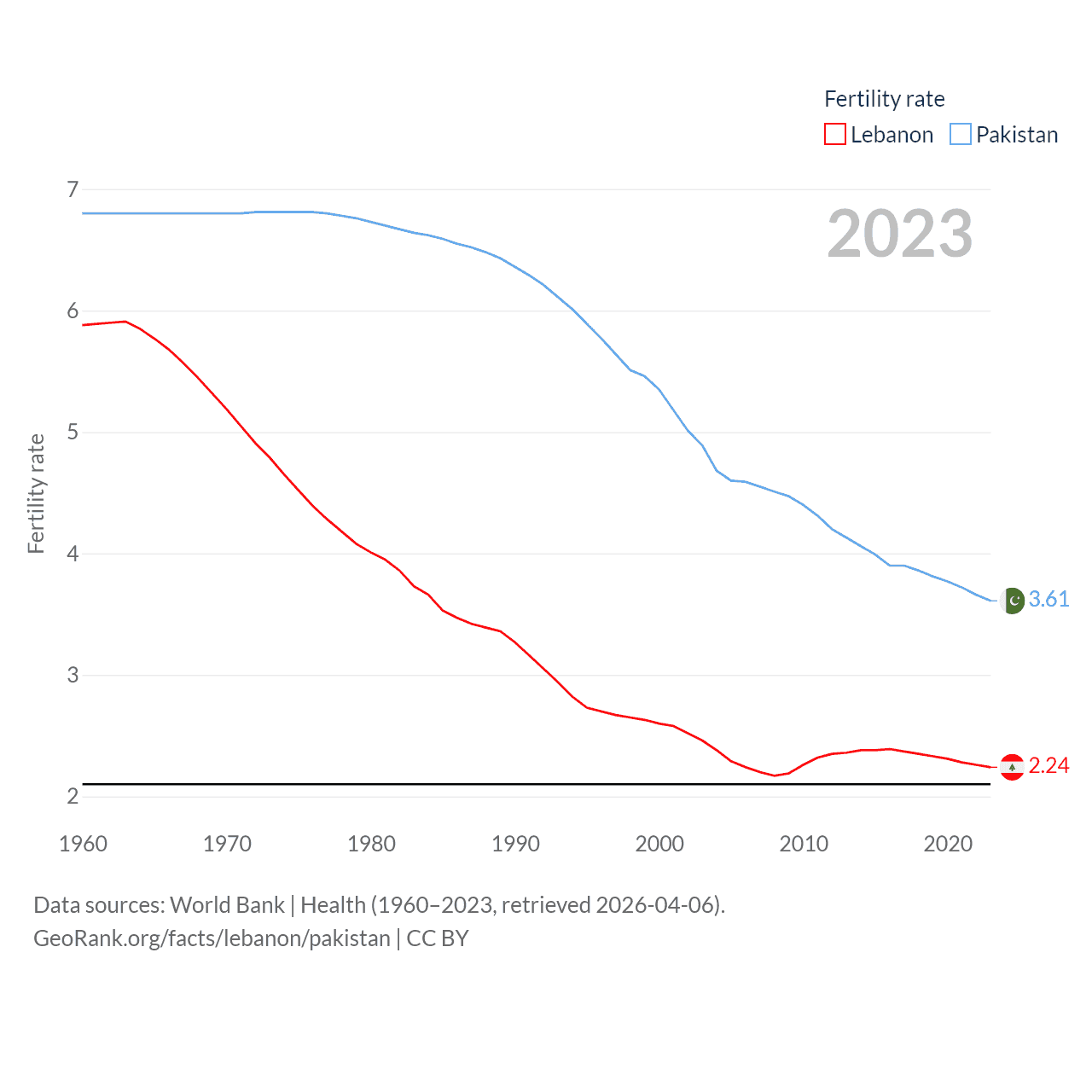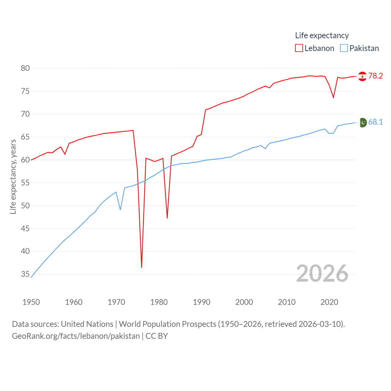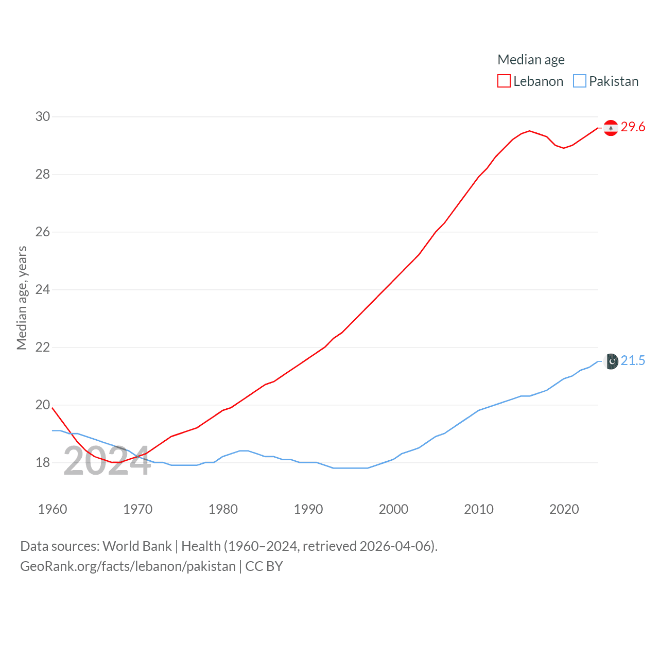 Lebanon has a population of 5.81M (ranked 115/197), compared with 251M in Pakistan (ranked 5/197). Lebanon's land area is 3,950 sq mi versus 297,638 sq mi for Pakistan (ranked 160th vs. 35th).