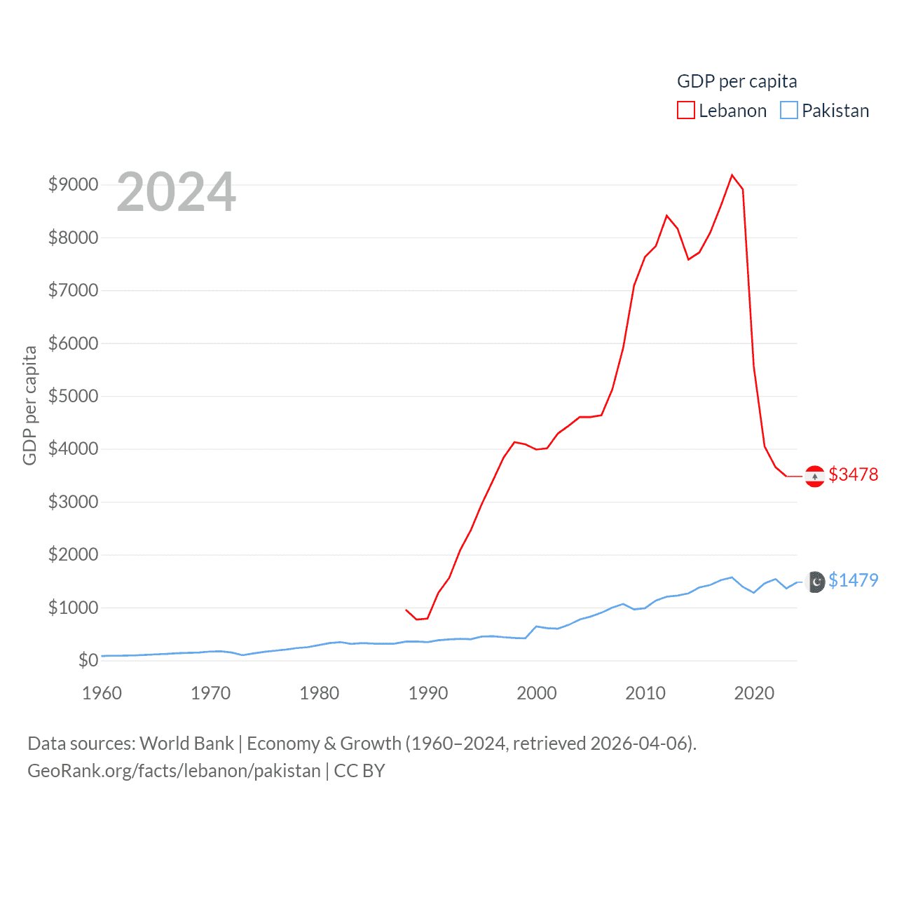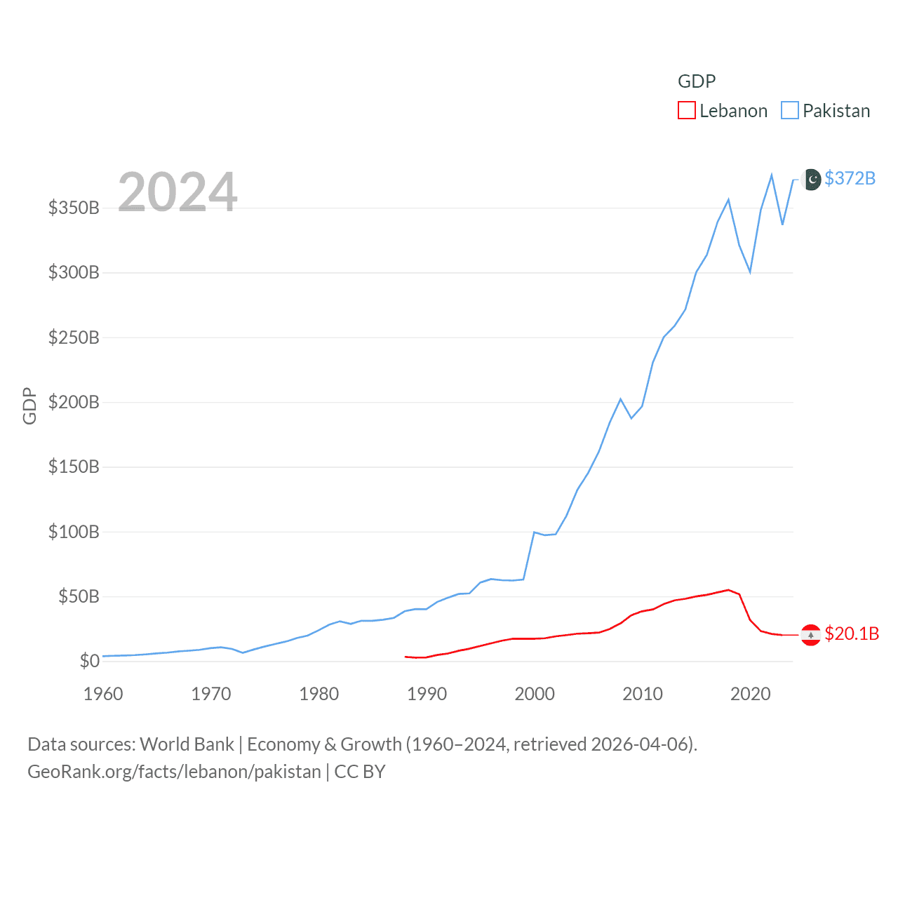 By GDP, Lebanon ranks 128/197 ($20.1B) and Pakistan ranks 43/197 ($372B). By GDP per capita, Lebanon ranks 135/197 ($3,478), while Pakistan ranks 163/197 ($1,479).