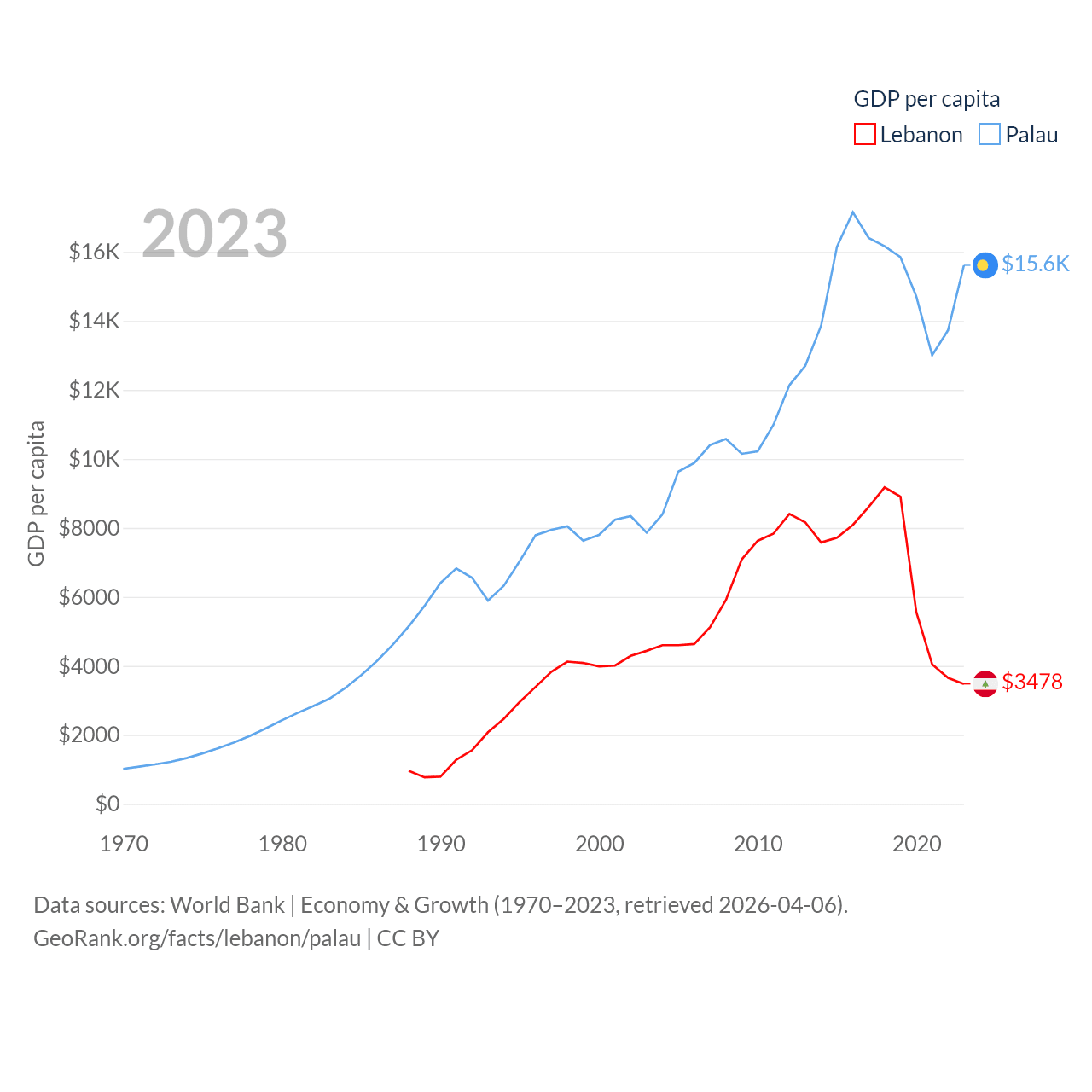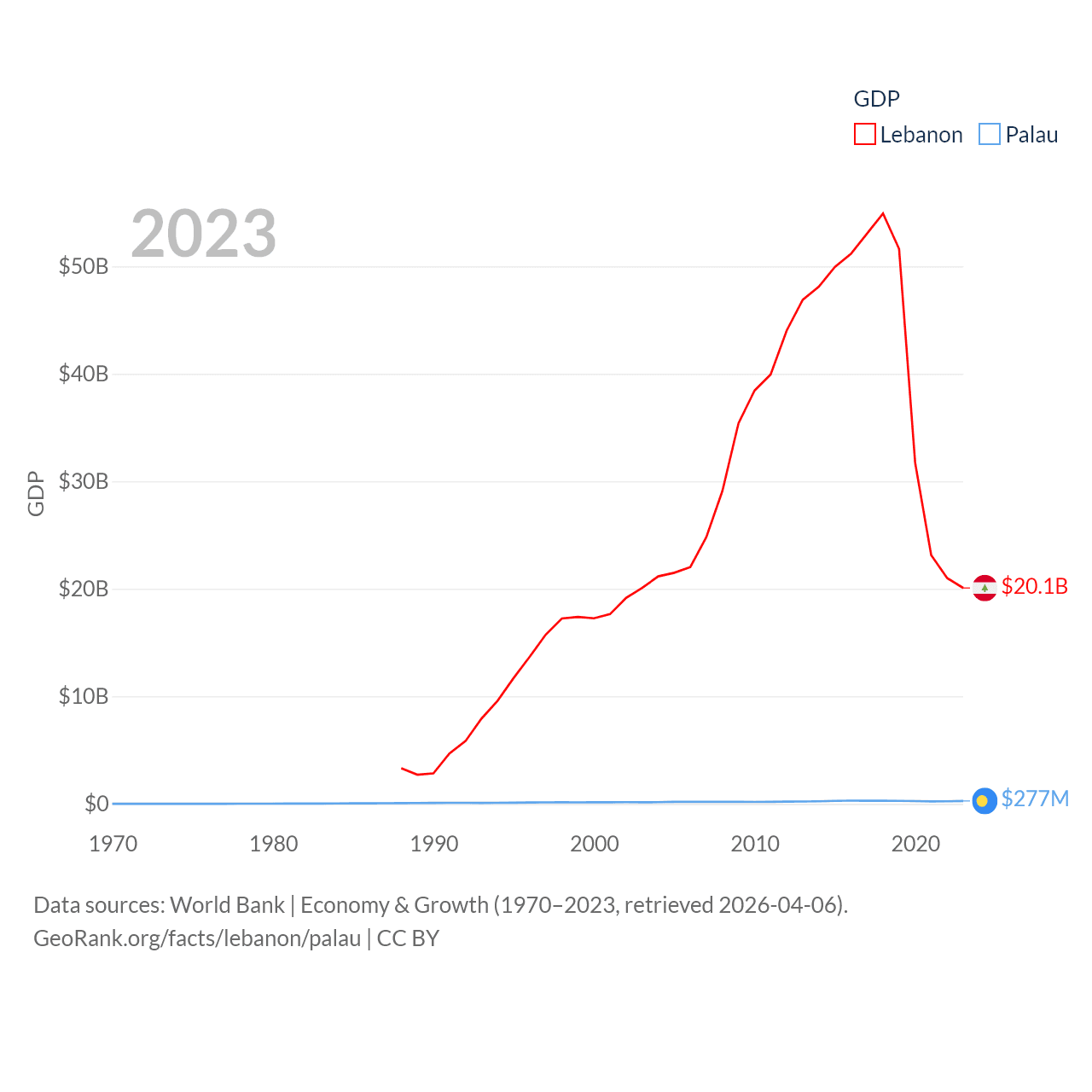 By GDP, Lebanon ranks 128/197 ($20.1B) and Palau ranks 194/197 ($277M). By GDP per capita, Lebanon ranks 135/197 ($3,478), while Palau ranks 67/197 ($15,611).