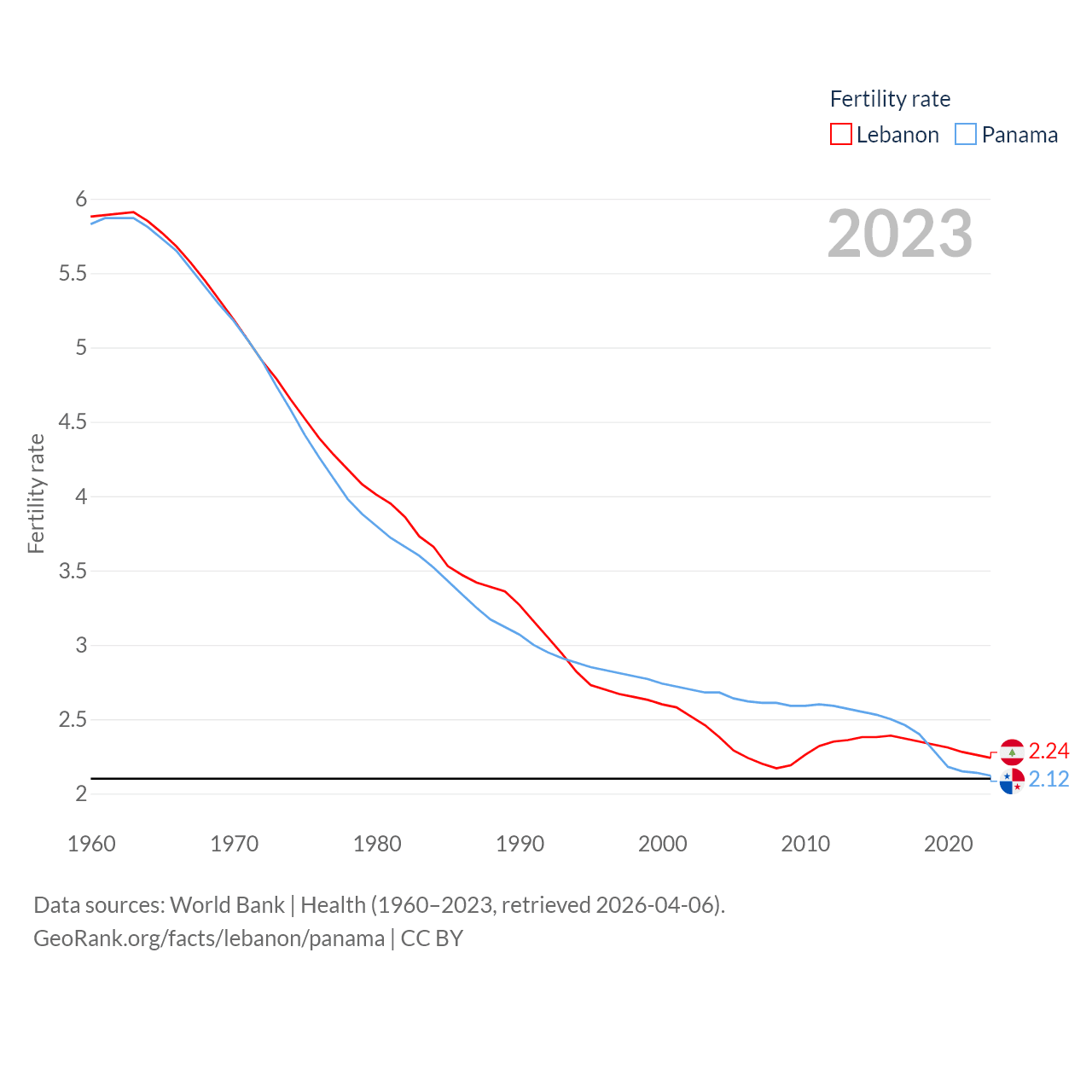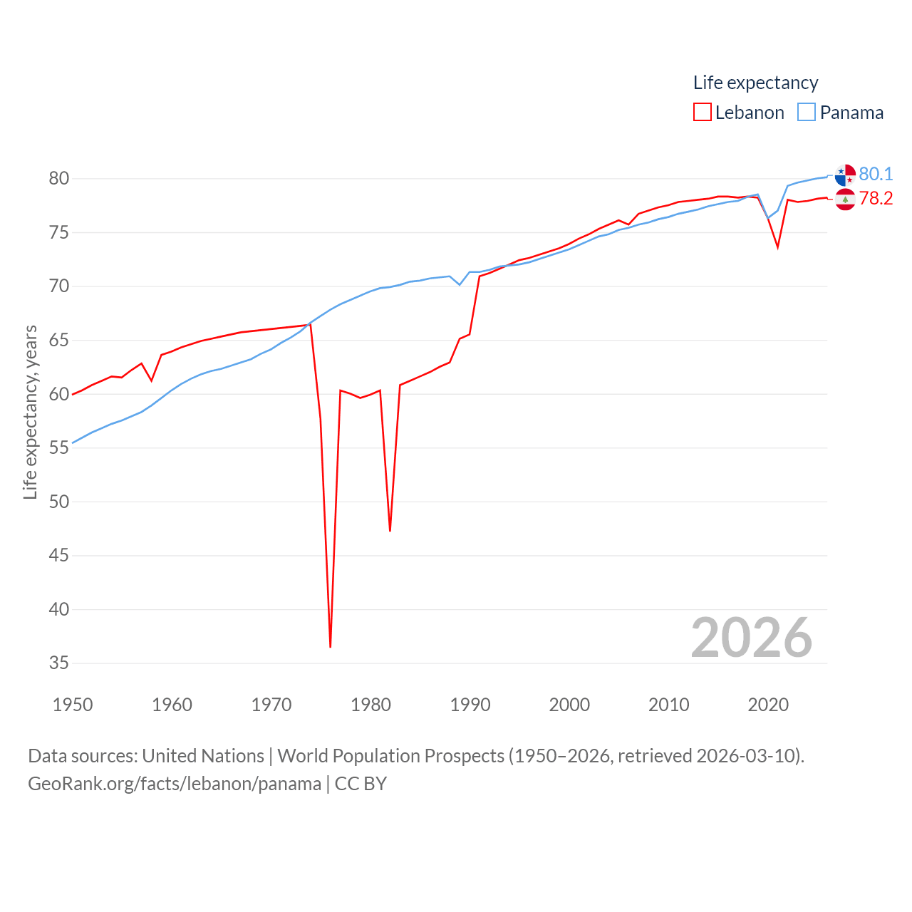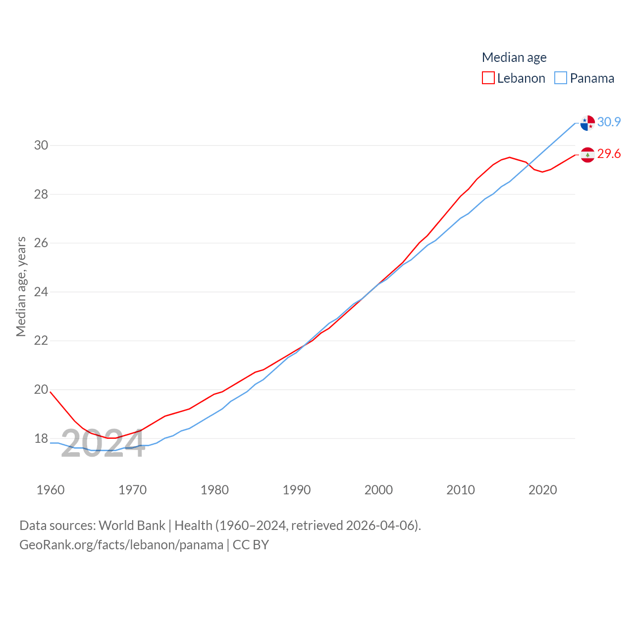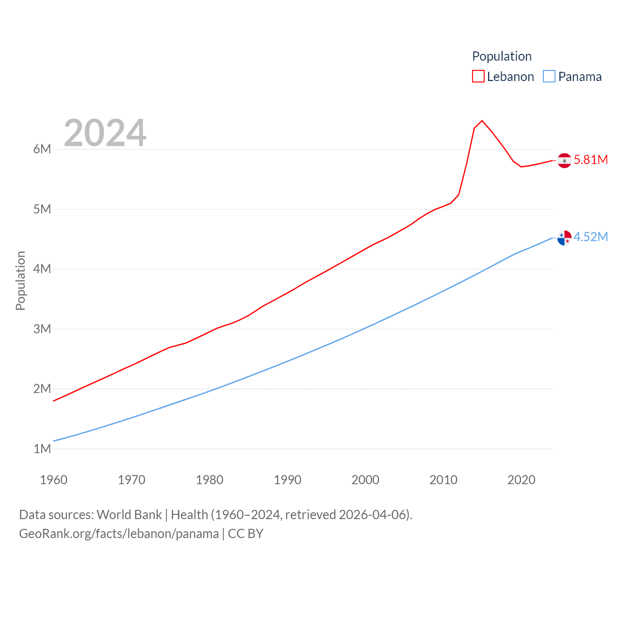 Lebanon has a population of 5.81M (ranked 115/197), compared with 4.52M in Panama (ranked 128/197). Lebanon's land area is 3,950 sq mi versus 28,641 sq mi for Panama (ranked 160th vs. 115th).