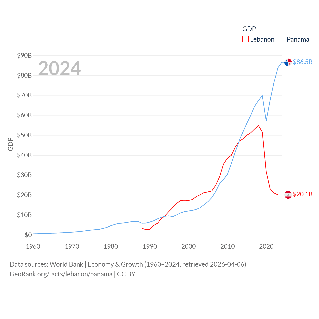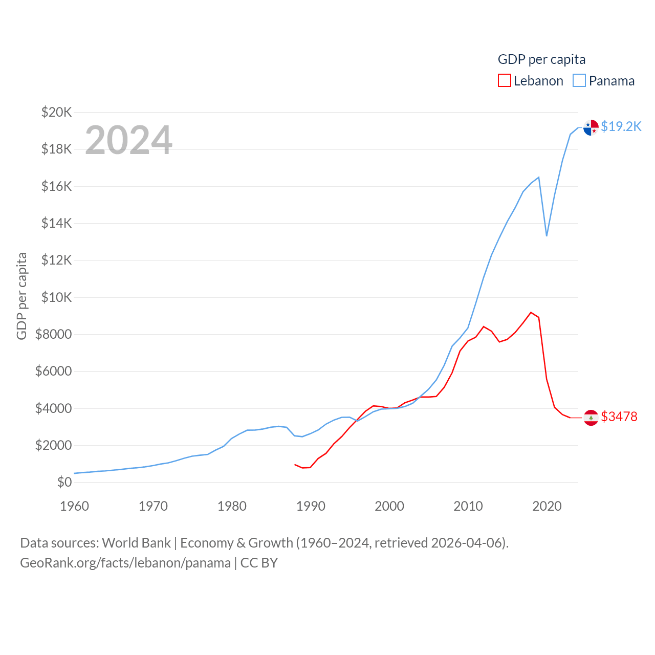 By GDP, Lebanon ranks 128/197 ($20.1B) and Panama ranks 78/197 ($86.5B). By GDP per capita, Lebanon ranks 135/197 ($3,478), while Panama ranks 60/197 ($19,161).