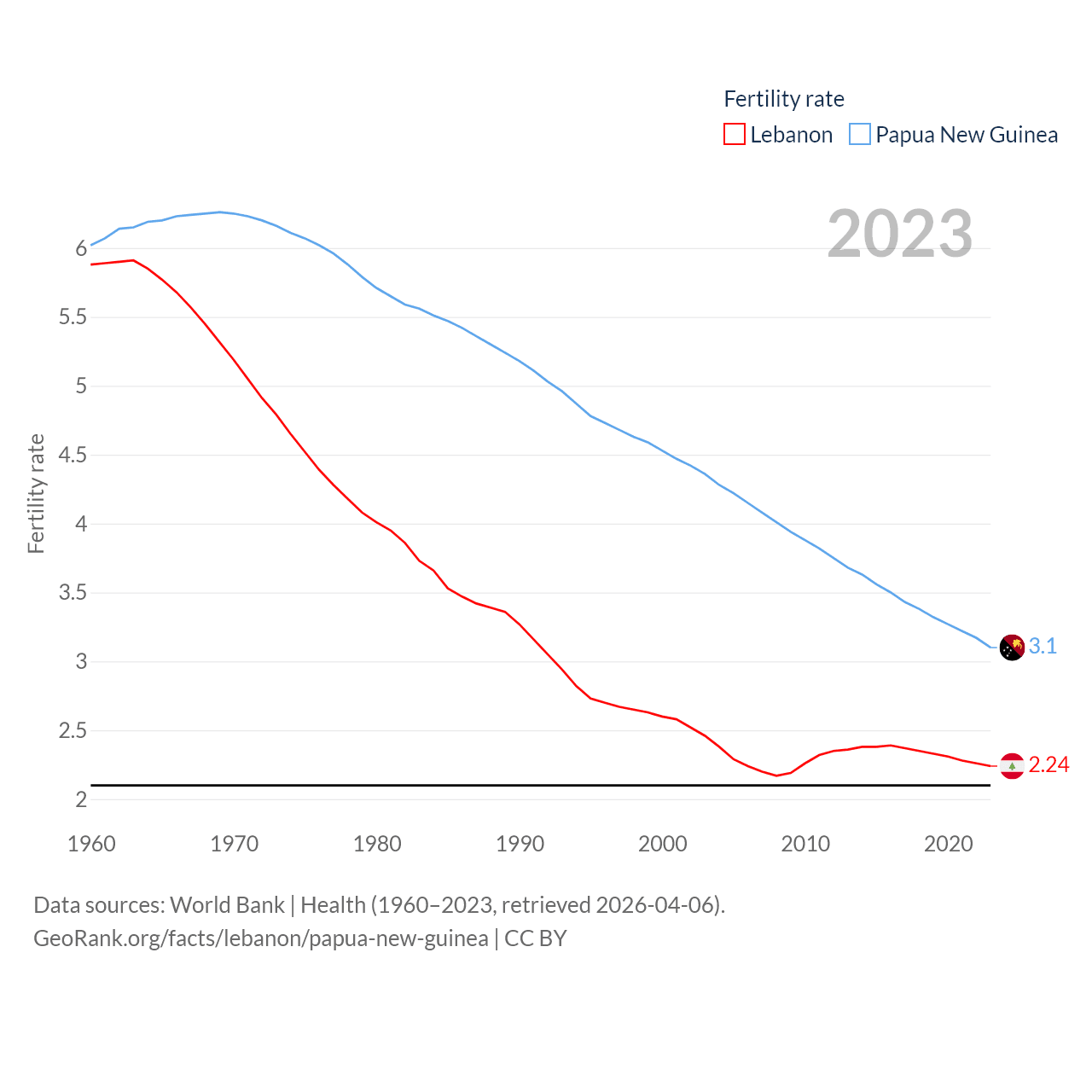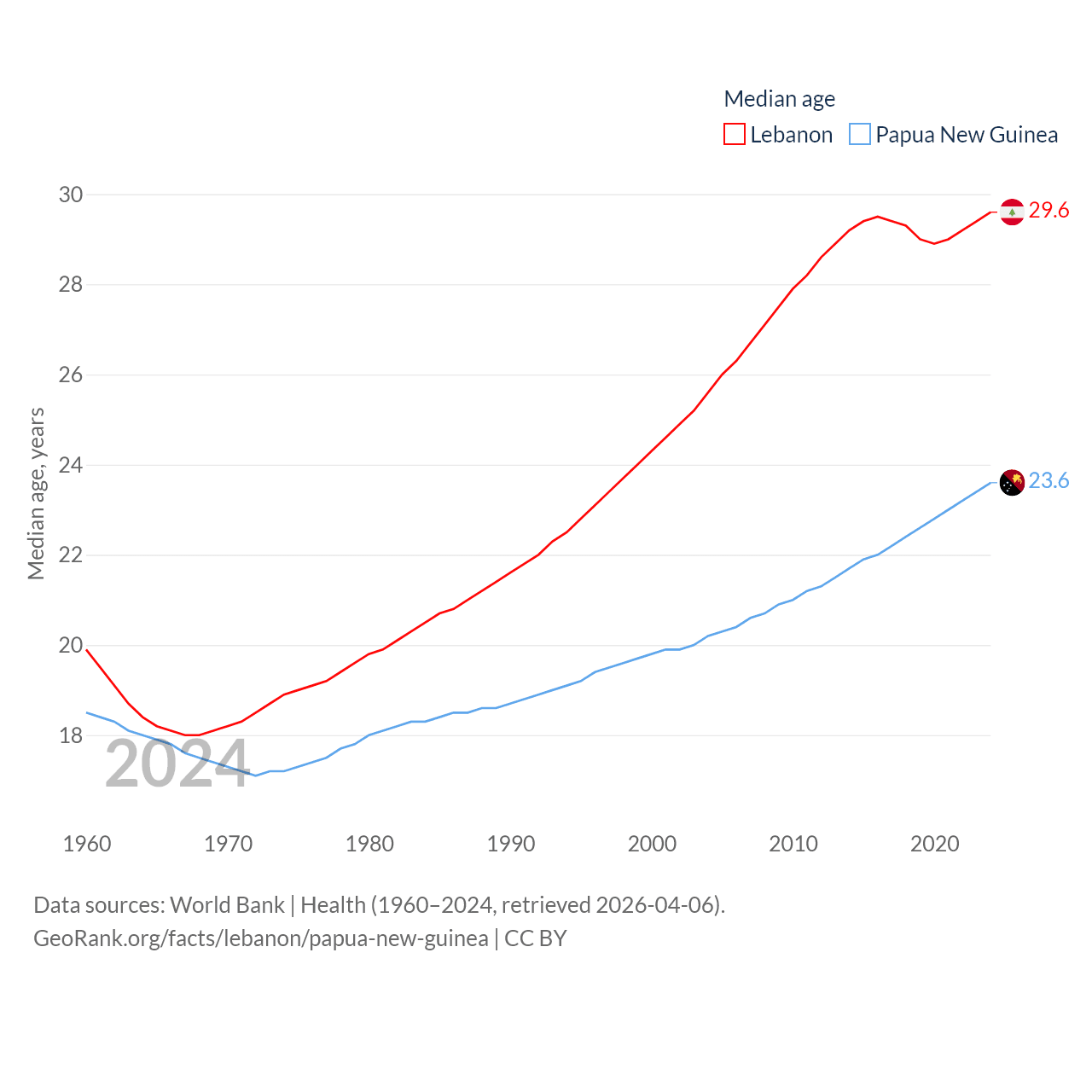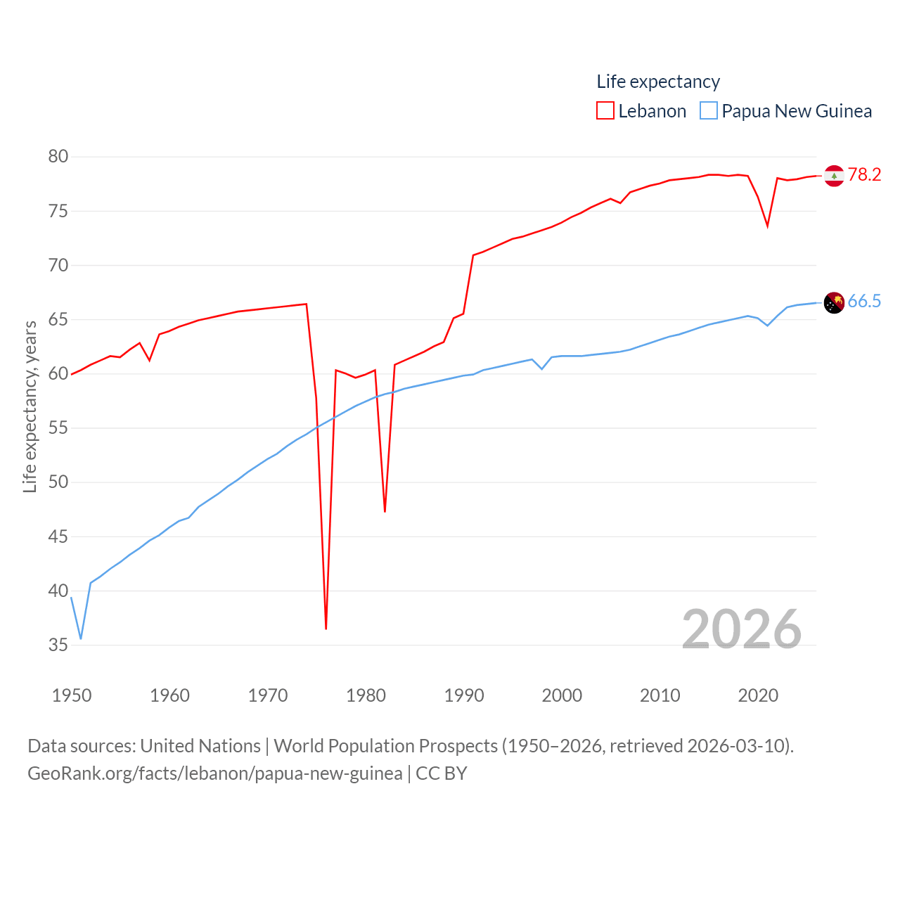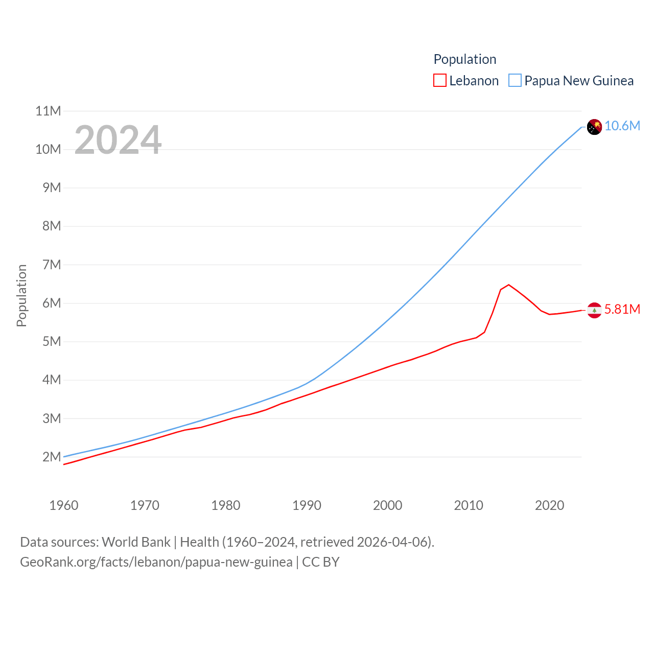 Lebanon has a population of 5.81M (ranked 115/197), compared with 10.6M in Papua New Guinea (ranked 92/197). Lebanon's land area is 3,950 sq mi versus 174,850 sq mi for Papua New Guinea (ranked 160th vs. 54th).