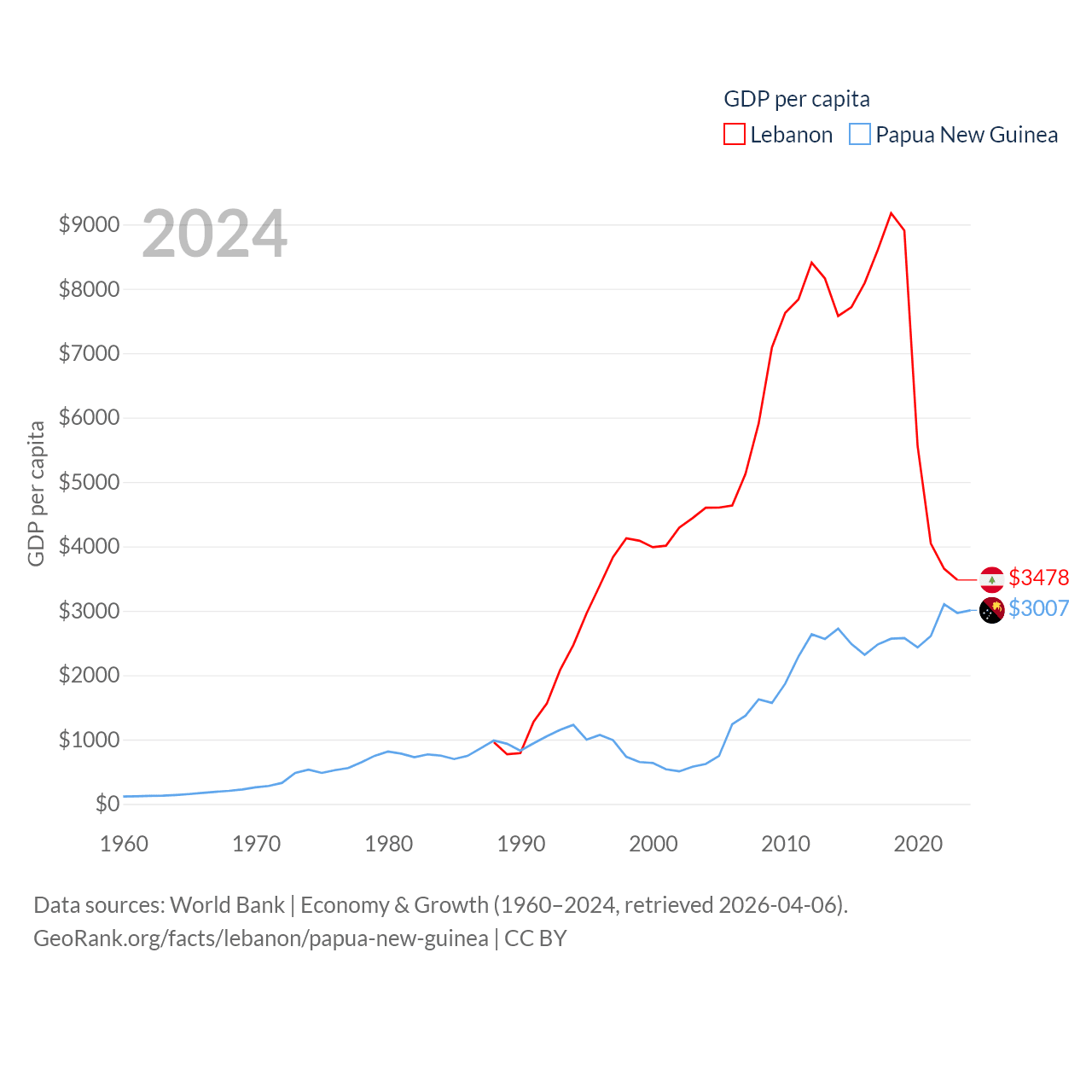 By GDP, Lebanon ranks 128/197 ($20.1B) and Papua New Guinea ranks 110/197 ($31.8B). By GDP per capita, Lebanon ranks 135/197 ($3,478), while Papua New Guinea ranks 140/197 ($3,007).