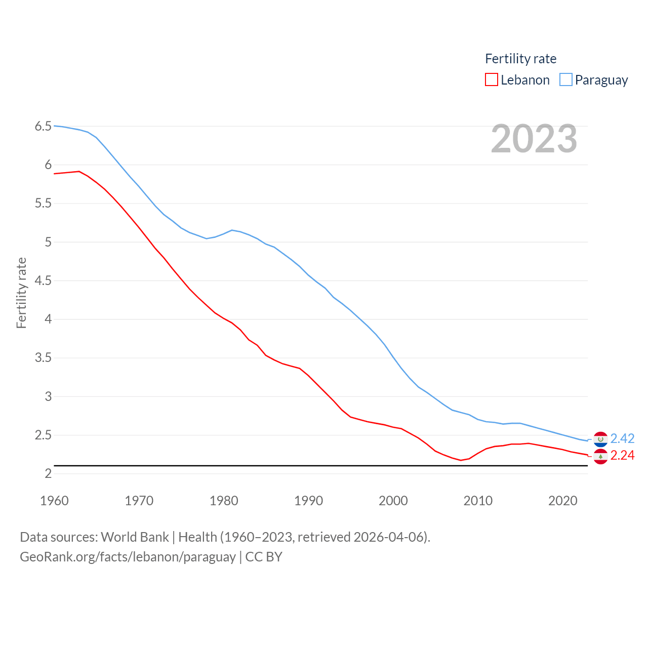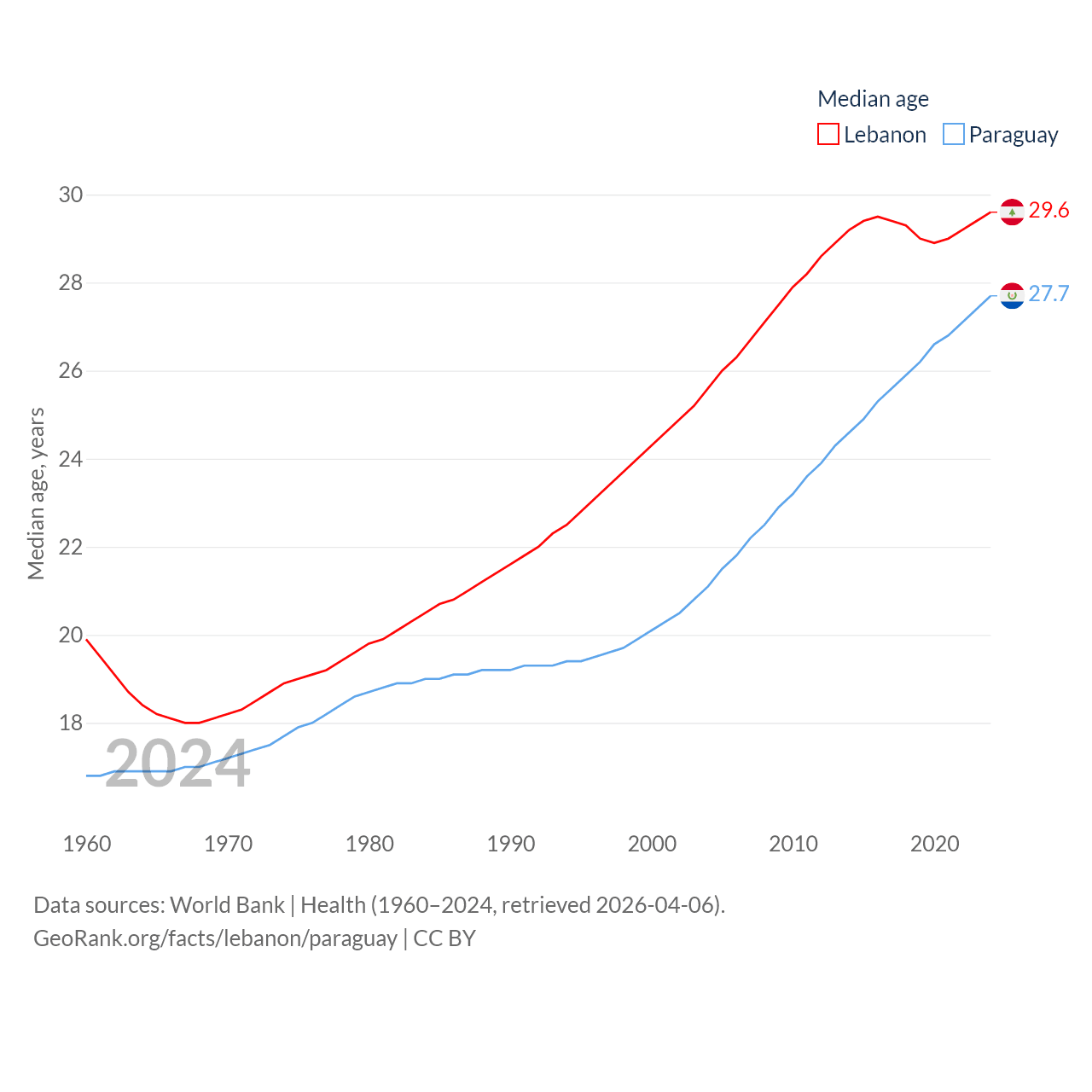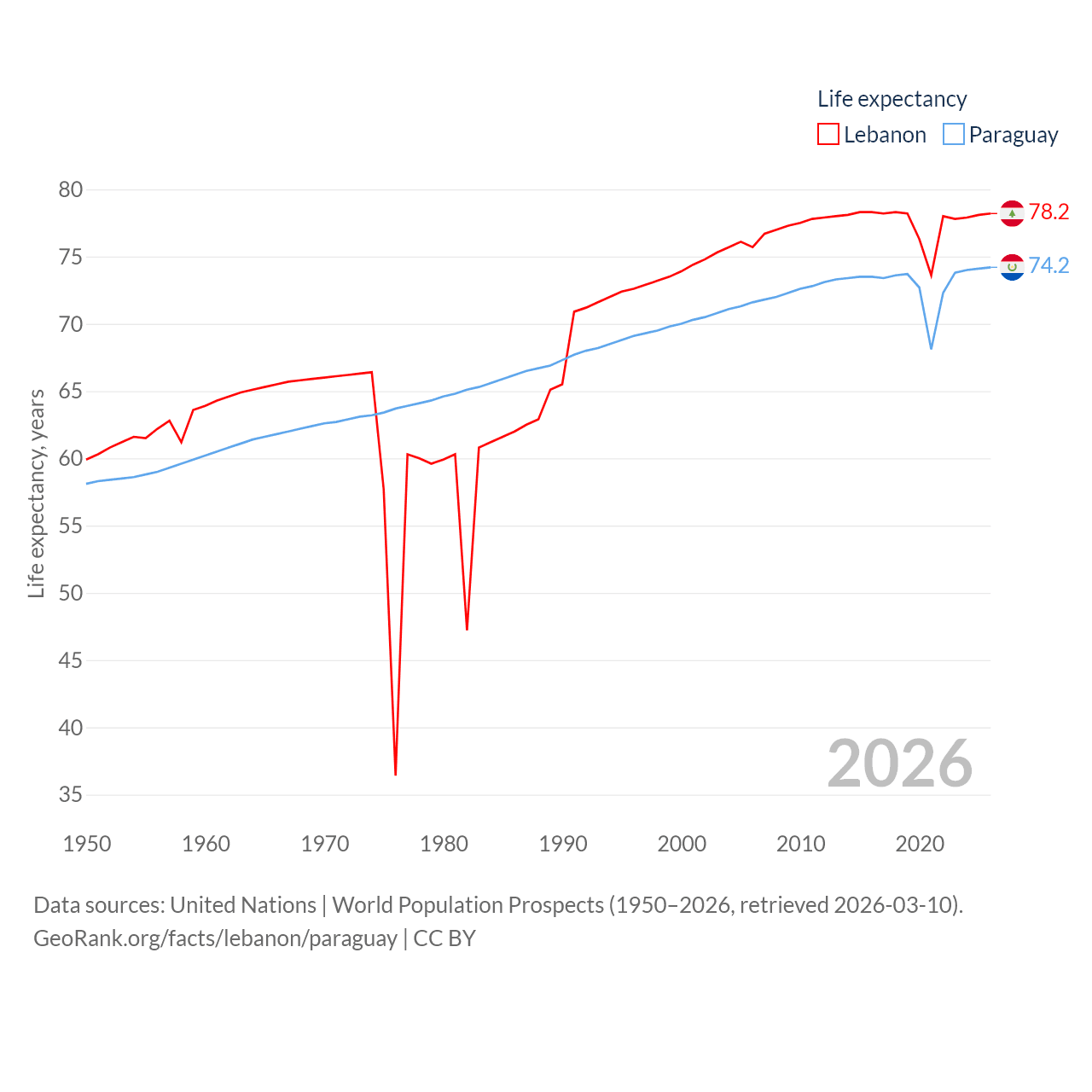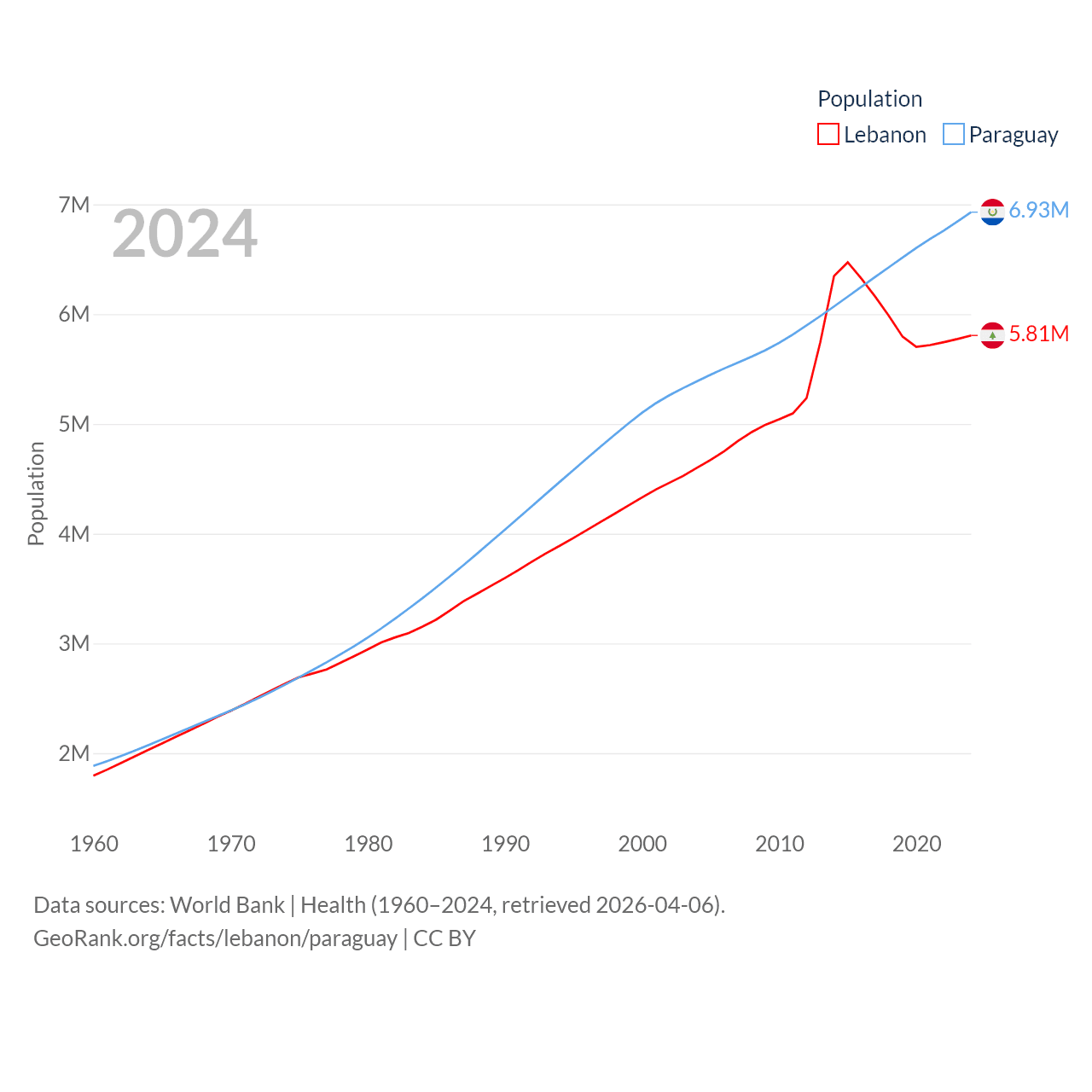 Lebanon has a population of 5.81M (ranked 115/197), compared with 6.93M in Paraguay (ranked 107/197). Lebanon's land area is 3,950 sq mi versus 152,901 sq mi for Paraguay (ranked 160th vs. 59th).