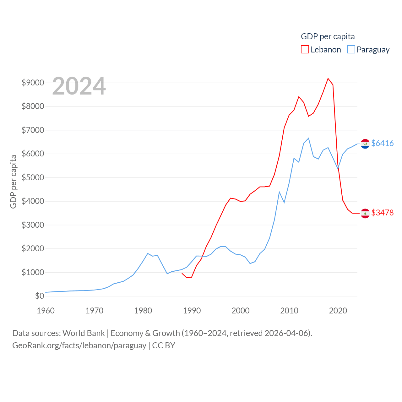 By GDP, Lebanon ranks 128/197 ($20.1B) and Paraguay ranks 98/197 ($44.5B). By GDP per capita, Lebanon ranks 135/197 ($3,478), while Paraguay ranks 109/197 ($6,416).