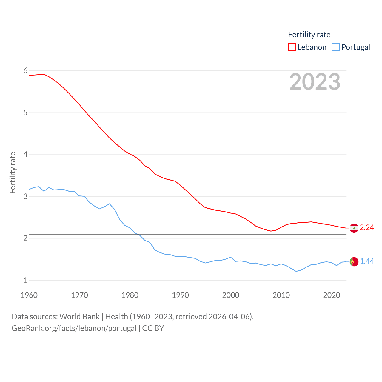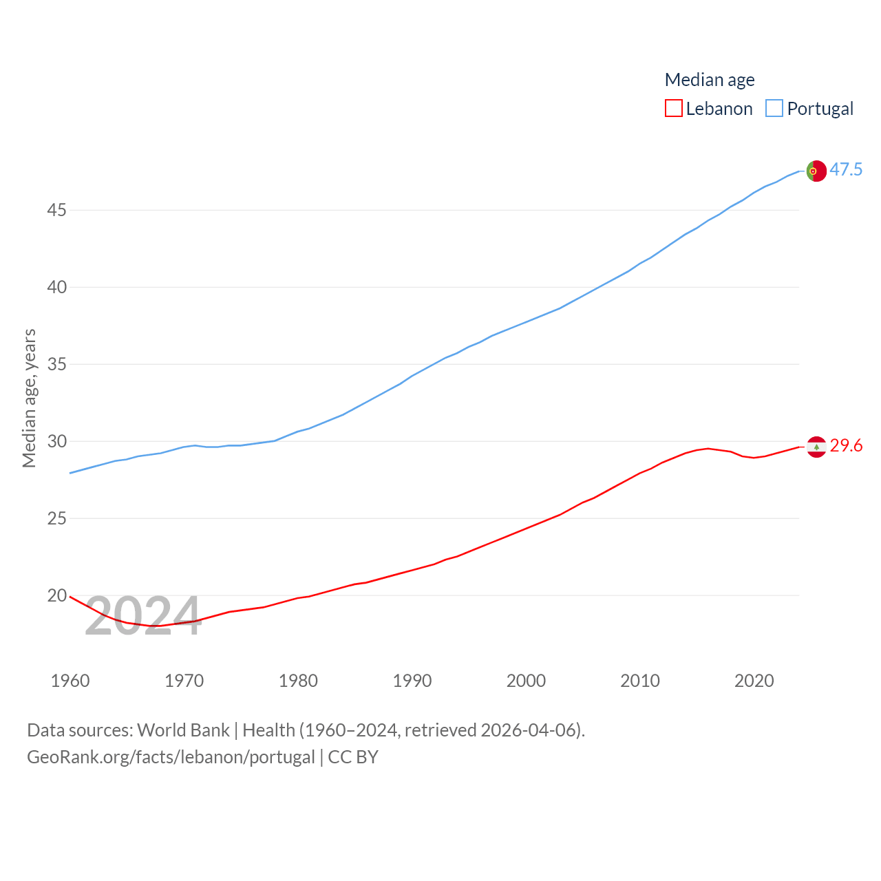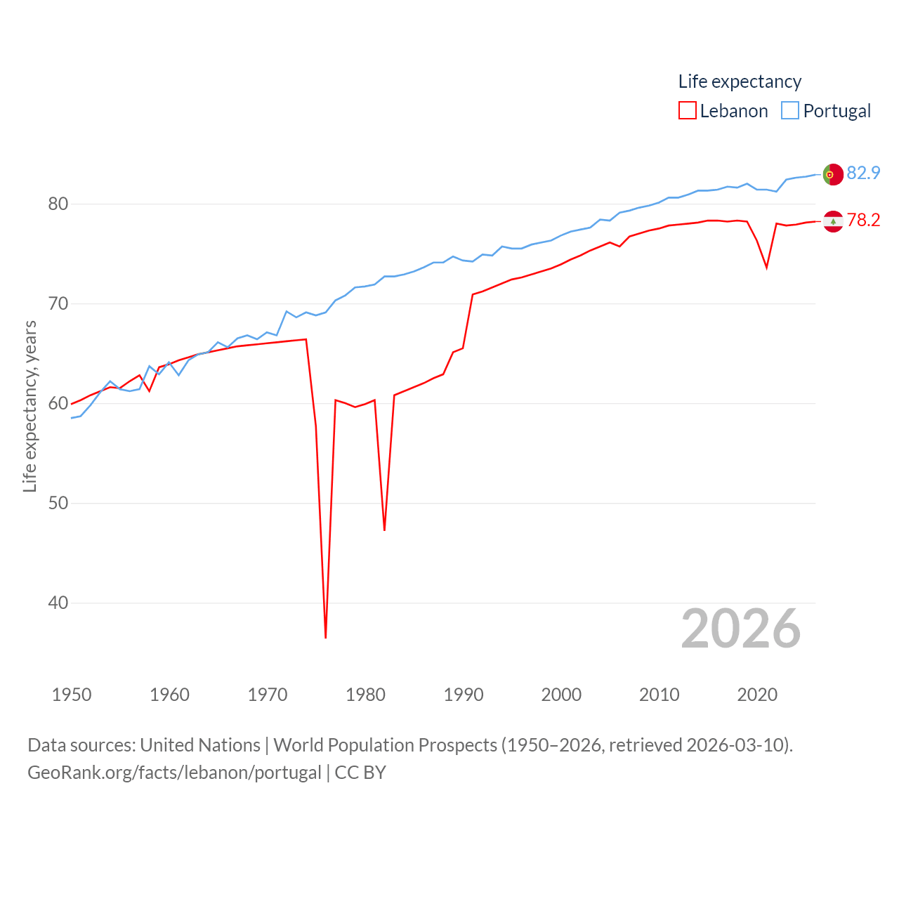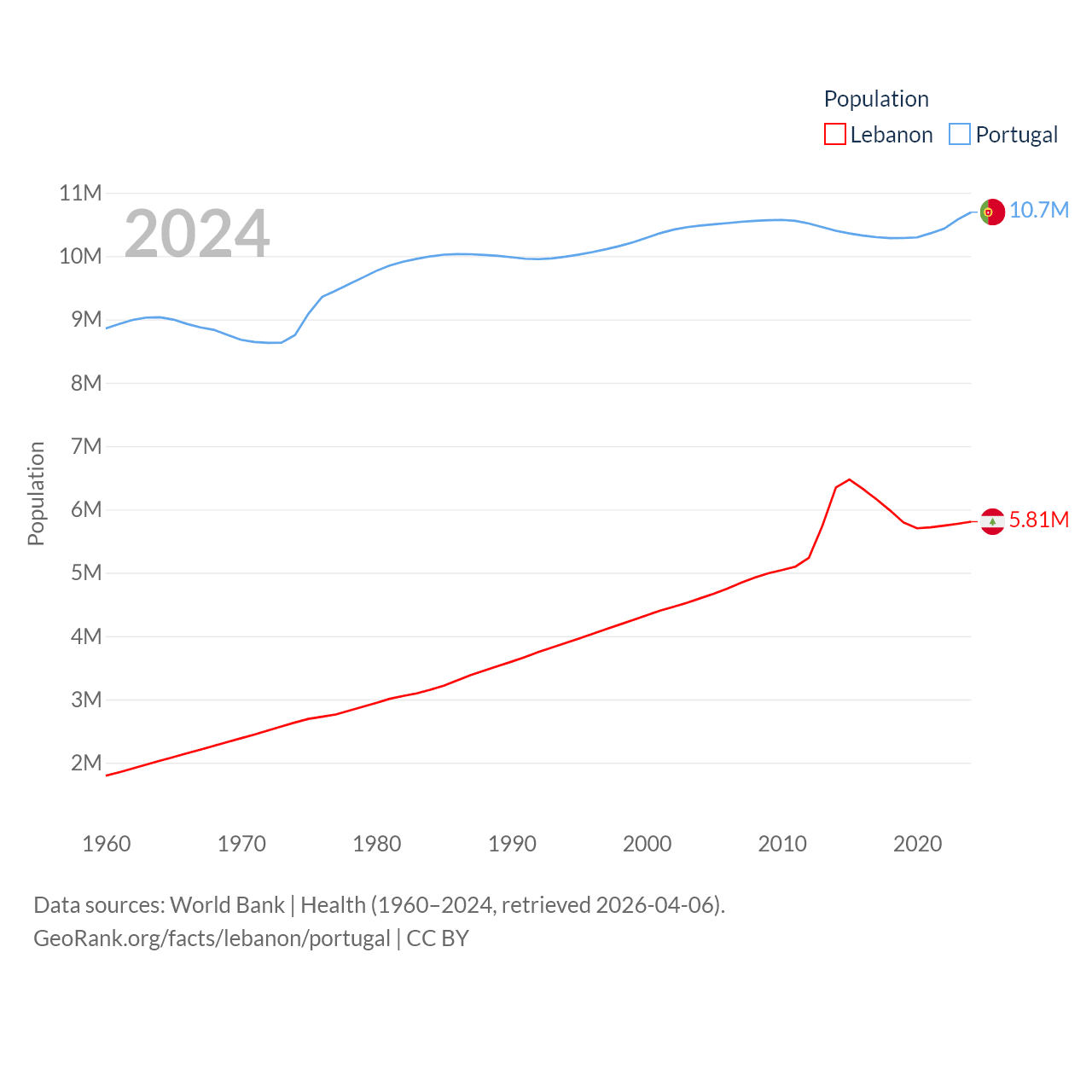 Lebanon has a population of 5.81M (ranked 115/197), compared with 10.7M in Portugal (ranked 90/197). Lebanon's land area is 3,950 sq mi versus 35,369 sq mi for Portugal (ranked 160th vs. 108th).