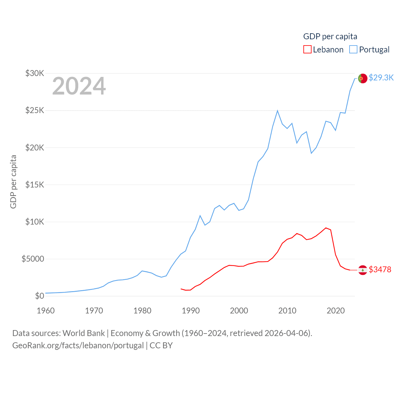 By GDP, Lebanon ranks 128/197 ($20.1B) and Portugal ranks 46/197 ($313B). By GDP per capita, Lebanon ranks 135/197 ($3,478), while Portugal ranks 44/197 ($29,292).