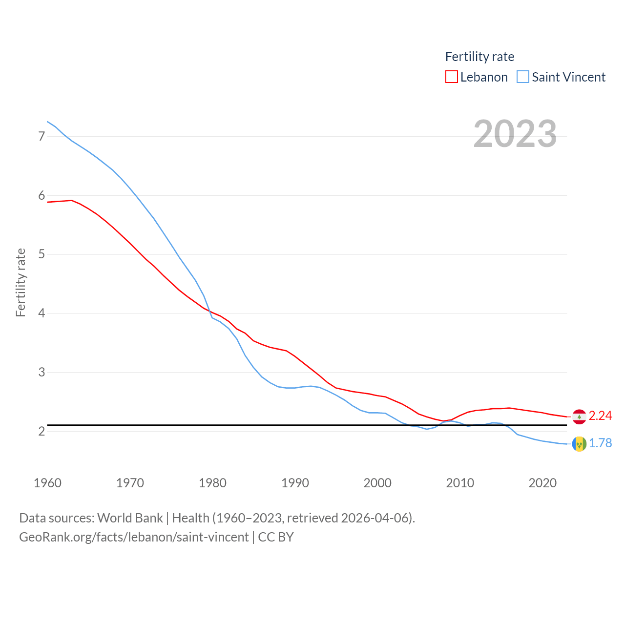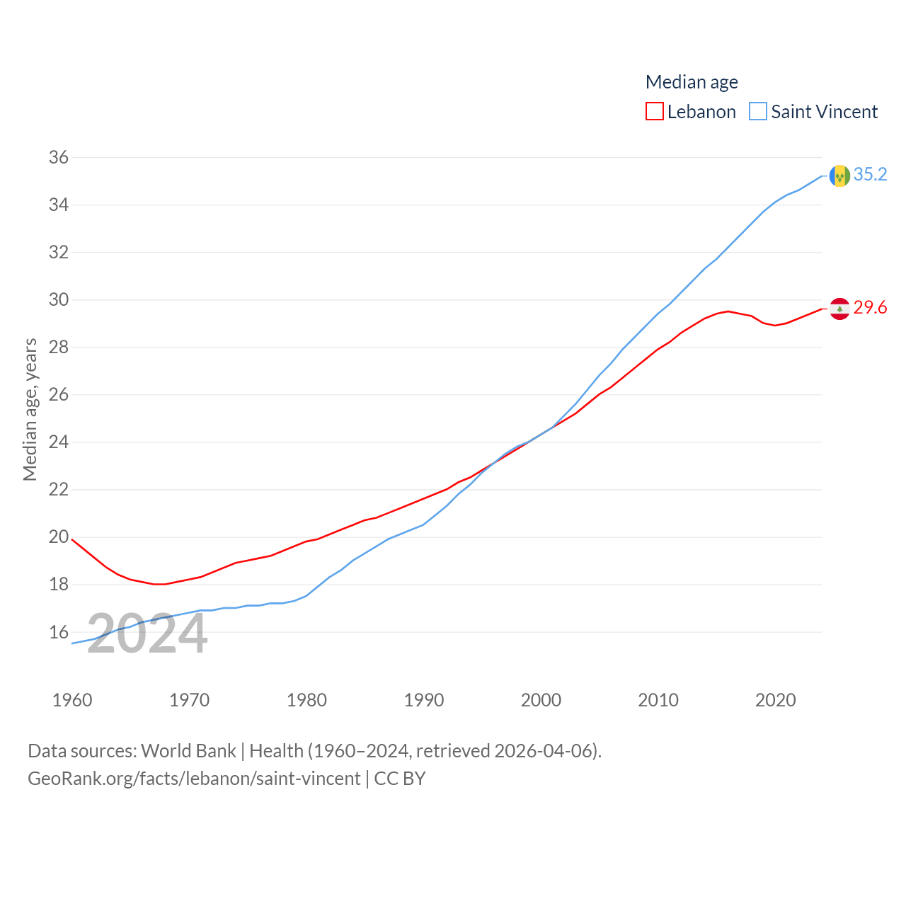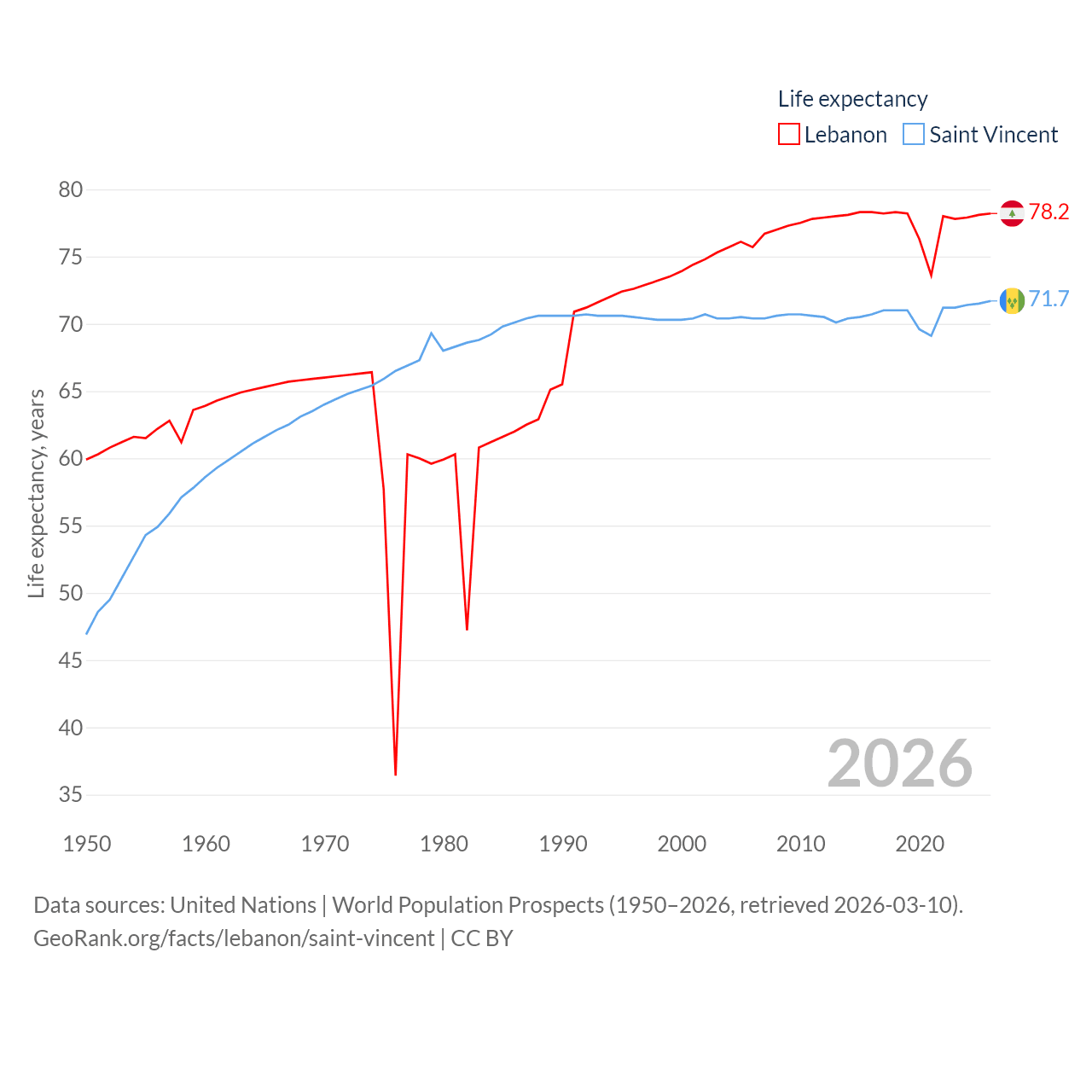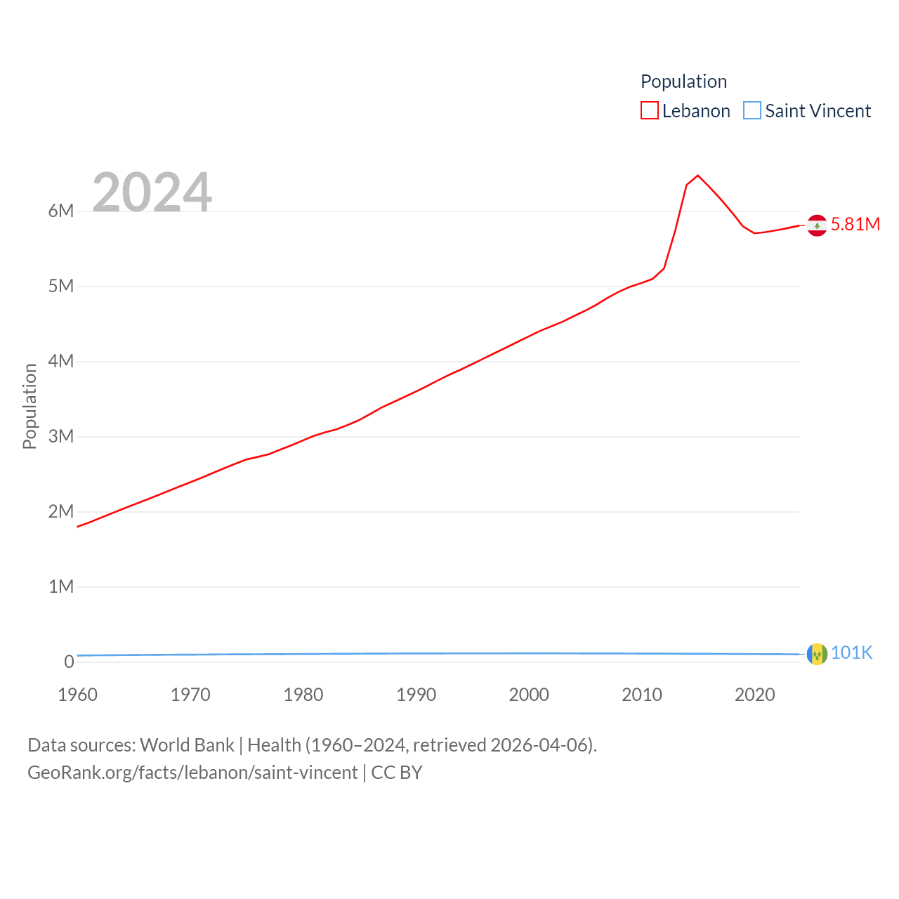 Lebanon has a population of 5.81M (ranked 115/197), compared with 101K in Saint Vincent (ranked 184/197). Lebanon's land area is 3,950 sq mi versus 150.6 sq mi for Saint Vincent (ranked 160th vs. 185th).