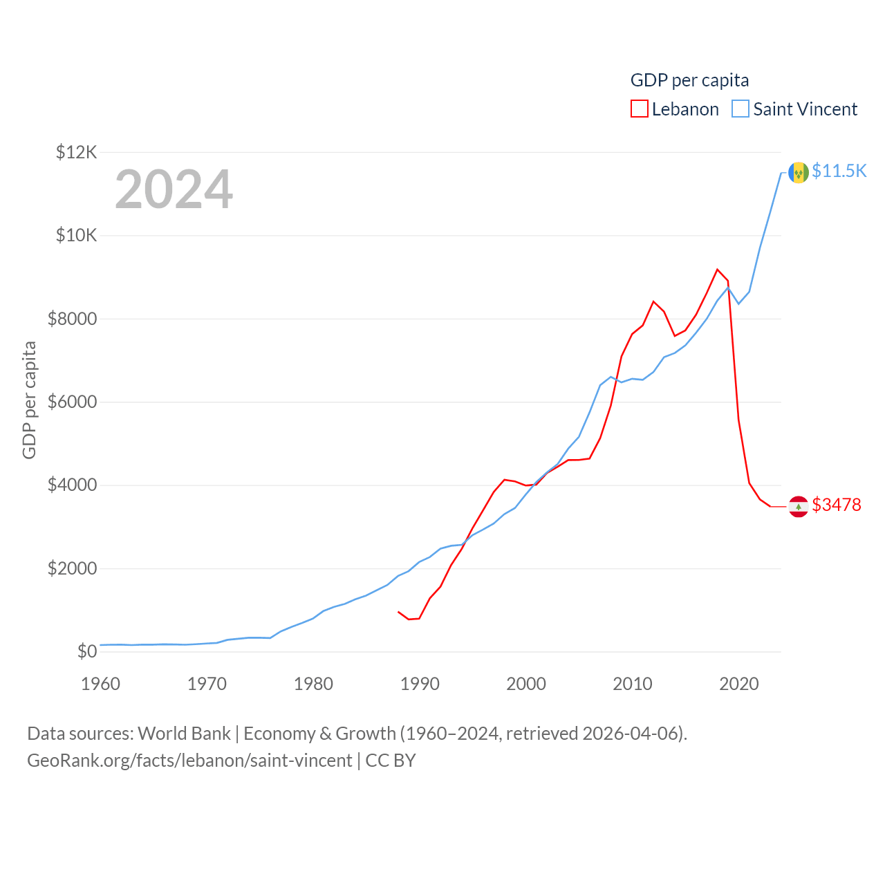 By GDP, Lebanon ranks 128/197 ($20.1B) and Saint Vincent ranks 186/197 ($1.16B). By GDP per capita, Lebanon ranks 135/197 ($3,478), while Saint Vincent ranks 81/197 ($11,501).