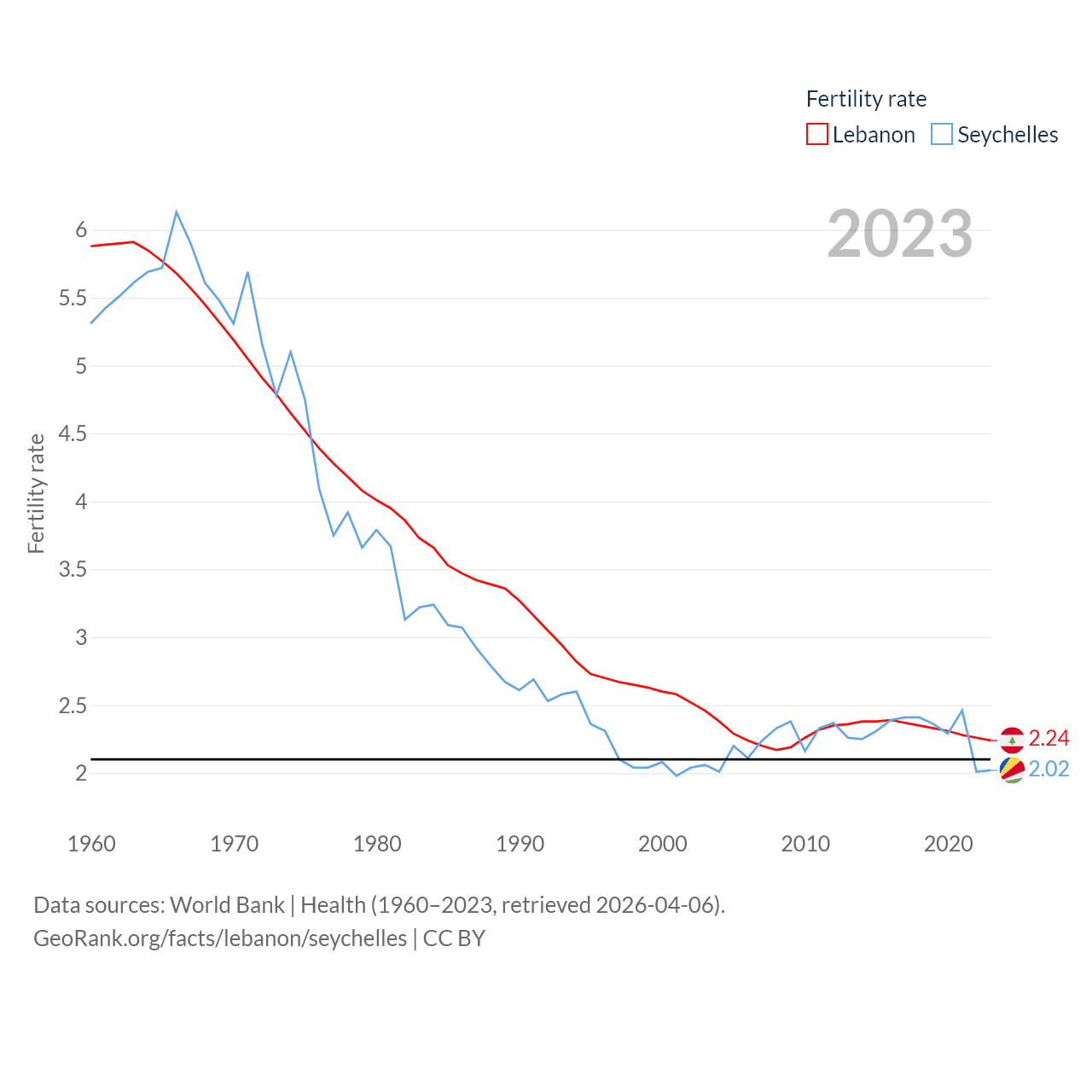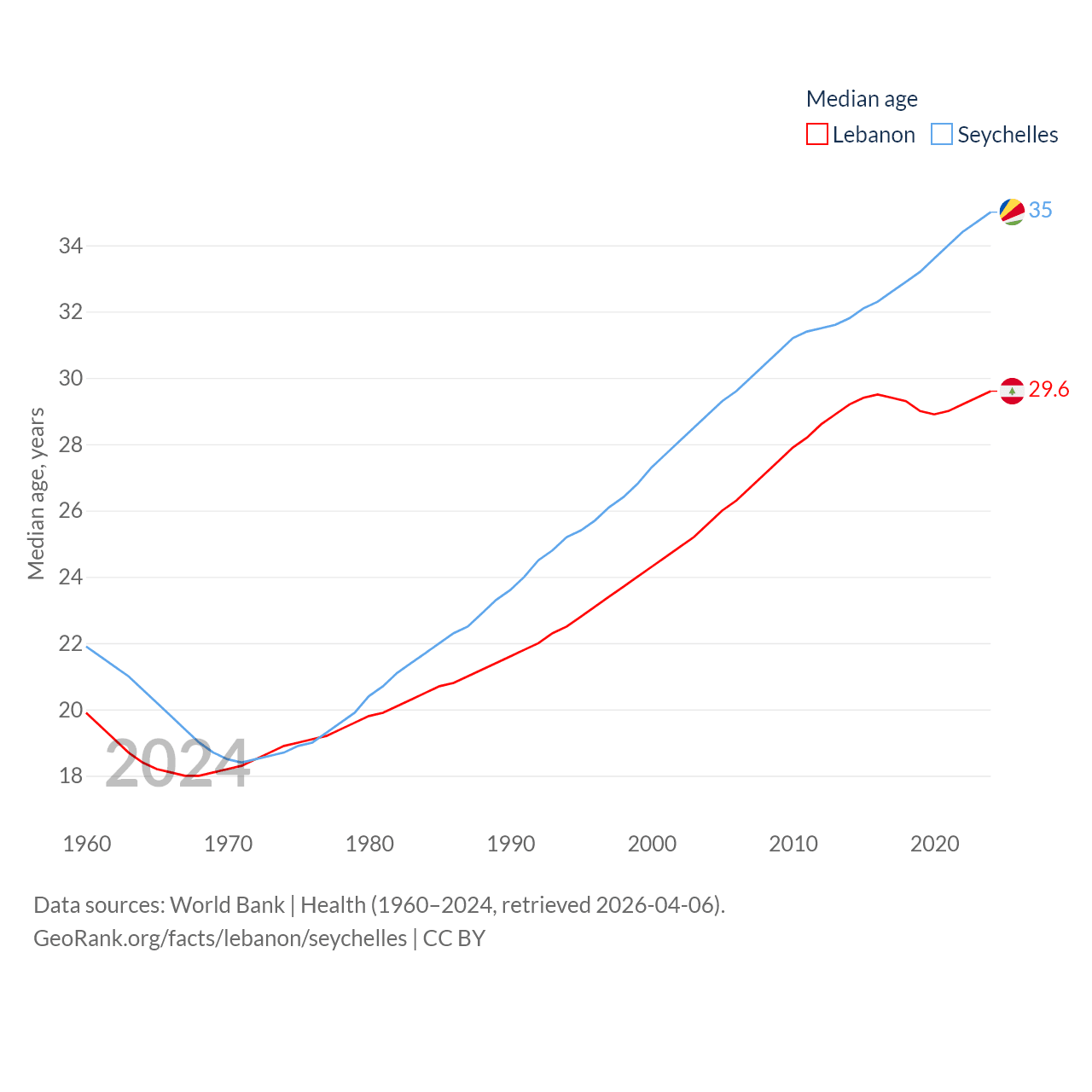Lebanon has a population of 5.81M (ranked 115/197), compared with 121K in The Seychelles (ranked 181/197). Lebanon's land area is 3,950 sq mi versus 177.6 sq mi for The Seychelles (ranked 160th vs. 181st).