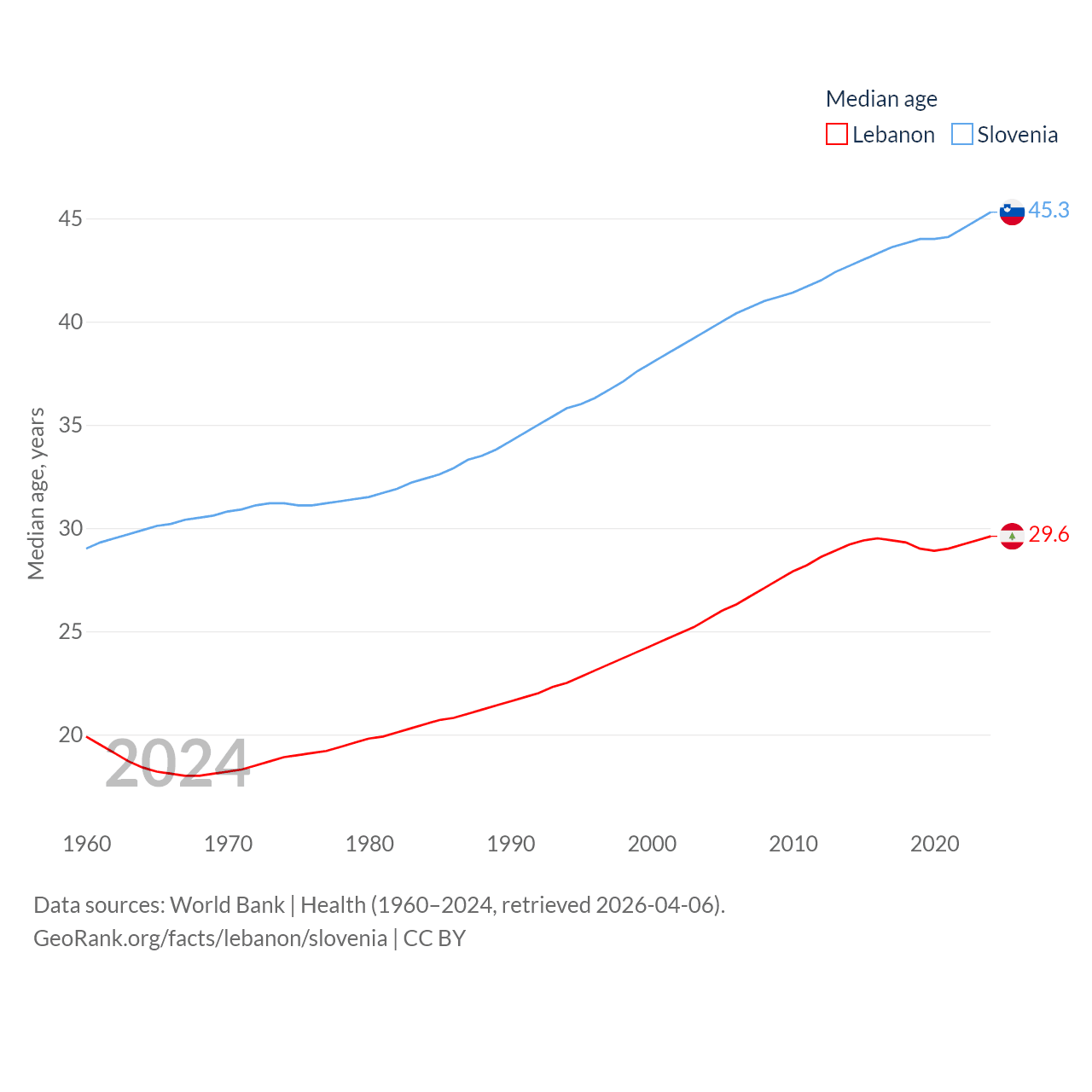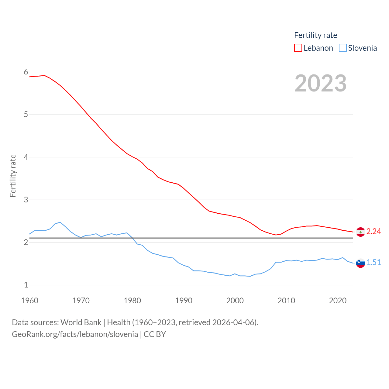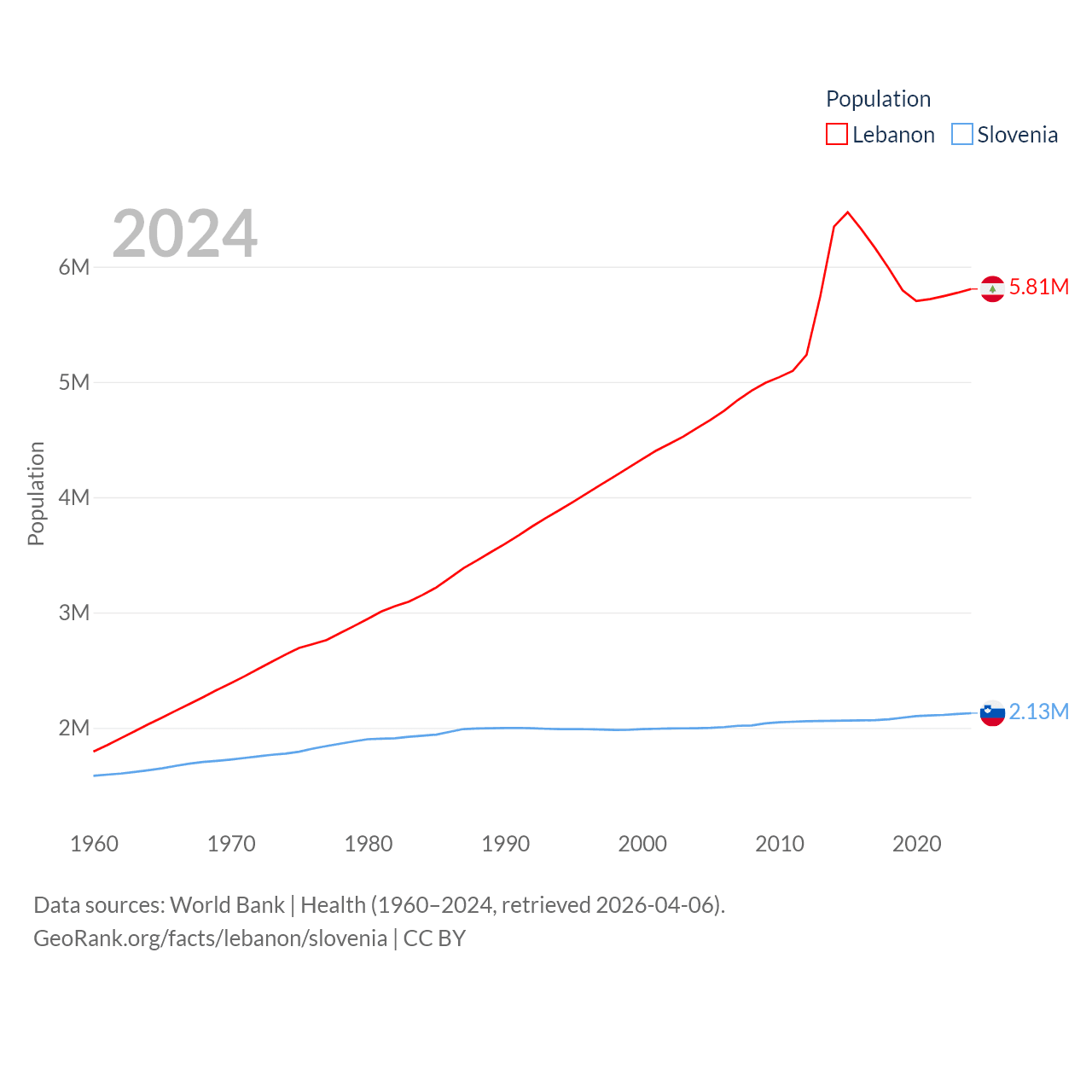 Lebanon has a population of 5.81M (ranked 115/197), compared with 2.13M in Slovenia (ranked 147/197). Lebanon's land area is 3,950 sq mi versus 7,774 sq mi for Slovenia (ranked 160th vs. 151st).