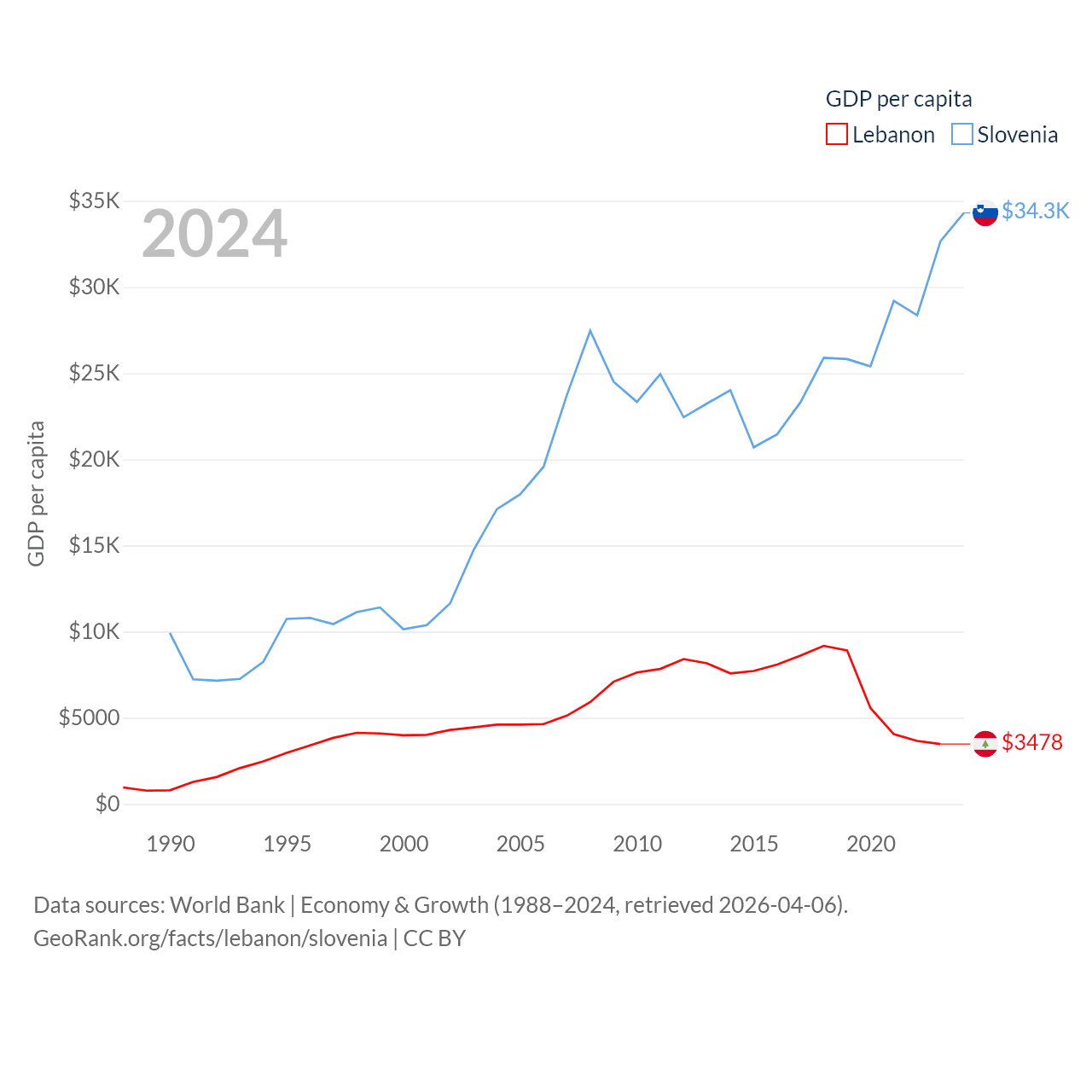 By GDP, Lebanon ranks 128/197 ($20.1B) and Slovenia ranks 86/197 ($73B). By GDP per capita, Lebanon ranks 135/197 ($3,478), while Slovenia ranks 34/197 ($34,301).