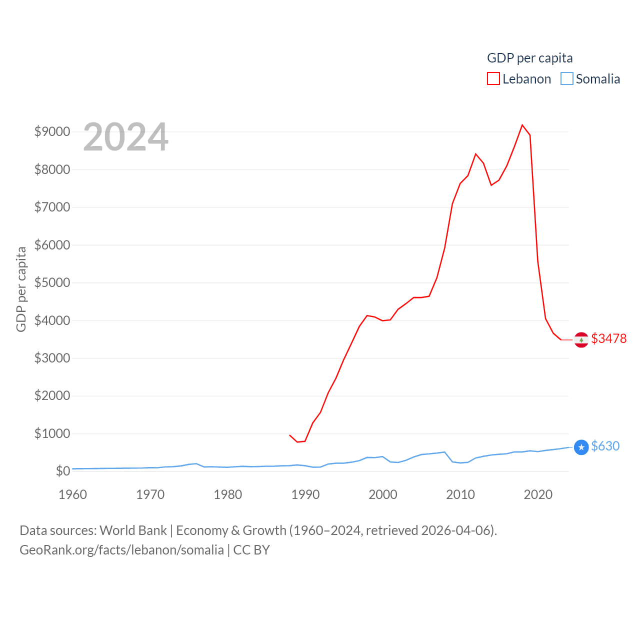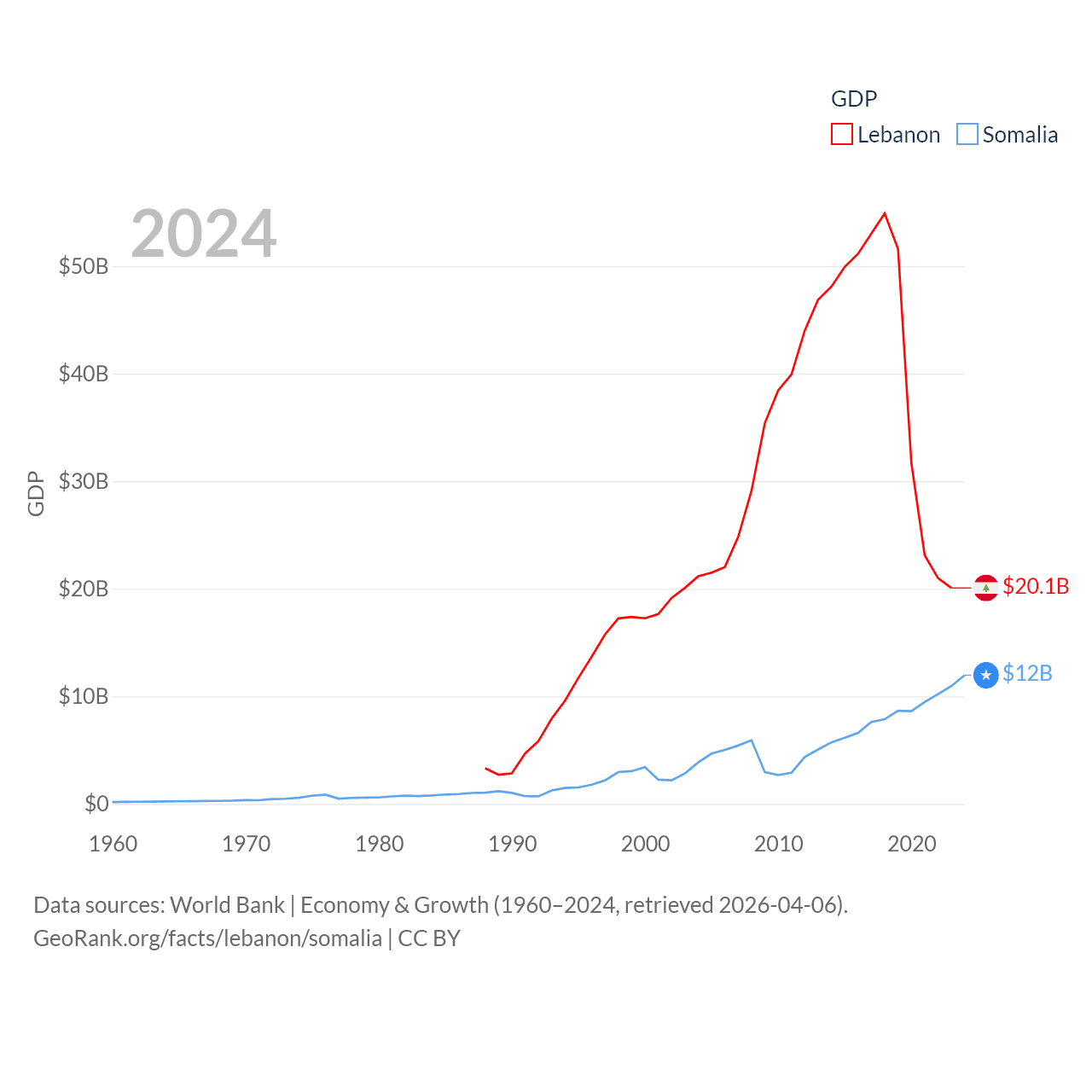 By GDP, Lebanon ranks 128/197 ($20.1B) and Somalia ranks 150/197 ($12B). By GDP per capita, Lebanon ranks 135/197 ($3,478), while Somalia ranks 192/197 ($630).