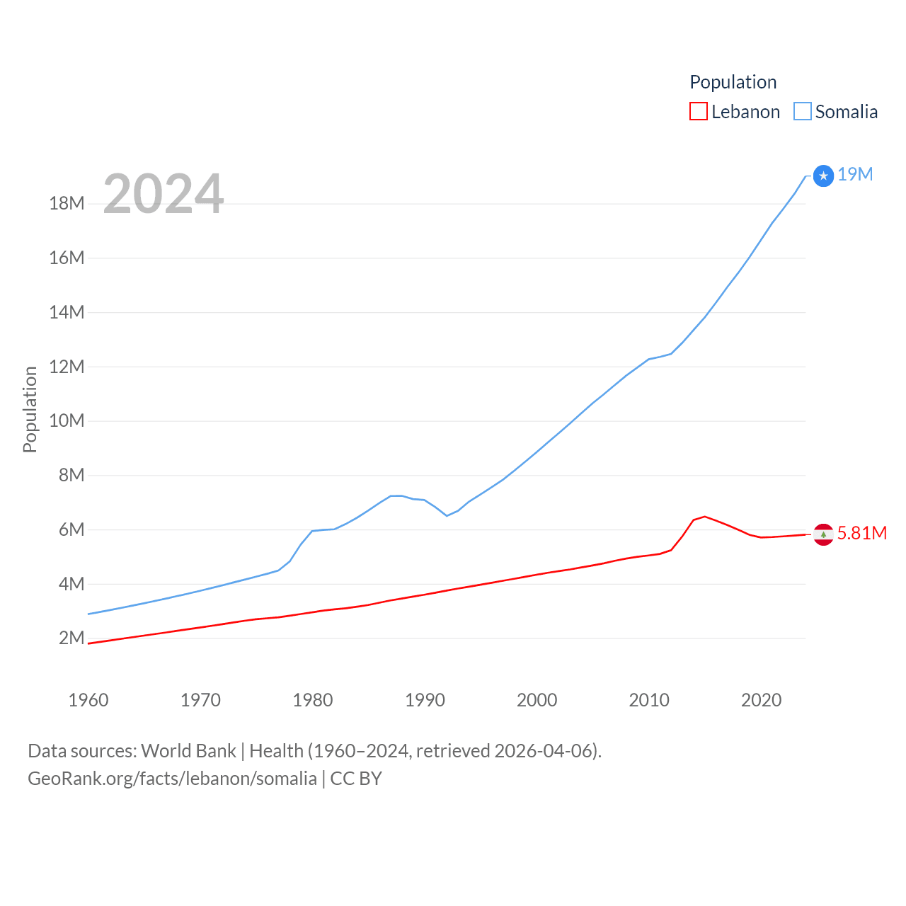 Lebanon has a population of 5.81M (ranked 115/197), compared with 19M in Somalia (ranked 68/197). Lebanon's land area is 3,950 sq mi versus 242,217 sq mi for Somalia (ranked 160th vs. 42nd).